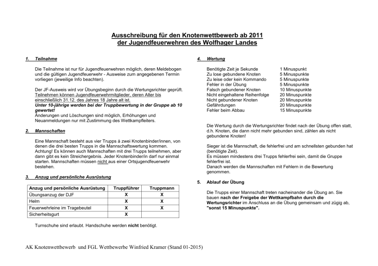 Ausschreibung für den Knotenwettbewerb ab 2011 der Jugendfeuerwehren des Wolfhager Landes 1. 4. Teilnahme Die Teilnahme ist nur für Jugendfeuerwehren möglich, deren Meldebogen und die gültigen Jugendfeuerwehr - Ausweise zum angegebenen Termin vorliegen (jeweilige Info beachten). Benötigte Zeit je Sekunde Zu lose gebundene Knoten Zu leise oder kein Kommando Fehler in der Übung Falsch gebundener Knoten Nicht eingehaltene Reihenfolge Nicht gebundener Knoten Gefährdungen Fehler beim Abbau Der JF-Ausweis wird vor Übungsbeginn durch die Wertungsrichter geprüft. Teilnehmen können Jugendfeuerwehrmitglieder, deren Alter bis einschließlich 31.12. des Jahres 18 Jahre alt ist. Unter 10-jährige werden bei der Truppbewertung in der Gruppe ab 10 gewertet! Änderungen und Löschungen sind möglich, Erhöhungen und Neuanmeldungen nur mit Zustimmung des Wettkampfleiters. 2. 1 Minuspunkt 5 Minuspunkte 5 Minuspunkte 5 Minuspunkte 10 Minuspunkte 20 Minuspunkte 20 Minuspunkte 20 Minuspunkte 15 Minuspunkte Die Wertung durch die Wertungsrichter findet nach der Übung offen statt, d.h. Knoten, die dann nicht mehr gebunden sind, zählen als nicht gebundene Knoten! Mannschaften Eine Mannschaft besteht aus vier Trupps á zwei Knotenbinder/innen, von denen die drei besten Trupps in die Mannschaftswertung kommen. Achtung! Es können auch Mannschaften mit drei Trupps teilnehmen, aber dann gibt es kein Streichergebnis. Jeder Knotenbinder/in darf nur einmal starten. Mannschaften müssen nicht aus einer Ortsjugendfeuerwehr bestehen. 3. Wertung Sieger ist die Mannschaft, die fehlerfrei und am schnellsten gebunden hat (benötigte Zeit). Es müssen mindestens drei Trupps fehlerfrei sein, damit die Gruppe fehlerfrei ist. Danach werden die Mannschaften mit Fehlern in die Bewertung genommen. Anzug und persönliche Ausrüstung 5. Anzug und persönliche Ausrüstung Übungsanzug der DJF Helm Feuerwehrleine im Tragebeutel Sicherheitsgurt Truppführer X X X X Truppmann X X X Turnschuhe sind erlaubt. Handschuhe werden nicht benötigt. AK Knotenwettbewerb und FGL Wettbewerbe Winfried Kramer (Stand 01-2015) Ablauf der Übung Die Trupps einer Mannschaft treten nacheinander die Übung an. Sie bauen nach der Freigebe der Wettkampfbahn durch die Wertungsrichter im Anschluss an die Übung gemeinsam und zügig ab, "sonst 15 Minuspunkte". 5.0 Beginn der Übung Vor Beginn der Übung wird die Position vom Truppführer und Truppmann ausgelost! Der Trupp tritt an der Startlinie an. Nach dem Kommando "Achtung - Fertig - Los" des Wertungsrichters läuft der Trupp zum Knotenbock. 5.1 Truppführer (TF) öffnet bereitgelegten Leinenbeutel und bindet Mastwurf und Spierenstich am linken waagrechten Ende des Knotenbocks. Anschließend wird der Leinenbeutel mit dem Kommando "Achtung Leine" in Richtung Startlinie ausgeworfen (Blickrichtung Wurfrichtung) Truppmann (TM) öffnet bereitgelegten Leinenbeutel und bindet Mastwurf und Spierenstich am rechten Knotenbockbein. Anschließend wird der Leinenbeutel mit dem Kommando "Achtung Leine" in Richtung Startlinie ausgeworfen (Blickrichtung Wurfrichtung) 5.2 TF begibt sich zum Strahlrohr und sichert es mit der ausgeworfenen Leine mit doppeltem Ankerstich und Halbschlag. TM begibt sich zur Feuerwehraxt und sichert sie mit der ausgeworfenen Leine mit doppeltem Ankerstich und Halbschlag AK Knotenwettbewerb und FGL Wettbewerbe Winfried Kramer (Stand 01-2015) Anschließend begibt sich der Trupp gemeinsam zum Knotenbock und bindet folgende Knoten: 5.3 TF Kreuzknoten TM Doppelter Achterknoten (die Knoten müssen verwendungsfähig sein) Nun begibt sich der Trupp gemeinsam bis hinter die Startlinie und führt die Menschenrettung durch: 5.4 TM übergibt dem TF seine mitgeführte Fw-Leine. Beim TM sichern (Pkt.5.4) muss bis hinter die Startlinie gegangen werden, sonst nicht einhalten der Reihenfolge!!! TF übernimmt Fw-Leine vom TM und sichert mit der übernommenen Leine den TM mit Pfahlstich und Spierenstich. Der Pfahlstich darf maximal 10 cm außermittig (Reisverschluss) liegen. (siehe Bild) AK Knotenwettbewerb und FGL Wettbewerbe Winfried Kramer (Stand 01-2015) Als nächstes begibt sich der TF zum Knotenbock und führt die Selbstrettung durch 5.5 TF befestigt die Leine mit Halbmastwurt an einer geschlossenen Fangöse des Sicherheitsgurtes. 5.6 anschließend befestigt der TF die Fw-Leine mit Mastwurf und Spierenstich in der Mitte des Knotenbocks. 5.7 Die Übung ist beendet, wenn der TF die Steuerleine mit ausgestrecktem Arm in der Hand hält, an der Markierung steht und "FERTIG" ruft. AK Knotenwettbewerb und FGL Wettbewerbe Winfried Kramer (Stand 01-2015) 6 Allgemeines • Während des Wettbewerbes ist es den Betreuern/innen nur nach Aufforderung der Wertungsrichter gestattet, die Bahn zu betreten. Betreuer und Nichtbinder/innen halten sich in der Wartezone auf und halten die JF - Ausweise zur Kontrolle bereit. • Die Siegerehrung wird in Dienstkleidung durchgeführt. Mannschaften, die bei der Siegerehrung nicht vertreten sind oder zur Siegerehrung nicht in Dienstkleidung antreten, werden aus der Wertung genommen. • Die Zeitnahme beginnt mit dem Wort LOS des Wertungsrichters und endet mit der Silbe "-tig" des Wortes "fertig" des TF. Leinen am Knotenbock dürfen nur von der Wettbewerbsleitung ausgetauscht werden. Feuerwehrleinen für Menschenrettung und Selbstrettung sind mitzubringen. Alle Leinen müssen im geschlossenen Tragebeutel sein und dürfen nicht sichtbar sein. • • Die Knotenbinder/innen eines Trupps können sich mündlich auf Fehler aufmerksam machen, die Fehler verbessern darf nur der Binder/in selbst. Die Bewertung erfolgt nach der Übung des Trupps offen. Während der gesamten Übung ist der Helm zu tragen. Verliert TF/TM den Helm, so muß dieser wieder aufgesetzt werden, bevor die Übung fortgesetzt wird. Neben der Fehlerbewertung erfolgt auch eine Bewertung des Gesamteindrucks der Mannschaft. Dieser beinhaltet auch die Betreuer der Mannschaft. Die Gesamt Eindruckspunkte sind keine Fehlerp