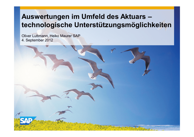 Auswertungen im Umfeld des Aktuars – technologische Unterstützungsmöglichkeiten Oliver Luttmann, Heiko Maurer SAP 4. September 2012 Anforderungen Ausgangslage Datenbasis für Auswertungen Weiterverwendung der Analyseergebnisse Rechtliche Regularien erfordern Auswertungen Fachlicher Kontext Jahresabschluss - externe Rechnungslegung - Bilanzpositionen (Deckungsrückstellung, Beitragsüberträge, …) GuV, insbesondere auf Produktgruppenebene - interne Rechnungslegung (Gewinnzerlegung u. ä.) Rechtliche Regularien / Marktanforderung - Solvency II ORSA - MaRisk - IFRS - Embedded Value Rechnungen - Profit Testing - Wert- und Risikoauswertungen zur nachhaltig wertorientierten Unternehmenssteuerung - © 2012 SAP AG. All rights reserved. 3 Auswertungen und –monitoring im Tagesgeschäft Fachlicher Kontext Bestandsauswertungen / Statistiken - Antragsstatistiken (Summen und Beiträge über Antrags- und Bestands-DB) - Vertriebsstatistiken (analog Antrag, zzgl. Provisionsdaten) Stornostatistiken - Schadenentwicklung /-erfahrung Bestandsmonitoring - Bestandszusammensetzung, z.B. Unisex / Abgleich Annahmen in den Rechnungsgrundlagen von Risiko und Kosten / Ursachenanalyse bei Abweichungen - Diverse Ad-hoc-Analysen bis auf Ebene Einzelvertrag (z.B. vertriebene Fonds, Geschlechter-Mix, Betrugserkennung) © 2012 SAP AG. All rights reserved. 4 Auswertungen zu Produkt- und Vertriebsmonitoring Fachlicher Kontext Produktcontrolling - Angemessenheit Rechnungsgrundlagen / Überschüsse - Struktur des Bestandes Qualität der Risikoprüfung - Vertriebssteuerung - Absatzkanaltracking - Deckungsbeitragsrechnung Profitabilitätsrechnung auf Produktebene - © 2012 SAP AG. All rights reserved. 5 Herausforderungen in der Datenbeschaffung Datenbasis für Auswertungen Heterogene operative Systeme - Diverse Datenbanken (Altsysteme, aktuelle Systeme, Sonderbestände) - Unterschiedliche Modelle, unterschiedliche Syntax, unterschiedliche Semantik Für übergreifende Auswertungen müssen die Daten (nachgelagert) zusammen geführt werden. - Joins über getrennte Datenbanken stellen oftmals organisatorische Schwierigkeiten dar (Bestand, Partner, Kontokorrent, Provision…). - DB-Abzüge für Ad-hoc-Auswertungen oftmals ohne Historie - Bereitstellung konsistenter Abzüge über mehrere Systeme erforderlich Restriktive Handhabung des Zugriffs auf operative Daten - Analysen auf Bestandsabzügen sind nicht immer ausreichend aktuell - Auswertungen auf der operativen Datenbank liegen intern in anderen Organisationseinheiten © 2012 SAP AG. All rights reserved. 6 Herausforderungen in der Datenbeschaffung Von den Quelldaten zu deren Auswertung Reports Analyse Aktuarielle Weiterverarbeitung z.B. Prophet Neue Datenhaltung Zusammenführung und Veränderung Filesysteme Quellsysteme © 2012 SAP AG. All rights reserved. 7 Herausforderungen in der Datenbeschaffung Risiken • Veränderte bzw. manipulierte Daten • Unterschiedliche Datenstände • Getrennte Haltung operativer und dispositiver Daten • Systembrüche in der Datenverarbeitung, d.h. keine unterbrechungsfreien Prozesse • Fehlende Detailinformationen als Folge von Aggregationen © 2012 SAP AG. All rights reserved. 8 Herausforderungen in der Datenbeschaffung Anforderungen an zukünftige Analysewerkzeuge Bestehende Quellsysteme im permanenten Zugriff Durchgriff von kumulierten auf die granulare Datenebene Unterbrechungsfreie und dokumentierte Prozesse © 2012 SAP AG. All rights reserved. 9 Technologische Unterstützungsmöglichkeiten Überblick Systemdemo In-Memory Computing In-Memory Computing ermöglicht die Verarbeitung sehr großer Datenmengen in Echtzeit im Hauptspeicher des Servers, sodass Ergebnisse aus Analysen und Transaktionen sofort zur Verfügung stehen. © 2012 SAP AG. All rights reserved. 11 Der Wendepunkt: In-Memory Computing Heute Morgen Hardware Software Partitionierung Multicore-Architektur Arbeitsspeicher In-Memory Keine aggregierten Tabellen 64-Bit-Adressraum Bis zu 2 TB Hauptspeicher Datendurchsatz von 100 GB/s Cache + + ++ Hochgradige Parallelisierung / Skalierung Festplatte Kompression Flash Massive Verbesserungen bei Preis und Performance © 2012 SAP AG. All rights reserved. Einfügen nur bei Delta + Zeilen- und Spaltenspeicher 12 Zentrale Komponenten und Funktionen von SAP HANATM SAP BusinessObjects Werkzeuge Andere Abfragewerkzeuge SAP HANA SAP In-Memory Computing Studio SAP In-Memory Datenbank Berechnungs- und Planungsengine Datenreplikation in Echtzeit SAP Business Suite © 2012 SAP AG. All rights reserved. Zeilen- und Spaltenorientierung SAP BusinessObjects Data Services SAP NetWeaver Business Warehouse Andere Datenquellen 13 Einsatzszenario: Technologie Technologische Reporting-Basis Kunden setzen die In-Memory-Technologie zur Umsetzung ihrer eigenen Anwendungsszenarien ein: Die Funktionen der In-Memory-Datenbank bilden die Grundlage für kundenspezifische Implementierungen. BICS Drittanbieter MDX SQL BI-Clients Datenmodellierung Computing Engine Eigene oder externe Daten werden in die In-MemoryDatenbank geschrieben. Entweder wird eine eigene Anwendungslogik hinzugefügt oder es werden eigene Analysemodelle aufgesetzt. Liefert Antworten auf kundenspezifische Fragen in Kernbereichen des Unternehmens Beispiele: Adobe: http://www.sap.com/demos/richmedia/media/adobe-hana-customertestimonial-video.epx Drittanbieter Datenquelle NRI: http://www.sap.com/demos/richmedia/media/nri-hana-customertestimonial-video.epx ETL / SLT SAP HANA © 2012 SAP AG. All rights reserved. 14 Demo Vielen Dank! Oliver Luttmann Heiko Maurer SAP Deutschland AG & Co. KG F + 49 / 6227 - 757410 M + +49 / 173 3090335 E: [email protected] SAP Deutschland AG & Co. KG F + 49 / 6227 - 752855 M + 49 / 171 5591 957 E: [email protected] © 2012 SAP AG. Alle Rechte vorbehalten. Weitergabe und Vervielfältigung dieser Publikation oder von Teilen daraus sind, zu welchem Zweck und in welcher Form auch immer, ohne die ausdrückliche schriftliche Genehmigung durch SAP AG nicht gestattet. In die