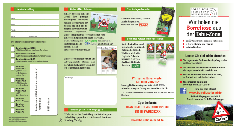 Literaturbestellung Kinder, KITAs, Schulen Name Straße PLZ/Ort Unterschrift Datum Ich bestelle hiermit die angekreuzte Literatur: Stück Borreliose Wissen BASIS 9,50 1 Basis-Wissen über Lyme-Borreliose Kinder bewegen sich auf Grund ihrer geringen Körpergröße besonders nah am Lebensraum der Zecken. Sie sind auf die Sorgfalt ihrer Eltern und Erzieher angewiesen. Unser kindgerechtes Vorleseheftchen und ein Poster mit gemalten Bildern klären auf. Dank Förderung der können wir sie kostenlos an KITAs und Schulen versenden. E-Mail: [email protected] Borreliose Wissen Nr. 33 9,50 1 Borreliose und Autoimmunerkrankungen Borreliose Wissen Nr. 30 9,50 1 Borreliose und das Herz Borreliose Wissen Nr. 29 7,50 1 Neuroborreliose Borreliose Wissen Nr. ____ Borreliose Wissen Nr. ____ Borreliose Wissen Nr. ____ Alle genannten Preise verstehen sich inkl. 7% Mehrwertsteuer, zuzüglich 2,50 1 Versandkosten. Unsere Spezialausgabe rund um Schwangerschaft, Stillzeit und Borreliose bei Kindern versenden wir gegen freiwillige Spende. SHG-Stempel Kostenlos für Vereine, Schulen, Ausbildungsstätten. Gefördert von der Borreliose-Wissen in Fremdsprachen Kostenlos im Download in Arabisch, Französisch, Italienisch, Russisch, Türkisch; als Text in Englisch, Polnisch, Spanisch. Als Flyer: Arabisch, Türkisch, Russisch. Wir helfen Ihnen weiter: Tel. 0180 500 6935* Montag bis Donnerstag von 10.00 bis 12.30 Uhr Abendberatung am Freitag von 18.00 bis 20.00 Uhr * 14 Cent/Min. aus dem deutschen Festnetz, max. 42 Cent/Min. aus dem Mobilnetz 64834 Münster Borreliose Wissen Nr. 31 9,90 1 Borreliose-Behandlung und der Darm Borreliose und FSME Bund Deutschland e.V. Postfach 1205 Borreliose Wissen Nr. 32 9,50 1 Borreliose und Selbstheilungskräfte Flyer in Jugendsprache Förderung von Selbsthilfegruppen Wir helfen bei der Entwicklung und Gründung von Selbsthilfegruppen durch Info-Material, Seminare, Schulung, Vorträge. Spendenkonto: IBAN DE48 370 205 00000 1120 200 BIC BFSWDE 33XXX www.borreliose-bund.de Wir holen die Borreliose aus der Tabu-Zone ■ bei Ärzten, Krankenkassen, Politikern ■ in Beruf, Schule und Familie ■ bei den Medien Lassen Sie sich nicht täuschen ■ Die sogenannte Zeckenschutzimpfung schützt nicht vor Borreliose ■ Ein positiver Test beweist keine Borreliose, ein negativer schließt sie nicht aus ■ Zecken sind überall: im Garten, im Park, im Freibad und in Urlaubsländern ■ Zeckenzeit ist ganzjährig zwischen 8 und 22 ° Celsius. Hilfe aus dem Internet www.borreliose-bund.de Selbsthilfegruppen nach PLZ Kontaktformular für E-Mail-Anfragen FSME (Frühsommer-Meningo-Enzephalitis) ist ein Virus, das zum Teil lebensgefährliche Hirnhautentzündung auslöst. Dagegen gibt es keine Therapie. Man kann sich impfen lassen. FSME gibt es nur in bestimmten geografischen Gebieten. Borreliose Borreliose (auch Lyme-Borreliose) ist die häufigste von Zecken übertragene Krankheit. Schätzungen reichen von 100.000 bis 800.000 Neuerkrankungen pro Jahr in Deutschland. Borrelien sind Bakterien. Dagegen gibt es keine Impfung, jedoch wirksame Medikamente. Antibiotika. Die Heilungschance liegt in der Frühphase bei bis zu 90 Prozent. Bleibt Borreliose lange unentdeckt, sind Heilung oder Besserung der Beschwerden eine Geduldssache und nicht immer gewährleistet. Woran erkennt man eine Borreliose? Wenn sich Tage oder Wochen nach dem Zeckenstich eine nach außen wachsende Rötung (Wanderröte) von mehr als fünf Zentimetern Durchmesser bildet, ist das der Beweis für eine Infektion. Dann muss unverzüglich mit der Einnahme von Antibiotika begonnen werden. Ein Bluttest ist überflüssig, weil sich Antikörper erst drei bis sechs Wochen nach einer Infektion bilden. Borrelien findet man im Blut nicht; nur Antikörper. Sie können auch von einer früheren Infektion stammen und haben keinen Aussagewert für eine frische Infektion. Wanderröte am Bein einseitige Gelenkschwellung meist halbrunde bis kugelige, oft bläuliche bis rötliche Schwellung Mitglied werden Wer ist der Borreliose und FSME Bund Deutschland e.V. Hautentzündung des späten Stadiums Achtung: Nur circa 50 Prozent aller Infizierten bilden die Wanderröte aus. Auch ohne Wanderröte kann eine Infektion stattgefunden haben. Man merkt das an einem Krankheitsgefühl wie bei einer beginnenden Grippe, zum Beispiel Abgeschlagenheit, Glieder- und Muskelschmerzen, Nackensteife. Noch nicht sprechende Kinder reagieren meist mit einer Wesensveränderung, mit Schonhaltung und Müdigkeit. Mehr Info: www.borreliose-bund.de Häufige Symptome Die Vielfalt der Symptome ist verwirrend für Arzt und Patient. Die häufigsten betreffen Knie, Hüft-, Schultergelenk, Nachtschweiß, Muskeln, einschießende Schmerzen, Sehund Hörstörungen. Betroffene klagen über Sprech- und Denkstörungen, kognitive Fehlleistungen, Schwindel, Taubheits- und Kribbelgefühle, Hautbrennen und depressive Anwandlungen. Eine Liste der bekannten Symptome findet sich in der Zeitschrift BORRELIOSE WISSEN BASIS. Bestellbar über die Homepage www.borreliose-bund.de Die heutige Patientenorganisation ging hervor aus dem 1994 in Hamburg gegründeten Lyme-Borreliose Bund. Ihm angeschlossen ist der größte Teil der BorrelioseSelbsthilfegruppen sowie mehr als 1500 Einzelmitglieder und Förderer. Alle großen Krankenkassen anerkennen, wertschätzen und fördern unsere Arbeit. Die Herstellung dieses Flyers förderte die Name(n) Jahrgang Beruf Straße PLZ/Ort Vorteile als Mitglied Telefon Mitglieder erhalten die Zeitschriften Borreliose Wissen (April und Oktober) mit dem Neusten aus Diagnostik, Therapie, Forschung gratis, den monatlichen Newsletter, eine kostenlose VdK-Erstberatung, Beratung auch außerhalb der Beratungszeiten, auch zu Gutachtern, Anwälten, Ärzten. Werden Sie Mitglied. Eine starke Patientenlobby hilft allen Betroffenen. Was tut der Borreliose und FSME Bund Deutschland e.V. E-Mail* IBAN Datum Bank Unterschrift Ich bin einverstanden, dass diese Daten ausschließlich zur satzungsgemäßen Vereins