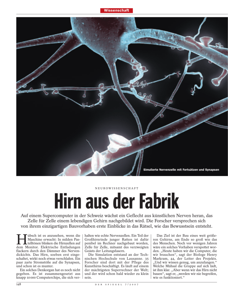 Wissenschaft Simulierte Nervenzelle mit Fortsätzen und Synapsen N EUROWISSENSCHAFT Hirn aus der Fabrik Auf einem Supercomputer in der Schweiz wächst ein Geflecht aus künstlichen Nerven heran, das Zelle für Zelle einem lebendigen Gehirn nachgebildet wird. Die Forscher versprechen sich von ihrem einzigartigen Bauvorhaben erste Einblicke in das Rätsel, wie das Bewusstsein entsteht. H übsch ist es anzusehen, wenn die Maschine erwacht: In milden Pastelltönen blinken die Hirnzellen auf dem Monitor. Elektrische Entladungen flackern durch den Dämmer des Nervendickichts. Das Hirn, soeben erst eingeschaltet, wirkt noch etwas verschlafen. Ein paar zarte Stromstöße auf die Synapsen, und schon ist es munter. Ein solches Denkorgan hat es noch nicht gegeben. Es ist zusammengesetzt aus knapp 10 000 Computerchips, die sich ver148 halten wie echte Nervenzellen. Ein Teil der Großhirnrinde junger Ratten ist dafür penibel im Rechner nachgebaut worden, Zelle für Zelle, mitsamt des verzweigten Geästs der Leitungsfasern. Die Simulation entstand an der Technischen Hochschule von Lausanne. 35 Forscher sind dort mit der Pflege des Kunsthirns beschäftigt. Es läuft auf einem der mächtigsten Superrechner der Welt; und der wird schon bald wieder zu klein sein. d e r s p i e g e l 7 / 2 0 0 7 Das Ziel ist der Bau eines weit größeren Gehirns, am Ende so groß wie das des Menschen. Noch vor wenigen Jahren wäre ein solches Vorhaben verspottet worden. „Heute haben wir die Computer, die wir brauchen“, sagt der Biologe Henry Markram, 44, der Leiter des Projekts. „Und wir wissen genug, um anzufangen.“ Welche Mühsal die Gruppe auf sich lädt, ist ihm klar. „Aber wenn wir das Hirn nicht bauen“, sagt er, „werden wir nie begreifen, wie es funktioniert.“ Baustelle des Geistes Wie der Supercomputer „Blue Brain“ ein Gehirn simuliert Das Gehirn wird möglichst detailgetreu im Computer nachgebaut, angefangen mit 10000 Nervenzellen der Großhirnrinde. Die Aktivitäten lebender Hirnzellen von Ratten dienten als Vorbild. Sämtliche Zellen mitsamt ihren vielfältigen Verzweigungen werden mit Schaltkreisen nachgebildet. EPFL Hirnzellen Derzeit ist in der Regel ein ganzer Prozessor nötig, um eine einzige Hirnzelle zu simulieren. Der Computer besteht bisher aus knapp 10 000 dieser Chips. EPFL In der nächsten Ausbaustufe ab Anfang 2008 soll ein schnellerer Supercomputer ein ganzes Rattengehirn, bestehend aus 100 Millionen Zellen und 100 Milliarden Synapsen, simulieren. In der Tat stürmt die Hirnforschung seit Jahren weltweit von Erfolg zu Erfolg, aber die großen Fragen sind einer Antwort so fern wie je: Wie entsteht das Bewusstsein im elektrischen Orchester der Zellen, die jede für sich besinnungslos vor sich hinfeuern? Wie kann es sein, dass im Zusammenspiel der Gene, Proteine und Botenstoffe ganz von selbst der Geistesfunke zündet? Das Hirn von Lausanne, genannt „Blue Brain“, ist der bislang radikalste Versuch, dem Rätsel des Bewusstseins auf den Grund zu gehen. Die Idee dahinter ist verführerisch einfach: Wer sehen wolle, wie der Geist aus der Biologie entspringt, müsse diese Biologie eben nachbauen – und zwar mit eiserner Geduld – bis ins Detail, ja letzten Endes Molekül für Molekül. Mag das erste Kunsthirn auch noch vergleichsweise simpel ausfallen, so ist es doch schon ein nützliches Modell. Was immer die Hirnforscher künftig lernen über die Funktion des Denkorgans – hier lässt es sich gleich einbauen und ausprobieren. Die Simulation gewinnt so stetig an Detail- treue. Und sie hat einen entscheidenden Vorzug vor dem Original: Stets können die Forscher nach Belieben verfolgen, was sich in der Maschine gerade regt. Und regt sich schon was? Das neugeborene „Blue Brain“ überraschte seine Erbauer vom ersten Tag an mit Eigensinn. Kaum wurde es mit elektrischen Reizen gefüttert, zeigten sich am Bildschirm seltsame Muster im Wetterleuchten der Zellen, wie sie auch von wirklichen Denkvorgängen bekannt sind. Gruppen von Neuronen begannen spontan, sich aufeinander einzustimmen, bis sie in einem gemeinsamen Rhythmus feuerten. „Das ging ganz von selbst“, sagt Markram, „und auf Anhieb.“ 10 000 künstliche Nervenzellen sind in Lausanne inzwischen zusammengeschaltet; im nächsten Jahr werden schon 100 Millionen angepeilt. Zufrieden sind die Forscher auch damit nicht. Die Pläne reichen derzeit bis 2015; um diese Zeit will sich Markram mit seinen Leuten schließlich, wenn sich das Unterfangen nicht doch als zu vermessen erweist, für das Hauptziel d e r s p i e g e l 7 / 2 0 0 7 rüsten: ein ganzes menschliches Gehirn als Computermodell, mit seinen 100 Milliarden Zellen der schiere Aberwitz. Skeptiker fragen sich, was es nützt, akribisch Dinge nachzubauen, von deren Sinn und Funktion man noch wenig Ahnung hat. Tatsächlich wird auf absehbare Zeit niemand sagen können, was genau in den Schaltkreisen vorgeht – außer, dass es von außen ziemlich echt aussieht. Am ehesten wüssten es die Scharen von Ratten, die in diesem Supercomputer schattenhaft fortleben. Sie haben die Vorbilder für die künstlichen Neuronen beigesteuert. Einige tausend Rattenschädel haben die Forscher um Markram über die Jahre geöffnet. Sie zerteilten die noch lebenden Gehirne der Tiere in Scheibchen, dann richteten sie feine Sonden auf die einzelnen Neuronen. Sie belauschten die Zellen beim Feuern, und sie fingen die Antworten ihrer Nachbarn im Gewebe ab. Solange die Hirnscheiben durchhielten, wurden sie der Reihe nach mit elektrischen Impulsen aller Art traktiert. Es waren Reizmuster, wie sie früher vielleicht im Hirn 149 eintreffen mochten, wenn der Labornager einen Käse roch oder vor einem Schatten erschrak. Die Zellen erregten sich denn auch wie zu Lebzeiten der Ratte; unentwegt jagten sie elektrische Ladungen durchs Nervengeflecht. Und die Messgeräte zeichneten alle Signale auf, bis zu den letzten Seufzern der Präparate. Am Ende hatten die Forscher beisammen, was sie brauchen: das ganze