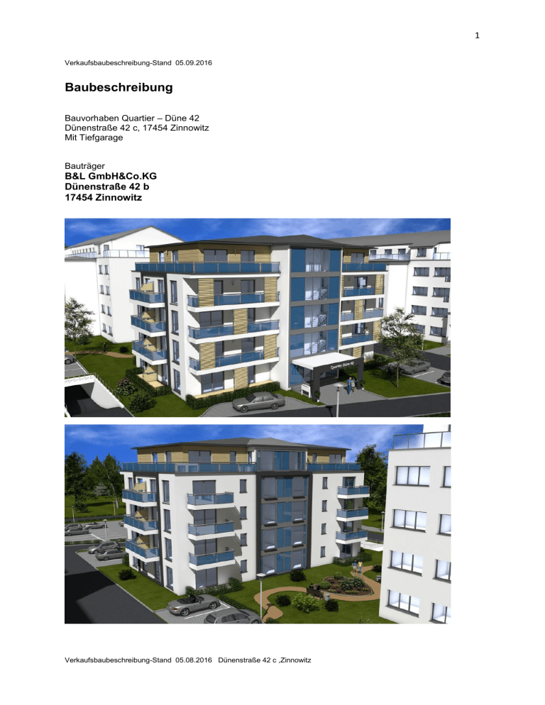 1 Verkaufsbaubeschreibung-Stand 05.09.2016 Baubeschreibung Bauvorhaben Quartier – Düne 42 Dünenstraße 42 c, 17454 Zinnowitz Mit Tiefgarage Bauträger B&L GmbH&Co.KG Dünenstraße 42 b 17454 Zinnowitz Verkaufsbaubeschreibung-Stand 05.08.2016 Dünenstraße 42 c ,Zinnowitz 2 Teil A 1. Allgemeine Beschreibung 1.1 Lage Das zu bebauende Flurstück 3/28, Flur 7, der Gemarkung Zinnowitz, liegt in der Dünenstraße 42c in 17459 Zinnowitz, gemäß dem Lageplan der Abgschlossenheitsbescheinigung. 1.2 Gebäude Das geplante Mehrfamilienhaus besteht aus einem 4-geschossigen Gebäude mit Staffelgeschoss und Kellergeschoss mit Tiefgarage, gemäß den genehmigten Bauzeichungen der Abgschlossenheitsbescheinigung in aktuellster Fassung. 1.3 Verkehrstechnische Erschließung & Stellplätze Das geplante Gebäude kann über die Dünenstraße oder die Anliegerstraße, welche über das Flurstück 3/29 der ETG Dünenstraße 42 ab , die rückseitig des Gebäudes verläuft, erreicht werden. Zur Sicherung dieses Wegerechtes wurde für die ETG Dünenstraße 42c auf dem Flurstück 3/29 eine Baulast eingetragen. Um das geplante Gebäude herum entstehen 10 KFZ Stellplätze, welche überwiegend Sondereigentum darstellen. 1.4 Einfahrt in die Tiefgarage Diese wird als nichtöffentliche Garage mit geringem Zu- und Abgangsverkehr nach den Vorgaben der zum Zeitpunkt des Bauantrages gültigen Garagenverordnung (GarVO) geplant und ausgeführt. Die Zufahrt erfolgt ausschließlich über die rückseitige Anliegerstraße zwischen den Gebäuden Dünenstraße 42 und 43. 1.5 Barrierrefreiheit Die Wohnungen werden als barrierefreier Wohnraum hergestellt. Im Bereich der Terrassen – und Balkontüren kann unter Umständen eine erhöhte Schwelle oder ein Rahmen die Barrierefreiheit einschränken. Im 4. OG können die Zugänge zu den Dachterrassen aufgrund bautechnischer Anforderungen nicht barrierefrei hergestellt werden. 2. Baurechtliche Rahmenbedingungen 2.1 Baugenehmigung Es gilt die aktuellste Fassung der Baugenehmigung, ausgestellt von der unteren Bauaufsichtsbehörde des Landkreises Vorpommern – Greifswald, mit Sitz in 17389 Anklam, Leipziger Allee 26. Das Bauvorhaben wird unter dem Aktenzeichen 07360-15-15 geführt. Verantwortliche Fachplaner ist das Architekturbüro Gesine Lange, Bahnhofstraße 20 in 17335 Strasburg. 2.2 Standsicherheitsnachweis / Tragwerksplanung Es gilt die aktuellste Fassung der Tragwerksplanung, erarbeitet von den Diplomingenieuren Friedrich und Robert Müller, Hamburger Str. 125, 23843 Bad Oldesloe. Das Bauvorhaben wird unter dem Aktenzeichen 15-002 geführt. 2.3 Baugrundgutachten Es gilt die aktuellste Fassung der Baugrundbeurteilung und Gründungsberatung, erarbeitet vom Diplomingenieur Hartmut Köhler, Am Eichenhag 3, 17440 Zemitz. Das Bauvorhaben wird unter dem Aktenzeichen 16035/16 geführt. 2.4 Wärmebedarfsberechnung n. EnEV / Energieausweis Des Gebäude wird gem. den Anforderungen der DIN 4108 und den anerkannten Regeln der Bautechnik ausgeführt. Das Gebäude wird nach der zum Zeitpunkt des Bauantrages gültigen Fassung der Energieeinsparverordnung (EnEV) hergestellt. Es gilt die aktuellste Fassung des Energieausweises, erarbeitet von den Diplomingenieuren Friedrich und Robert Müller, Hamburger Str. 125, 23843 Bad Oldesloe. Das Bauvorhaben wird unter dem Aktenzeichen 15-002 geführt. 2.5 Brandschutz Die Ausführung entspricht den Bestimmungen des konstruktiven Brandschutzes in der zum Zeitpunkt Verkaufsbaubeschreibung-Stand 05.08.2016 Dünenstraße 42 c ,Zinnowitz 3 des Bauantrags gültigen Fassung und der aktuellsten Fassung des Brandschutzkonzeptes des Ing. Büro Möws, Am Schanzberg 3 in 17438 Wolgast, welches Bestandteil der Baugenehmigung ist. Das Bauvorhaben wird unter dem Aktenzeichen 22-03-16/01-BN geführt. 2.6 Schallschutz Bezüglich des Schutzes gegen Schallübertragung zwischen den einzelnen Wohneinheiten gelten die erhöhten Werte der DIN 4109 Beiblatt 2 "Vorschläge für einen erhöhten Schallschutz" für Wohnungen als vereinbart. Anforderungen an den Schallschutz innerhalb einer Wohneinheit bestehen nicht. Zum Schutz gegen die Geräusche aus haustechnischen Anlagen zwischen fremden Wohneinheiten, insbesondere zur Regelung der Anforderung an die Aufzugsanlage, wird die Schallschutzstufe II nach Richtlinie VDI 4100 "Schallschutz von Wohnungen, Kriterien für Planung und Beurteilung" (2007) berücksichtigt. Aus schallschutztechnischen Gründen kann es im Einzelfall erforderlich sein, dass Steckdosen in Wohnungstrennwänden versetzt angeordnet werden müssen. Die Schallschutzberechnungen werden vom Ing. Büro Müller & Müller ausgeführt, siehe 2.2 3. Versichungen Während der Bauzeit wird eine Rohbaufeuer-, Bauwesen- und Bauherrenhaftpflichtversicherung durch den Bauträger abgeschlossen. Die Rohbaufeuerversicherung geht ab Fertigstellung in eine Gebäudeversicherung über, die von der WEG übernommen wird. 4. Hinweise zur Bauausführung 4.1 Richtlinien & Rechtsgrundlagen Grundlagen der Bauausführung sind die als Entwurf zur Teilungserklärung in der Grundlagenurkunde als Anlagen hinterlegten Planungsunterlagen sowie diese Bau- und Ausstattungsbeschreibung. Bei Widersprüchen gilt vorrangig die Bau- und Ausstattungsbeschreibung. Die Baubeschreibung und alle Zeichnungen gelten vorbehaltlich der erforderlichen Genehmigungen und Auflagen der zuständigen Behörden und Versorgungsbetriebe. Aus technischen bzw. genehmigungsrechtlichen Gründen kann es zu Änderungen der Planungsunterlagen kommen. Nicht näher beschriebene Bauausstattungen werden nach Maßgabe des Architekten ausgeführt und orientieren sich am Qualitätsstandard der Bauund Ausstattungsbeschreibung. Änderungen an den konstruktiven Maßnahmen, Ausstattungen und der Wahl der vorgesehenen Produkte und Fabrikate bleiben vorbehalten. Qualitäts- und Warenprodukte namentlich aufgeführter Lieferanten werden bei der Bauausführung vorrangig berücksichtigt. Werden Abweichungen erforderlich, kommen nur gleichwertige Lösung