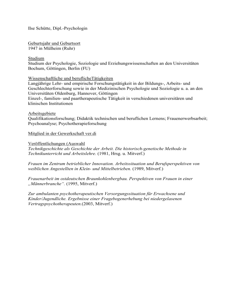 Ilse Schütte, Dipl.-Psychologin Geburtsjahr und Geburtsort 1947 in Mülheim (Ruhr) Studium Studium der Psychologie, Soziologie und Erziehungswissenschaften an den Universitäten Bochum, Göttingen, Berlin (FU) Wissenschaftliche und beruflicheTätigkeiten Langjährige Lehr- und empirische Forschungstätigkeit in der Bildungs-, Arbeits- und Geschlechterforschung sowie in der Medizinischen Psychologie und Soziologie u. a. an den Universitäten Oldenburg, Hannover, Göttingen Einzel-, familien- und paartherapeutische Tätigkeit in verschiedenen universitären und klinischen Institutionen Arbeitsgebiete Qualifikationsforschung; Didaktik technischen und beruflichen Lernens; Frauenerwerbsarbeit; Psychoanalyse; Psychotherapieforschung Mitglied in der Gewerkschaft ver.di Veröffentlichungen (Auswahl Technikgeschichte als Geschichte der Arbeit. Die historisch-genetische Methode in Technikunterricht und Arbeitslehre. (1981, Hrsg. u. Mitverf.) Frauen im Zentrum betrieblicher Innovation. Arbeitssituation und Berufsperspektiven von weiblichen Angestellten in Klein- und Mittelbetrieben. (1989, Mitverf.) Frauenarbeit im ostdeutschen Braunkohlenbergbau. Perspektiven von Frauen in einer „Männerbranche“. (1995, Mitverf.) Zur ambulanten psychotherapeutischen Versorgungssituation für Erwachsene und Kinder/Jugendliche. Ergebnisse einer Fragebogenerhebung bei niedergelasenen Vertragspsychotherapeuten.(2003, Mitverf.)