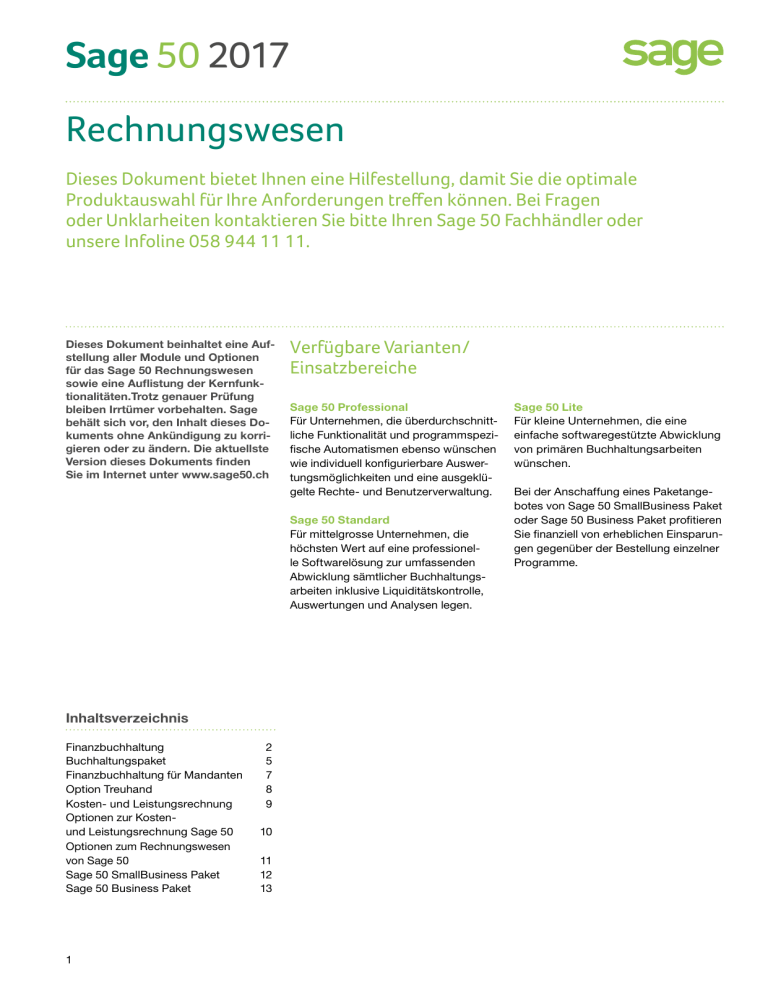 Sage 50 2017 Rechnungswesen Dieses Dokument bietet Ihnen eine Hilfestellung, damit Sie die optimale Produktauswahl für Ihre Anforderungen treffen können. Bei Fragen oder Unklarheiten kontaktieren Sie bitte Ihren Sage 50 Fachhändler oder unsere Infoline 058 944 11 11. Dieses Dokument beinhaltet eine Aufstellung aller Module und Optionen für das Sage 50 Rechnungswesen sowie eine Auflistung der Kernfunktionalitäten.Trotz genauer Prüfung bleiben Irrtümer vorbehalten. Sage behält sich vor, den Inhalt dieses Dokuments ohne Ankündigung zu korrigieren oder zu ändern. Die aktuellste Version dieses Dokuments finden Sie im Internet unter www.sage50.ch Verfügbare Varianten/ Einsatzbereiche Sage 50 Professional Für Unternehmen, die überdurchschnittliche Funktionalität und programmspezifische Automatismen ebenso wünschen wie individuell konfigurierbare Auswertungsmöglichkeiten und eine ausgeklügelte Rechte- und Benutzerverwaltung. Sage 50 Standard Für mittelgrosse Unternehmen, die höchsten Wert auf eine professionelle Softwarelösung zur umfassenden Abwicklung sämtlicher Buchhaltungsarbeiten inklusive Liquiditätskontrolle, Auswertungen und Analysen legen. Inhaltsverzeichnis Finanzbuchhaltung2 Buchhaltungspaket5 Finanzbuchhaltung für Mandanten 7 Option Treuhand 8 Kosten- und Leistungsrechnung9 Optionen zur Kostenund Leistungsrechnung Sage 50 10 Optionen zum Rechnungswesen von Sage 50 11 Sage 50 SmallBusiness Paket 12 Sage 50 Business Paket 13 1 Sage 50 Lite Für kleine Unternehmen, die eine einfache softwaregestützte Abwicklung von primären Buchhaltungsarbeiten wünschen. Bei der Anschaffung eines Paketangebotes von Sage 50 SmallBusiness Paket oder Sage 50 Business Paket profitieren Sie finanziell von erheblichen Einsparungen gegenüber der Bestellung einzelner Programme. Sage 50 2017 Finanzbuchhaltung Die Varianten der Finanzbuchhaltung von Sage 50 bilden den Kern der Finanz- und Buchhaltungsanwendungen. Je nach Unter­nehmensanforderung können sie als unabhängige Softwarelösungen eingesetzt werden, überzeugen jedoch gerade im Zusammenspiel mit den weiteren Modulen des Sage 50 Portfolios hinsichtlich Datenaustausch und -abgleich. Funktionalität Allgemein Unbeschränkt mandantenfähig Darstellung mit hochauflösenden Bildschirmen Mit der Online Help können Hilfethemen und Anleitungen direkt via Sage 50 gesucht und aufgerufen werden Hilfesystem unterstützt Anwender mit Erklärungen passend zum Anwendungsfenster Einrichtungsassistent Konfigurierbarer Auswertungsbaum Konfigurierbare Navigationsoberfläche (myDesk) Programmaktualisierungen (Auto Update) via Internet (manuell oder automatisiert) Benutzer- und Rechteverwaltung SmartNav! als benutzerdefinierbare Navigationsoberfläche Mandantenverwaltung Daten, Kontenplan, Buchen Kontenrahmenvorlagen (KMU, EU, diverse Branchen / Gesellschaftsformen) Der Basismandant ist bezüglich neuer Gesetzesrevision über die Rechnungslegung vom 1. Januar 2013 überarbeitet Der Kontenplan nach neustem Rechnungslegungsrecht ist in Englisch und Französich verfügbar Assistent für den Geschäftsjahreswechsel Umfangreiche Import- / Exportfunktionen für Buchungen Nebenkontenpläne / Ansichten pro Kontenplan Kontenplanumnummerierung Buchungsbeschränkung (Anzahl Belege pro Geschäftsjahr) Automatische Buchungswarnung bei Überschreitung von Budget- oder Kreditlimiten Archivierung gelöschter Buchungen Buchungsvorlagen Buchungsmethoden (Verteillisten Kostenstellen / -träger) Buchungen über die Eingabe der Kontobezeichnung oder Kontonummer möglich. Innerhalb eines Geschäftsjahres können 4 Buchungsperioden gesperrt und entsperrt werden 2 Sage 50 Lite Sage 50 Standard Sage 50 Professional / 1 / 99 / 30 keine keine keine Sage 50 2017 Funktionalität MwSt.-Verprobung / -Abrechnung (effektiv oder nach Pauschal- bzw. Saldosteuermethode) MwSt.-Formular UID (Unternehmens-Identifikationsnummer) Budgetierung – Budgetdetailebene Quartal und Jahr / zusätzlich Monat – Anzahl Budgets – Budget-Sets (virtuelle, auswertbare Budgets mit Formeln) – nach Kostenstellen / -träger mit Forecast Transitorische Rückbuchungen – automatisiert und / oder per Datei-Export Periodisierte Kostenverteilung innerhalb eines Geschäftsjahres (pro Monat / Quartal / Halbjahr) (V2009: Periodenabgrenzungen) Letzte Buchungen Vorjahr (Ansicht / Kopieren) Fremdwährungen / mit Tageskursen Tageskurse für Währungen können direkt von der Eidgenössischen Bundesverwaltung importiert werden Valutaausgleich Kostenstellen / -träger und Projekte Auswertungen Auswertungen miteinander vergleichen Direktes Nachführen der Konten und Auswertungen Die Kontenblätter «Aktuell» und «Vorjahr» können gleichzeitig geöffnet werden Umfangreiche Filter- und Darstellungsmöglichkeiten Individuelle Auswertungen dank Kombination mit speicherbaren Suchfiltern Ausgabefilter für XLS, RTF, HTML, DOC Zusätzliche Ausgabefilter für XML, PDF, BPM, JPG, TIFF, inkl. E-Mailversand Auswertungspakete – Standardauswertungen (nicht anpassbar) – Designauswertungen (List & Label) / mit Auswertungsdesigner – Treuhandauswertungen mit Auswertungsdesigner (Crystal Reports / Papyrus) – Designstyles für Treuhandauswertungen (Classic & Color) – nur in Option Treuhand Budgetvergleiche / stichtagbezogener Vorjahresvergleich Mittelflussrechnung / mit mehreren Fonds und Strukturen Die Papyrus Mittelflussrechnung (indirekte Methode) ist ab Variante Standard abrufbar Kostenstellen / -träger-Auswertungen, Profitcenterabrechnung Kennzahlendefinition und -auswertung Berichtsmanager für automatisiertes Berichtswesen / Anzahl Berichte Bilanz und Erfolgsrechnung (ER) mit Vorjahresvergleich Auswertung nach Buchungsersteller möglich – verbessert internes Kontrollsystem (IKS) Betriebsabrechnungsbogen (BAB) 3 Sage 50 Lite Sage 50 Standard Sage 50 Professional / / / 99 1 2 / / / / / / / / / / / / / / / / / 1 Sage 50 2017 Funktionalität Extras Datenaustausch zwischen Treuhänder und Mandant (Schnittstelle 