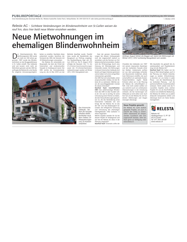 PUBLIREPORTAGE Produkteinfos und Publireportagen sind keine Empfehlung des HEV Schweiz Eine Dienstleistung der Zürichsee Werbe AG. Weitere Auskünfte: Darko Panić, Verkaufsleiter, Tel. 044 928 56 01 oder [email protected] 1. Oktober 2010 Relesta AG – Sichtbare Veränderungen im Blindenwohnheim von St.Gallen weisen darauf hin, dass hier bald neue Mieter einziehen werden.. Neue Mietwohnungen im ehemaligen Blindenwohnheim D er Ostschweizerische Blindenfürsorgeverein OBV wurde vor mehr als 100 Jahren gegründet. 1907 wurde das Blindenwohnheim an der Bruggwaldstrasse in St. Gallen erstellt. Das Gebäude wird seit kurzem nicht mehr als Wohnheim genutzt und der OBV beauftragte die Relesta AG, eine Studie für mögliche Umnutzungsmöglich- keiten zu erstellen. Nachdem diese präsentiert wurden, beschloss der Vorstand des OBV, die Variante mit 20 Mietwohnungen umzusetzen. Die Relesta AG entwickelte ein Bauprojekt, bei dem der Erhalt der historischen und eindrucksvollen Fassade im Vordergrund stand. Der OBV reichte die Zonenplanänderung ein, die im Mai 2010 von der Behörde bewilligt wurde. Parallel dazu wurde der Baubehörde das Baugesuch zur Prüfung vorgelegt. Die Baubewilligung liegt seit 28. Juni 2010 vor. Am 9. August 2010 erfolgte der Baustart. Die 1½- bis 4½-Zimmer-Geschosswohnungen sowie die 4½-Zimmer-Dachmaisonettewohnungen werden ab Winter 2011/2012 bezugsbereit sein. Das historische Gebäude – bei dem die Fassade erhalten bleibt – beinhaltet nach dem Umbau 20 Mietwohnungen und 29 Autoeinstellplätze. Zwei der grossen Herausforderungen bei diesem Umbauprojekt sind: die Liegenschaft statisch zu verstärken und die Normen zur Erdbebensicherheit einzuhalten. Zudem wird die Öl-Heizanlage durch eine Heizung mit Wärmepumpen und Erdsonden ersetzt. Die Wohnungen in diesem historischen Gebäude sind bereits auf reges Interesse gestossen und es haben sich schon einige Mietinteressenten gemeldet. Der OBV hat sich entschieden, einen anspruchsvollen Umbau mit der Relesta AG zu realisieren. Welches waren die ausschlaggebenden Gründe für diesen Entscheid? Manfred Naef, Geschäftsleiter OBV: Das «altehrwürdige» Blindenheim des OBV ist über hundert Jahre alt. Uns war es wichtig, für seine Umnutzung einen Partner zu haben, der den Herausforderungen gewachsen ist, die die Veränderung eines historischen Gebäudes mit sich bringt. Bei der Relesta AG ist das der Fall. Uns hat diesbezüglich besonders die erfolgreiche Sanierung und Umnutzung des ehemaligen Fabrikgebäudes «Alte Gerberei» in Arbon begeistert. Welche Aspekte standen für Sie bei diesem Projekt im Vordergrund und wie hat die Relesta AG diese in der Planung umgesetzt? Manfred Naef: Einerseits sollte der Anfangs August fuhren die Bagger auf, damit die Wohnungen ab Winter 2011/2012 rechtzeitig bezugsbereit sein werden. Charakter des Gebäudes von 1907 mit seinem imposanten Baukörper und der markanten Fassade erhalten bleiben. Andererseits wollten wir aus dem grosszügig vorhandenen Bauvolumen modernen, attraktiven Wohnraum schaffen, der auch wirtschaftlich ein optimales KostenNutzen-Verhältnis ergibt. Beide Kriterien sehen wir in der Planung der Relesta AG vollumfänglich erfüllt. Und nicht zuletzt wollten wir uns natürlich auch vor unliebsamen Überraschungen in der Umsetzung schützen, die bei Sanierungen von Altbauten ja nicht selten sind. Auch hier hat uns die Relesta AG mit fundierten Abklärungen und klugen Lösungen überzeugt. Wie beurteilen Sie generell die Zusammenarbeit und Projektentwicklung mit der Relesta AG? Manfred Naef: Wir haben von Anfang an Wert darauf gelegt, auch in der Planung von Details miteinbezogen zu werden. Erfreulicherweise konnten wir uns bisher in jeder Phase – von der Ideenfindung bis zur konkreten Planung – auf die partnerschaftliche Zusammenarbeit verlassen. Nicht zuletzt sind die finanziellen Aspekte eines solchen Projekts für uns als Non-Profit-Organisation von erheblicher Bedeutung. Die Relesta AG liefert uns zu jedem Zeitpunkt transparente Zahlen und überzeugt durch ein faires Kostenmanagement. Neue Projekte gesucht Die Relesta AG sucht laufend geeignete Projekte, um auch in Zukunft den Erfolg zu sichern. Sofern Interessierte ein entsprechendes Grundstück oder eine Liegenschaft besitzen, steht das Team gerne zur Verfügung unter www.relesta.ch. Relesta AG Herbergstrasse 11, PF 18 9524 Zuzwil Tel. 071 945 00 00 www.relesta.ch