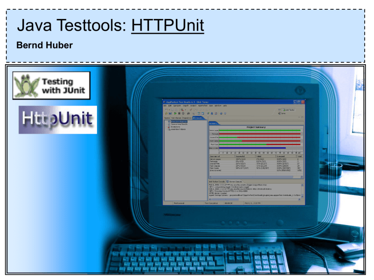 Java Testtools: HTTPUnit Bernd Huber Java Testwerkzeuge: HTTPUnit – Bernd Huber Übersicht 1. Über HTTPUnit 2. Installation 3. Verwendung Java Testwerkzeuge: HTTPUnit – Bernd Huber 1. Über HTTPUnit Testen von HTTP/HTML Funktionalität, Forms, Frames, JavaScript, SSL, Cookies, Headers Open Source Anwendung in einem JUnit-TestCase Java Testwerkzeuge: HTTPUnit – Bernd Huber 2. Installation Über die Webseite von HTTPUnit den Link Download 1.6.2 auswählen und die ZIP-Datei in einem beliebigen Verzeichnis entpacken. Java Testwerkzeuge: HTTPUnit – Bernd Huber 2. Installation Ein neues Java-Projekt erstellen und eine neue JUnit-TestCase-Klasse darin erzeugen. Java Testwerkzeuge: HTTPUnit – Bernd Huber 2. Installation Unter den Projekt-Properties Java Build Path Libraries Add External Jars auswählen und sämtliche Jar-Dateien im HTTPUnit-Unterverzeichnis „jars“ hinzufügen. Außerdem noch die Jar-Datei „httpunit.jar“ im Unterverzeichnis „lib“ hinzufügen. Java Testwerkzeuge: HTTPUnit – Bernd Huber 3. Verwendung In der Junit-TestCase-Klasse folgenden Import hinzufügen: import com.meterware.httpunit.*; Die wichtigsten Klassen von HTTPUnit: WebConversation WebRequest WebResponse WebForm - Grundgerüst einer Webverbindung - Ein Request an den Server schicken - Ein Response vom Server - Eine HTML-Form Java Testwerkzeuge: HTTPUnit – Bernd Huber 3. Verwendung Java Testwerkzeuge: HTTPUnit – Bernd Huber 3. Verwendung Tabellen testen: Die erste Tabelle auf der Seite hat 4 Zeilen und 3 Spalten. Es gibt genau einen Link in der letzten Zelle der ersten Zeile Weitere Beispiele finden sich unter: http://httpunit.sourceforge.net/doc/cookbook.html Java Testwerkzeuge: HTTPUnit – Bernd Huber Ende der Präsentation ... Für Fragen stehen wir Ihnen jetzt gerne zur Verfügung ... Java Testwerkzeuge: HTTPUnit – Bernd Huber
