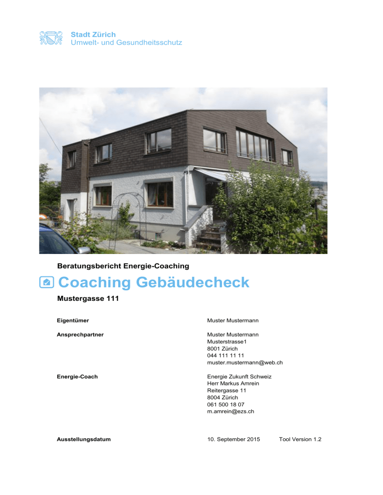 Stadt Zürich Umwelt- und Gesundheitsschutz Beratungsbericht Energie-Coaching Coaching Gebäudecheck Mustergasse 111 Eigentümer Muster Mustermann Ansprechpartner Muster Mustermann Musterstrasse1 8001 Zürich 044 111 11 11 [email protected] Energie-Coach Energie Zukunft Schweiz Herr Markus Amrein Reitergasse 11 8004 Zürich 061 500 18 07 [email protected] Ausstellungsdatum 10. September 2015 Tool Version 1.2 Beratungsgespräch Datum Teilnehmende 2. September 2015 Muster Mustermann, Eigentümer Herr Amrein Markus, Energie-Coach Liegenschaftsangaben Eidgenössischer Gebäudeidentifikator (EGID) Baujahr Gebäudekategorie Energiebezugsfläche 1) (ca. in m2) Wohnanteil Sonstige Nutzungen Anzahl Wohnungen Baukulturelle Auflagen 161972 1942 EFH 190 100% 0% 1 Nein … Standortangaben Energieversorgung Fernwärmegebiet Nein Baukulturelle Auflagen Quartiererhaltungszone Kernzone Nein Nein Allgemeines Ausgangslage: Die Beratumgsempfängerin interessiert welche energetische Massnahmen an der Gebäudehülle möglich sind und ob die Nutzung von Solarenergie und der Einsatz einer Wärmepumpe sinnvoll ist. Ziel der Beratung: - Abklärung welche energetischen Massnahmen sinnvoll und rentabel zu realisieren sind - Aufzeigen von möglichen Heizsystemen und den Einsatz von erneuerbaren Energien Grundlagen: Pläne 1:100 (Grundrisse, Fassaden) Fachpersonen: Keine Fachpersonen Glossar 1) Energiebezugsfläche Die Energiebezugsfläche ist die Summe aller beheizten Flächen eines Gebäudes. Die raumumschliessenden Wände werden ebenfalls dazugezählt (beheizte Brutto-Grundfläche). Keller, Treppenhäuser sowie sonstige Räume, die sich weder im Wärmedämmperimeter der Gebäudehülle befinden noch eine eigene Heizung besitzen, sind nicht in der Energiebezugsfläche enthalten. 2 16.09.2015 Zusammenfassung Ist-Zustand Das Einfamilienhaus wurde laufend erneuert und gut unterhalten. Der Innenraum im Dachgeschoss wurde 2009 saniert (Fenster, teilweise Innendämmung). Das Dach befindet sich jedoch noch im Originalzustand von 1975 und sollte energetische verbessert werden. Die Fenster im EG wurden 2001 und im OG 2009 ersetzt und befinden sich in einem guten Zustand. Der Dämmperimeter im UG ist nicht klar definiert. Es ist sinnvoll, die Nutzung im Keller zu überdenken. Je nach Nutzungskonzept kann der Dämmperimeter im Keller optimiert werden (beheizt zu unbeheizt ). Die Ölheizung für die Raumheizung und das Warmwasser hat die Lebensdauer erreicht. Sie ist nicht effizient und verursacht hohe CO2-Emmisonen. Beurteilung / Resultate Vor dem Heizungsersatz sollte zuerst die Effizienz des Gebäudes verbessert werden (die beste und günstigste Energie ist die, die man nicht benötigt). Die Heizung kann nach einer Gebäudemodernisierung kleiner dimensioniert werden, sie wird günstiger, effizienter und interessanter für erneuerbare Energien. Wir empfehlen folgende nächste Schritte: 1. Dämmung Steildach von aussen und gleichzeitig Photovoltaikanlage integrieren. Allenfalls Dachvorsprung verlängern im Hinblick auf spätere Aussenwärmedämmung 2. Ersatz Ölfeuerung durch Wärmepumpe Luft-Wasser oder Erdsonde. Allenfalls können die Heizflächen vergrössert werden, um den Wirkungsgrad der Wärmepumpe zu steigern. 3. Demontage Öltank, optimieren Dämmperimeter und bestimmen Nutzung im UG 4. Dämmung Fassaden Weiteres Erarbeiten Sie ein Sanierungskonzept. Errechnen Sie die Kosten der einzelnen Massnahmen und prüfen Sie, welche Massnahmen finanziell umgesetzt werden können. Wenn die Sanierung etappiert wird, gibt es verschiedenste Schnittstellen zu beachten und zu lösen. Ich empfehl Ihnen für die Planung und Umsetzung den Beizug eines Architekten oder Energieberaters. Objektspezifisches Das Dach eignet sich gut für die Nutzung von Solarenergie - siehe im Anhang Auszug aus dem Solarkataster der Stadt Zürich. Am Standort sind Erdsondenbohrungen möglich - siehe im Anhang Auszug aus dem Wärmenutzungsatlas des Kanton Zürich. Zeitachse Kurzfristig < 2 Jahre - Dämmung Steildach - Installation einer Photovoltaikanlage Mittelfristig 2 - 5 Jahre - Ersatz Ölfeuerung durch Wärmepumpe - Optimieren Dämmperimeter und bestimmen Nutzung im UG Langfristig > 5 Jahre - Dämmung der Fassaden Coaching Gebäudecheck 3 Bilder Süd-Westfassade Dachgeschoss Ölheizung 4 Westfassade Balkon 16.09.2015 Notizen Coaching Gebäudecheck 5 Beurteilung und Empfehlungen Nachfolgend wird der Zustand Ihres Gebäudes beurteilt - unterschieden nach Gebäudehülle und Haustechnik. Daraus sind Empfehlungen zu energetischen Massnahmen abgeleitet. Gebäudehülle 2) Folgende Tabelle zeigt den Zustand der energetisch relevanten Bauteile Ihres Gebäudes und gibt - wo empfehlenswert - spezifische Massnahmenvorschläge zur Sanierung ab. 6 Ist-Zustand Empfehlung Dach Steildach, Baujahr 1975 mit Eterniteindeckung. Gedämmt zwischen den Sparren mit ca. 6cm Vetroflex. UWert ca. 0.6W/m2K. Dämmassnahmen von aussen mit ca. 16cm Dämmung zwischen und 8cm Dämmung über den Sparren. Es soll ein UWert von kleiner als 0.20W/m2K angestrebt werden (Bedingung für Fördergelder). Kosten ca. 450 CHF/m2. Gleichzeitig Solaranlage integrieren. Aussenwände EG: Verbandmauerwerk, ungedämmt EG: Aussendämmung der Fassaden Im EG OG: Holzständerbau, gedämmt mit ca. 4- mit ca. 14-18cm Wärmedämmung 6cm. OG: Dämmung zwischen den Holzständern Die meisten Wandflächen wurden mit und zusätzliche Dämmung über den einer Innendämmung 8cm versehen. Ständern. Anzustrebender U-Wert kleiner als 0.2W/m2K (Bedingung für Fördergelder). Fenster Estrichboden Fensterläden Kellerdecke EG: 2-Fach-Wärmeschutzverglasung, nicht vorhanden nicht vorhanden Kellerdecke gedämmt mit 8cm Polystyrol. Decke im Bereich Tankraum noch ungedämmt. Keine Massnahmen. Keine Empfehlung Keine Empfehlung Der Keller, auch der Tankraum, soll längerfristig unbeheizt bleiben. Die Decke im Bereich Tankraum sollte deshalb ergänzt werden. Sinnvollerweise jedoch erst nachdem der Tank entfernt oder die Nutzung de