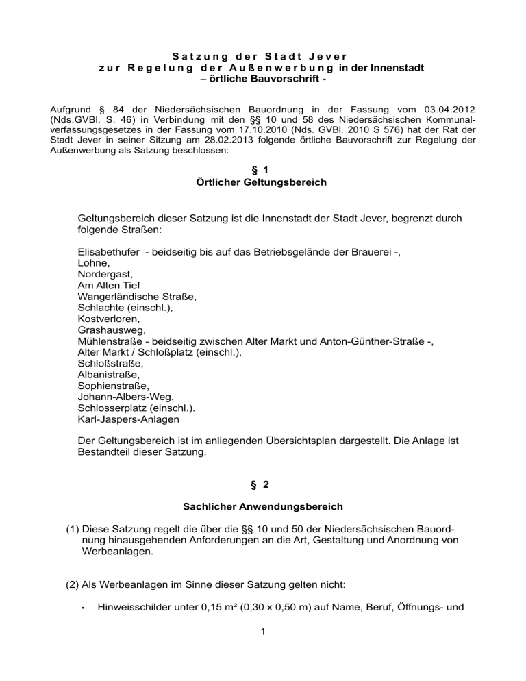 Satzung der Stadt Jever z u r R e g e l u n g d e r A u ß e n w e r b u n g in der Innenstadt – örtliche Bauvorschrift Aufgrund § 84 der Niedersächsischen Bauordnung in der Fassung vom 03.04.2012 (Nds.GVBl. S. 46) in Verbindung mit den §§ 10 und 58 des Niedersächsischen Kommunalverfassungsgesetzes in der Fassung vom 17.10.2010 (Nds. GVBl. 2010 S 576) hat der Rat der Stadt Jever in seiner Sitzung am 28.02.2013 folgende örtliche Bauvorschrift zur Regelung der Außenwerbung als Satzung beschlossen: § 1 Örtlicher Geltungsbereich Geltungsbereich dieser Satzung ist die Innenstadt der Stadt Jever, begrenzt durch folgende Straßen: Elisabethufer - beidseitig bis auf das Betriebsgelände der Brauerei -, Lohne, Nordergast, Am Alten Tief Wangerländische Straße, Schlachte (einschl.), Kostverloren, Grashausweg, Mühlenstraße - beidseitig zwischen Alter Markt und Anton-Günther-Straße -, Alter Markt / Schloßplatz (einschl.), Schloßstraße, Albanistraße, Sophienstraße, Johann-Albers-Weg, Schlosserplatz (einschl.). Karl-Jaspers-Anlagen Der Geltungsbereich ist im anliegenden Übersichtsplan dargestellt. Die Anlage ist Bestandteil dieser Satzung. § 2 Sachlicher Anwendungsbereich (1) Diese Satzung regelt die über die §§ 10 und 50 der Niedersächsischen Bauordnung hinausgehenden Anforderungen an die Art, Gestaltung und Anordnung von Werbeanlagen. (2) Als Werbeanlagen im Sinne dieser Satzung gelten nicht: • Hinweisschilder unter 0,15 m² (0,30 x 0,50 m) auf Name, Beruf, Öffnungs- und 1 Sprechzeiten an Hauswänden der Stätte der Leistung, • Hinweisschilder bei Gemeinschaftspraxen bzw. Sozietäten bis zu einer maximalen Höhe von 1 m, • Hinweisschilder an Baustellen auf Projekte, Bauherren und an der Bauausführung Beteiligte sowie Betriebsverlagerungen und Wiedereröffnungen, soweit diese nur vorübergehend aufgestellt und angebracht werden, • Werbung für zeitlich begrenzte Veranstaltungen politischer, kirchlicher, kultureller und sportlicher Zwecke und Werbeaktionen von Straßengemeinschaften auch auf beweglichen, befristet angebrachten Werbeträgern (z.B. Transparente, Banner, Spannbänder), • Hinweisbeschilderungen für öffentliche Einrichtungen oder Einrichtungen von öffentlichem Charakter und allgemeinen Interesse. (3) Die Vorschriften, nach denen Sondernutzungen an öffentlichen Straßen, Wegen und Plätzen der Erlaubnis bedürfen, sowie Vorschriften, die die Anbringung oder das Aufstellen von Werbeanlagen aus Gründen der Sicherheit und Ordnung auf öffentlichen Straßen, Wegen und Plätzen regeln, bleiben von dieser Satzung unberührt. (4) Bei Anbringung von Werbeanlagen an einem Baudenkmal gemäß § 3 Absätze 2 und 3 Niedersächsisches Denkmalschutzgesetz (NDSchG) besteht grundsätzlich eine Genehmigungspflicht gemäß § 10 NDSchG. Dies beinhaltet die vorherige Abstimmung mit der unteren Denkmalschutzbehörde des Landkreises Friesland. Für Baudenkmale und ihre Umgebung können, über die Festsetzungen der Werbesatzung hinaus, strengere Maßstäbe und weitergehende Anforderungen an die Werbeanlagen gestellt werden. §3 Grundsätzliche Anforderungen und Ausschlüsse für Werbeanlagen Für Werbeanlagen gelten folgende grundsätzliche Anforderungen und Ausschlüsse: (1) Werbeanlagen sind nur in unmittelbarem Bezug zu Gebäuden und in direkter Verbindung mit und am Ort des zu bewerbenden Angebots (an der Stätte der Leistung) zulässig und bedürfen der Einzelgenehmigung. Ausgenommen hiervon sind Hinweisschilder für Betriebe in 2. Reihe oder in Hoflagen. Diese sind bis zu einer Breite von 0,65 m und einer Höhe von 0,50 m zulässig. Als Betriebe in 2. Reihe oder Hoflagen gelten solche Betriebe, die in den Straßen Kattrepel und Grüner Garten und im Klönhoff ansässig sind. (2) Werbeanlagen dürfen die architektonischen Gliederungselemente der Fassade, wie Fenster und Fenstergewände, Pfeiler- und Säulenelemente, Gebäudekanten, Gesimse und Gesimsbänder, Ziermauerwerk etc. nicht verdecken oder überschneiden. 2 (3) Werbeanlagen dürfen selbstleuchtend oder hinterleuchtet sein oder mit weißem bzw. gelblich weißem Licht angestrahlt werden. (4) Werbeanlagen mit Blink-, Wechsel und Lauflicht oder sonstigem beweglichen Licht sowie Lichtprojektionen, wie Bildwerfer und Filmwerbung, sind unzulässig. Dies gilt auch für bewegliches Licht oder ähnliche Elemente zur Anstrahlung von Werbeanlagen. (5) Werbeanlagen, die ein grelles Farblicht erzeugen, sind unzulässig. Neon- bzw. Leuchtfarben und folgende Farben der RAL-Farbskala sind unzulässig: RAL 1016 – Schwefelgelb RAL 1026 – Leuchtgelb RAL 2007 – Leucht-Hellorange RAL 3026 – Leuchthellrot RAL 1023 – Verkehrsgelb RAL 2005 – Leuchorange RAL 3024 – Leuchtrot (6) Werbeanlagen mit rotierenden oder sich in jeglicher Form dauerhaft bewegenden Teilen sind unzulässig. (7) Werbeanlagen an Einfriedungen sind unzulässig. Dieses gilt nicht für durchsichtige Trennwände als Abtrennung von Außenbewirtungsflächen zu Straßenflächen. (8) Werbeanlagen benachbarter Hausfassaden dürfen nicht zu einer durchlaufenden Einheit zusammengefasst werden. (9) Es sind nur unbewegliche, d.h. an baulichen Anlagen ortsunveränderbar angebrachte Werbeanlagen zulässig. Spannbänder/Transparente/Banner sowie Werbeanlagen als laufende Schriftbänder sind unzulässig. Spannbänder, die für Geschäftsbereiche werben - als Quartierswerbung - ohne einzelne Gewerbebetriebe und Geschäfte zu benennen, sind hiervon ausgenommen. § 4 Zulässige Arten und Anzahl der Werbeanlagen (1) Im Geltungsbereich dieser örtlichen Bauvorschrift sind von Werbeanlagen im Sinne des § 50 NBauO folgende Werbeanlagen zulässig: a) Parallel zur Fassade und waagerecht angebrachte oder aufgetragene Werbeanlagen Dieses sind zwei- oder dreidimensionale ein- bzw. mehrteilige Werbeanlagen, die parallel zur Fassade bzw. der Gebäudefront waagerecht angebracht bzw. aufgetragen sind. Senkrechte Werbeanlagen in dieser Form sind nur in begründeten Ausnahmefäll