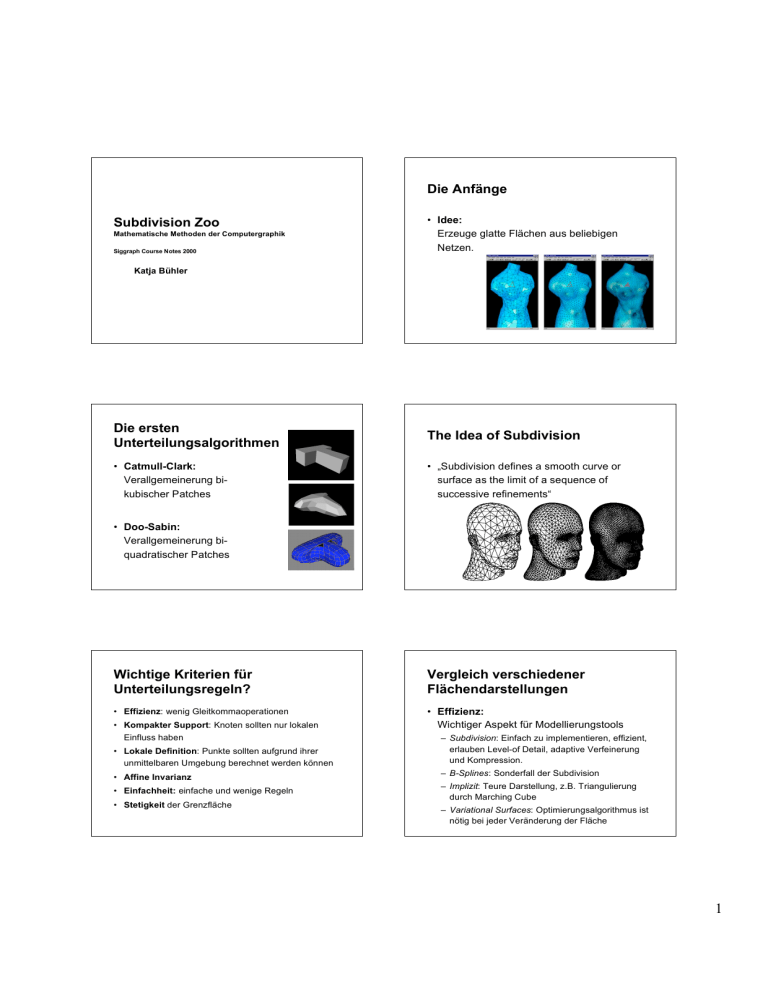 Die Anfänge Subdivision Zoo Mathematische Methoden der Computergraphik Siggraph Course Notes 2000 • Idee: Erzeuge glatte Flächen aus beliebigen Netzen. Katja Bühler Die ersten Unterteilungsalgorithmen The Idea of Subdivision • Catmull-Clark: Verallgemeinerung bikubischer Patches • „Subdivision defines a smooth curve or surface as the limit of a sequence of successive refinements“ • Doo-Sabin: Verallgemeinerung biquadratischer Patches Wichtige Kriterien für Unterteilungsregeln? Vergleich verschiedener Flächendarstellungen • Effizienz: wenig Gleitkommaoperationen • Effizienz: Wichtiger Aspekt für Modellierungstools • Kompakter Support: Knoten sollten nur lokalen Einfluss haben • Lokale Definition: Punkte sollten aufgrund ihrer unmittelbaren Umgebung berechnet werden können – Subdivision: Einfach zu implementieren, effizient, erlauben Level-of Detail, adaptive Verfeinerung und Kompression. • Affine Invarianz – B-Splines: Sonderfall der Subdivision • Einfachheit: einfache und wenige Regeln • Stetigkeit der Grenzfläche – Implizit: Teure Darstellung, z.B. Triangulierung durch Marching Cube – Variational Surfaces: Optimierungsalgorithmus ist nötig bei jeder Veränderung der Fläche 1 Vergleich verschiedener Flächendarstellungen Vergleich verschiedener Flächendarstellungen • Veränderbare, beliebige Topologie • Flächenmerkmale – Splines: keine veränderbare Topologie, Stetigkeitsprobleme an außergewöhnlichen Punkten. – Implizite Flächen: Sehr gute Methoden! Können auch mit sich verändernder Topologie umgehen, beliebiger Genus der Fläche. Aber: Schwer zu kontrollieren. – Subdivision: Beliebige Topologie und Genus, veränderbar, beliebige Netzstruktur ohne Effizienzverlust und Stetigkeitsproblemen Kontrollierbarkeit spezieller Flächenmerkmale, wie Kanten, Spitzen, Rillen. – Variational Surfaces: Höchstes Maß an Kontrolle und Flexibilität – Splines: Sehr präzise Kontrolle, aber schwierig neue Merkmale hinzuzufügen und teuer. – Subdivision: Erhaltung von Merkmalen bei Subdivision braucht spezielle Regeln + evtl. Interaktion. Vergleich verschiedener Flächendarstellungen Stationäre, reguläre Unterteilungsflächen • Genauigkeit der Darstellung Hier: Subdivision Schemata sind – Splines / Implizite Flächen: Genaue Analytische/algebraische Beschreibung der Fläche. Werden zur Darstellung und zum Design von „Class A Surfaces“ verwendet – Subdivision: Zu ungenau für „Class A“ – Stationär, d.h. die Parameter bleiben für jeden Unterteilungsschritt gleich (Gegenteil: „Variational“, d.h. die Unterteilungsregeln ändern sich entsprechend globaler Energieminimierungsfunktionen.) – Regulär, d.h. extra Regeln müssen nur für Ausnahmefälle festgelegt werden – generieren mindestens C 1 -stetige Flächen Charakterisierung von Unterteilungsalgorithmen Charakterisierung von Unterteilungsalgorithmen Art der Unterteilungsregel: • Art des generierten Meshs • Primal: • Interpolierend oder approximierend – Flächen werden unterteilt – Flächen bilden Quadtree • Glätte der Grenzfläche (C1, C2,....) • Dual: – Knoten werden aufgesplittet – Knoten bilden Quadtree – „Corner Cutting“ – Es gibt keine dualen Unterteilungsalgorithmen für Dreiecksnetze! 2 Klassifikation Beispiele Nicht in dieses Schema passen: • 3 Unterteilung (Kobbelt) • Unterteilung von 4-k Meshes (Velho, Gomes) Notationen / Begriffe Notationen / Begriffe • Außergewöhnliche Knoten: • Ränder und scharfe Kanten: – Dreiecksnetz: Valenz anders als 6 – Hier müssen spezielle Regeln – Vierecksnetz: Valenz anders als 4 festgelegt werden, die diese Features erhalten. • Gerade / Ungerade Knoten: – Knoten, die in dem gerade aktuellen Unterteilungsschritt generiert wurden heißen ungerade. • Kanten und Flächenknoten: – Je nach Unterteilungsschema, die Stelle, an der der Knoten eingefügt wurde • Masken: – Masken sind Bilder / Schemata, die zeigen, wie aus alten Kontrollpunkten neue Knoten generiert werden. Notationen / Begriffe Spezielle Regeln • Indexierung von Knoten bezüglich eines fest gewählten Knotens • Wieviele Unterteilungsregeln sind nötig? • Subdivision Level: j – Innere Punkte – Ränder + Ecken • Kurzform: p(vji,l ) = p ji,l – Scharfe Kanten 3 Problem mit konkaven Ecken: Knotenarten • Es gibt also vier verschiedene Arten von Knoten: – Innere Knoten – Randknoten – Konvexe Knoten – Konkave Knoten Loop Subdivision - Eigenschaften Loop Subdivision - Masken • Approximierendes Schema für Dreiecksnetze • Basiert auf Box-Splines • C2 -stetig auf regulären Netzen, sonst C1-stetig • Primales Schema Loop Subdivision - Masken Loop Subdivision - Masken • Für reguläre Netze: • Schema (4.3) garantiert keine C1 Stetigkeit an Knoten mit Valenz k > 7 • Schema rechts garantiert C1-Stetigkeit an Kanten und Knoten mit Valenz k > 7 • Noch besser: Ersetze im Schema ½ -> ¼ + ¼ cos 2π/(k-1) ¼ -> ½ - ¼ cos 2π/(k-1) 4 Loop Subdivision – Tangenten und Normalen • Tangenten in einem inneren Knoten: Loop Subdivision – Grenzwerte Grenzposition eines Kontrollpunktes: • Für Randpunkte: • Tangente entlang einer Randkurve: • Tangenten über den Rand (Tangentenstetigkeit) Loop Subdivision – Tangenten und Normalen • Für innere Punkte: verwende Subdivision Schema für innere Punkte (n = Valenz) und ersetze β durch Loop Subdivision - Gallery • Normalen: – t1 x t2 – Entspricht hier der gewichteten Summe der Normalen aller direkt benachbarten Dreiecke Loop Subdivision - Gallery Loop Subdivision • Applet 5 Butterfly Subdivision - Eigenschaften • Für beliebige Dreiecksnetze definiert • Interpolierend • Nicht Spline-basiert, d.h. es werden Modifiziertes Butterfly - Masken keine stückweise polynomialen Flächen als Grenzfläche generiert! • Stetigkeit: – Original Butterfly: C1 -stetig auf regulären Netzen und für Knoten mit Valenz k<8 und ungleich 3 –