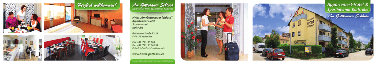Appartement-Hotel & Appartement-Hotel Sportinternat Karlsruhe Hotel „Am Gottesauer Schloss” Appartement-Hotel Sportinternat Karlsruhe Gottesauer Straße 32-34 D-76131 Karlsruhe Fon: +49 (721) 35 560 Fax: +49 (721) 35 56 199 E-Mail: [email protected] www.hotel-gottesau.de Firmensitz: SLB Immobilien GmbH, Kaiserallee 87, 76185 Karlsruhe Sportinternat Karlsruhe Wir bieten Ihnen komfortable und ruhige Business-Appartements, die speziell für Geschäftsreisende konzipiert wurden. Auch ein längerer Aufenthalt kann hier angenehm verbracht werden, da unsere großzügig dimensionierten Appartements mit einer Kleinküche, Haarfön, TV und Telefon ausgestattet sind. g Ostrin Bundesverfassungsgericht Mühlburger Tor Schloßplatz Europaplatz (Kaiserstr.) Marktplatz (Pyamide) Herrenstr. Unser reichhaltig bestücktes Frühstücksbuffet ist die Grundlage für den Start in Ihren erfolgreichen Tag. Kronenplatz (Kaiserstr.) e Kriegstraß Kriegstraße Got tes a Ludw ig-E rhar d-All Ettlinger Tor Ettlinger Str. ee Stra ß e her Alle e Tullastraße Autobah n Frankf Messplatz tr. er S eier rtsw lfa Wo raße r St arte tg Stut Das Hotel am Gottesauer Schloss liegt in einer verkehrsarmen Straße und ist somit der optimale Standort für ruhiges und zentrales Wohnen in Karlsruhe. Das Hotelappartement liegt in der Oststadt Karlsruhe und ist mit dem Auto leicht zu erreichen. Das Hotel ist 2 Minuten zu Fuß von der „Gottesauer Platz/ BGV“ Straßenbahnhaltestelle entfernt: ring Südstadt Brauerstraße Durlac Ost Stadtgarten Südweststadt uer Hotel am Gottesauer Schloss Rüppurrer Str. Staatliche Hochschule für Gestaltung / ZKM Kap Gottesauer Platz / BGV ße stra n elle Anfahrtsbeschreibung mit dem Auto Wegbeschreibung zu Fuß Oststadt Durlacher Tor Durlach e Wolfartsweierer Str. Fritz-Erler-Straße Ettlingen Tor Kongresszentrum Kaiserstraße r Allee Landessammlungen für Naturkunde Kriegstraße ilhe l-W Kar Lage e ß Stra lm- Kaiserstraße e ß Stra u-Ne und Haid r. Kaiserallee Universität Karlsruhe KIT Bun te S t Innenstadt-West Adenauerring Schloss Karlsruhe g Ostrin Für unsere Gäste steht ein kostenloser Internetzugang per WLAN zur Verfügung. Die Stellplätze direkt vor dem Hotel, bieten Ihnen die ideale Parkmöglichkeit. Karlsruhe Autobahn Frankfurt / Basel urt / B asel 1. Laufen Sie südlich der Buntestraße entlang bis zur Gottesauer Straße. 2. Biegen Sie dort links ab und nehmen Sie die 3. rechte Abbiegung. Sie befinden sich direkt vor unserem Hotelappartement. S4 S5 1 2 Nehmen Sie die Autobahnausfahrt „Karlsruhe-Mitte“ der A5. Dort gelangen Sie auf die B10 und folgen der Spur bis zur Ausfahrt Richtung Oststadt. Anschließend im Kreisverkehr geradeaus auf der Wolfartsweierer Straße bleiben und an der nächsten Kreuzung links abbiegen. Biegen Sie an der 2. Abbiegung erneut links ab und Sie haben uns erreicht.