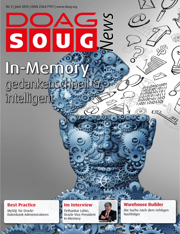 News Nr. 3 | Juni 2015 | ISSN 2364-7191 | www.doag.org In-Memory gedankenschnell & intelligent Best Practice Im Interview Warehouse Builder MySQL für OracleDatenbank-Administratoren Tirthankar Lahiri, Oracle Vice President In-Memory Die Suche nach dem richtigen Nachfolger . .09 0 3 rd bis ly Bi Ear nm de el n! J et a zt 2015 17. - 20. November Nürnberg einer t k e j o r P T I Weil jedes nelt. h ä t r h a F g Raftin Eventpartner: 2015.doag.org Editorial Liebe Mitglieder, liebe Leserinnen und Leser, Christian Trieb Mitglied des Vorstands und Leiter der DOAG Datenbank Community „In-Memory“ nimmt heutzutage in der Datenverarbeitung und damit auch in der Oracle-Welt einen immer höheren Stellwert ein. Seit Mitte des Jahres 2014 ist die In-Memory-Option für die Oracle-Datenbank verfügbar. Ist es nur ein kurzfristiger Hype oder hat dies langfristige Auswirkungen, wie funktioniert diese Technologie überhaupt, wann ist es sinnvoll, In-Memory einzusetzen und ergibt dies bei einer Exadata-Datenbank-Maschine überhaupt Sinn? Diese und weitere Fragestellungen werden in dieser Ausgabe diskutiert und beantwortet. Für mich persönlich ist die Frage nach dem Einsatz der In-Memory-Option im Exadata-Umfeld eine sehr spannende Fragestellung, denn eine Exadata-Datenbank-Maschine verfügt gerade in der neuesten Version X5 über sehr viel Flash-Speicher. Kann man die Performance mit der In-Memory-Technologie nochmal beschleunigen oder muss man hier andere Ansätze wählen? Ob Flash-Speicher und In-Memory ein Widerspruch oder eine Ergänzung darstellen, ist eine der praktischen Aufgabenstellungen, die es mit entsprechenden Tests zu bewältigen gilt. Diese Ausgabe der DOAG/SOUG-News gibt dafür entsprechende Hilfestellungen, führt in die Thematik ein, beschreibt die Funktionsweise und beantwortet damit die gestellten Fragen. Ganz besonders freut es mich, das der Interviewpartner in diesem Heft, Tirthankar Lahiri, Oracle Vice President Data Technologies and Times Ten, auf der DOAG 2015 Konferenz + Ausstellung im November in Nürnberg teilnimmt, um über die neuesten Entwicklungen von Oracle in diesem Bereich zu informieren. Ich wünsche Ihnen viel Spaß beim Lesen dieser Ausgabe und eine gute Sommer- und Urlaubszeit. Ihr APEX 5 steht in den Startlöchern, wir auch … 5 Gründe, die für uns sprechen: 1. 100 durchgeführte APEX-Schulungen 2. 10 Jahre APEX-Erfahrung 3. 300 geschulte Teilnehmer 4. 5 verschiedene APEX-Kurse im Programm 5. Mehr als 5 Oracle APEX-Consultants in unserem Haus Besuchen Sie uns unter www.muniqsoft.de/apex DOAG/SOUG News 03-2015 3 Inhalt 61 39 57 Der Prototyp eines Docker-Containers zeigt was machbar ist und liefert praktische Erfahrungen Erfahrene Oracle-DBAs kennen ihre Datenbanken aus dem Effeff, sind bei MySQLDatenbanken aber etwas ratlos Die Auswahl des Character Sets entscheidet beim Anlegen über die zur Verfügung stehenden Zeichen der Datenbank Einleitung Datenbank Data Warehouse 3Editorial 35 Maximum Availability Architecture trifft 46 OWB – Wie finde ich den richtigen 5 DOAG/SOUG Timeline auf Oracle Multitenant Ludovico Caldara 39 Daten-Visualisierung in Oracle 12c mit Docker-Containern Frank Pachot Nachfolger? Michael Klose 49 OWB ohne OWB: Wie rette ich meine ETL-Sourcen nach 12cR2? Sven Bosinger 41 Oracle Coherence: In-Memory-Computing für Einsteiger Gabriele Jäger und Michael Fuhr In-Memory 7 9 „Die In-Memory-Option ist vollständig in die Oracle-Datenbank integriert…“ Interview mit Tirthankar Lahiri 10 wichtige Fragen und Antworten zur Oracle-Datenbank-12c-In-MemoryOption Markus Kißling 12 Mit Rat und Tat: Der Database-In-Memory-Advisor Ileama Someșan 53 Mit „Smart Replication“ Daten effizient, robust und flexivel verteilen Carsten Kaftan 57 MySQL für Oracle-DBAs Oli Sennhauser 29 In-Memory-Computing mit der OracleDatenbank 11gR2 Matthias Weiss 4 www.doag.org / www.soug.ch lernen, verstehen Carsten Wiesbaum genug Martin Hoermann 65 Oracle 12c Automatic Performance Diagnostics Angelika Gallwitz DOAG/SOUG intern 73 Neue Mitglieder 74 Impressum HANA Stefan Menschel In-Memory Alfred Schlaucher 70 Metadata Service Respository – sehen, 61 Character Sets – die Welt ist nicht 15 Oracle Database In-Memory vs. SAP 18 Visualisierung im Data Warehouse mit Entwicklung 74Termine Aktuell 14 Der neue DOAG-Vorstand 56 Delegiertenversammlung: DOAG soll offener und internationaler werden 74 Inserentenverzeichnis Timeline DOAG/SOUG Timeline 13. März 2015 Die letzte Vorstandssitzung der DOAG in dieser Wahlperiode bereitet die Delegiertenversammlung am 8. und 9. Mai in Berlin vor, auf der der neue Vorstand gewählt wird. Zweiter wichtiger Punkt ist die Programmgestaltung der DOAG 2015 Konferenz in Nürnberg. Dazu wird ein Team aufgestellt, dessen Mitglieder jeweils die Vortragsauswahl eines Streams betreuen. 18. März 2015 Beim Redaktionsmeeting im Berliner DOAG-Office geht es um die Feinabstimmung in der Herstellung der Zeitschriften sowie um Synergien zwischen DOAG Online und den Printmedien. Ein weiteres Thema ist die Übergabe der Presse- und Öffentlichkeitsarbeit von Wolfgang Taschner an Mylène Diacquenod. Wolfgang Taschner, der mehr als 15 Jahre die Presselandschaft für die DOAG betreut hat, ist weiterhin als Chefredakteur für alle Zeitschriften der DOAG zuständig. der Ernst & Young AG. Die im Anschluss an die Generalversammlung stattfindende SIG-Veranstaltung ist mit drei Streams und insgesamt zwölf Vorträgen schon fast eine Konferenz „light”. 24. März 2015 Rund tausend Java-Begeisterte besiedeln das JavaLand im Phantasialand in Brühl. Neben mehr als hundert spannenden Java-Vorträgen und Community-Aktivitäten erleben sie die Attraktionen des Erlebnisparks. Die einmalige Mischung aus Spaß, Community und Technologie ist damit auch in der zweiten Auflage der Java-Konferenz ein voller Erfolg. Fried Saacke, DOAG-Geschäftsführer und Vorstandsvorsitzender des Interessenverbunds der Java User Groups e.V. (iJUG), eröffnet die Veranstaltung mit e