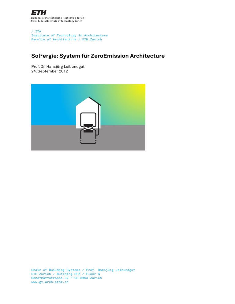 / ITA Institute of Technology in Architecture Faculty of Architecture / ETH Zurich Sol²ergie: System für ZeroEmission Architecture Prof. Dr. Hansjürg Leibundgut 24. September 2012 Chair of Building Systems / Prof. Hansjürg Leibundgut ETH Zurich / Building HPZ / Floor G Schafmattstrasse 32 / CH-8093 Zurich www.gt.arch.ethz.ch / ITA Institute of Technology in Architecture Faculty of Architecture / ETH Zurich 24.09.12 SOL²ERGIE: SYSTEM FÜR ZEROEMISSION ARCHITECTURE Seite 2/13 Seit jeher stand die Architektur bzw. das Bauen im Spannungsfeld zwischen Funktionalität und Form. Gebäude wurden und werden gebaut, um dem Menschen Schutz zu bieten vor allen möglichen Gefahren. Der Innenraum soll besser sein als der Aussenraum. Die Gebäudehülle trennt den Innen- und Aussenraum mit dem Zweck innen einen anderen Zustand zu haben als aussen. i Abb. 1 a Innenraum/Aussenraum Die wichtigste Aufgabe der Hülle ist es, den Menschen im Innern vor Nässe und zu grosser Windgeschwindigkeit zu schützen. Mit dem Bau der Hüllen handelte sich der Mensch zwei wesentliche Probleme ein: 1. Solange die Hüllen dicht aber nicht transparent für das Sonnenlicht waren, war es im Innenraum zu dunkel 2. Dichte Hüllen bewirkten einen Anstieg der Konzentration unerwünschter Gase im Innenraum (ausgeatmetes CO2, Kohlenmonoxid von Feuerungen, unverbrannte Kohlenwasserstoffe von Kerzen, Gerüche aller Art.) Will man im Winter die Temperatur innen deutlich höher halten als aussen, muss man eine dichte Hülle und eine Wärmequelle im Raum haben. Die Wärmequelle muss künstlich erzeugt und stetig mit Energie gespiesen werden. / ITA Institute of Technology in Architecture Faculty of Architecture / ETH Zurich 24.09.12 SOL²ERGIE: SYSTEM FÜR ZEROEMISSION ARCHITECTURE Seite 3/13 Abb. 2 Holz als Energiespeicher Der fatale Irrtum war, dass man Holz als primäre Energiequelle bezeichnete. Hätte man Holz als Energiespeicher und die Solarstrahlung als Primärquelle bezeichnet, dann wären viele Dinge anders gekommen. (Bemerkung: an der Weltaustellung in Paris 1878 lief eine Dampfmaschine im Brennpunkt eines Parabolspiegels, der der Sonne nachgeführt wurde.) Abb. 3 Solarer Dampferzeuger von A. Mouchot auf der Pariser Weltausstellung 1878 Die Häuser des 18. und 19. Jahrhunderts waren dunkel und brauchten sehr viel Holz zur Beheizung. / ITA Institute of Technology in Architecture Faculty of Architecture / ETH Zurich 24.09.12 SOL²ERGIE: SYSTEM FÜR ZEROEMISSION ARCHITECTURE Seite 4/13 Abb. 4 Wohnhaus im 19. Jahrhundert Im Innern stank es. Ende des 19. Jahrhunderts produzierte die neue Industrie neue Materialien. Vier davon (Profile in Stahl, Flachglas, Dachpappe und Zement), die Einführung der Kohle als Ersatz für das Holz und die Erfindung der Elektrizität mit den entsprechenden Apparaten ermöglichten zu Beginn des 20. Jahrhunderts den revolutionären und radikalen Bauhaus-Stil. Abb. 5 Wohnhaus der Moderne Die Dachpappe führte zum Flachdach. Stahlprofile und Glas wurden zu grossen transparenten Fassadenteilen kombiniert. Der Elektromotor trieb Pumpen und Ventilatoren an. Die elektrische Glühbirne ersetzte Kerzen und Gaslampen. Der Innenraum wurde hell, die Luftqualität deutlich besser. Die neue „Primärquelle“ Kohle ermöglichte es, den Wärmeerzeuger in den Keller zu verbannen. Alles schien gut zu sein. 100 Jahre nach dieser Revolution muss konstatiert werden, dass die im Bauhausstil gebauten Häuser heute prak- / ITA Institute of Technology in Architecture Faculty of Architecture / ETH Zurich 24.09.12 SOL²ERGIE: SYSTEM FÜR ZEROEMISSION ARCHITECTURE Seite 5/13 tisch nicht mehr betrieben werden können. Die Gebäude brauchen zu viel Wärme und sie sind angewiesen auf eine Energieform mit hoher Betriebstemperatur. War der konstruktiv sehr einfache und formal überzeugende Bauhausstil ein Irrläufer? Es wäre einfacher, diese Frage mit „ja“ zu beantworten, wenn die Bauten danach – vor allem ab den Jahren ca. 1975 – sehr viel besser wären. Die Konstruktionen wurden aber leider immer aufwändiger, weil man Primärenergie Kohle, Öl, Gas und Uran sparen wollte und musste. Abb. 6 Hochgedämmte Fassade Man investierte in die Gebäudehülle, um sogenannte Primärenergie zu sparen. Seit 1985 treiben die Begriffe Energieeffizienz und Energiesparen die Bauindustrie zu absurden Konstruktionen. Die 3-fach Isolierverglasung ist bei grossen Fenstern derart schwer, dass die Rahmenkonstruktion ganze Häuser tragen könnte. Die Wärmerückgewinnung aus der Abluft führt zu dichten Gebäuden und damit zu grotesken Verklebungen, zu hoch komplizierten Fensterprofilen mit Mehrfachdichtungen und zu schweren Beschlägen. Die sehr gute Wärmedämmung führt zu Pilzbefall der Putze. Der Anteil an hochwertigem Material und hochwertiger Energie zur Produktion einer Einheit Haus hat sich innerhalb von 100 Jahren mindestens verdoppelt. Die Bauindustrie ist in eine Sackgasse gefahren. Staatlich gefordert und gefördert. Gefordert ist eine Renaissance der Bauhaus-Idee. Radikale Vereinfachung der Konstruktion und ein Ersatz der vermeintlichen Primärenergien Kohle, Öl, Gas und Holz durch die wirkliche Primärenergie: durch die Strahlungsenergie der Sonne. Die heute noch als Primärenergieträger bezeichneten chemischen Moleküle des Holzes, der Kohle, des Öls und des Erdgases wurden produziert durch den Prozess der Photosynthese aus Solarstrahlung, Wasser und CO2. Da der Wirkungsgrad der Photosynthese mit weniger als 1% sehr klein ist, beansprucht ein Haus mit Verbrennungsöfen viel Wald. Junger Wald beim Holz, sehr alter Wald bei der Kohle und dem Öl. Bei einer Heizenergiekennzahl von 50 kWh/m2a braucht es eine Waldfläche von 5 m2, um den Ofen nachhaltig zu beliefern. Ein Baum muss 40 Jahre wachsen, bevor es sich lohnt, ihn zu schlagen. Er speichert Energie, ist nicht eine primäre Quelle. Kohle ist nichts anderes als sehr speziell gelagertes mindestens 40-jähriges Holz. Öl stammt aus den sehr speziell gelager- / ITA Institute