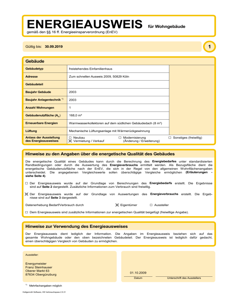 ENERGIEAUSWEIS für Wohngebäude gemäß den §§ 16 ff. Energieeinsparverordnung (EnEV) 1 Gültig bis: 30.09.2019 Gebäude Gebäudetyp freistehendes Einfamilienhaus Adresse Zum schnellen Ausweis 2009, 50829 Köln Gebäudeteil Baujahr Gebäude 2003 Baujahr Anlagentechnik 1) 2003 Anzahl Wohnungen 1 Gebäudenutzfläche (AN) 168,0 m² Erneuerbare Energien Warmwasserkollektoren auf dem südlichen Gebäudedach (8 m²) Lüftung Mechanische Lüftungsanlage mit Wärmerückgewinnung Anlass der Ausstellung des Energieausweises Neubau Vermietung / Verkauf Modernisierung (Änderung / Erweiterung) Sonstiges (freiwillig) Hinweise zu den Angaben über die energetische Qualität des Gebäudes Die energetische Qualität eines Gebäudes kann durch die Berechnung des Energiebedarfes unter standardisierten Randbedingungen oder durch die Auswertung des Energieverbrauchs ermittelt werden. Als Bezugsfläche dient die energetische Gebäudenutzfläche nach der EnEV, die sich in der Regel von den allgemeinen Wohnflächenangaben unterscheidet. Die angegebenen Vergleichswerte sollen überschlägige Vergleiche ermöglichen (Erläuterungen siehe Seite 4). Der Energieausweis wurde auf der Grundlage von Berechnungen des Energiebedarfs erstellt. Die Ergebnisse sind auf Seite 2 dargestellt. Zusätzliche Informationen zum Verbrauch sind freiwillig. Der Energieausweis wurde auf der Grundlage von Auswertungen des Energieverbrauchs erstellt. Die Ergebnisse sind auf Seite 3 dargestellt. Datenerhebung Bedarf/Verbrauch durch Eigentümer Aussteller Dem Energieausweis sind zusätzliche Informationen zur energetischen Qualität beigefügt (freiwillige Angabe). Hinweise zur Verwendung des Energieausweises Der Energieausweis dient lediglich der Information. Die Angaben im Energieausweis beziehen sich auf das gesamte Wohngebäude oder den oben bezeichneten Gebäudeteil. Der Energieausweis ist lediglich dafür gedacht, einen überschlägigen Vergleich von Gebäuden zu ermöglichen. Aussteller: Energymeister Franz Steinhauser Oberer Markt 63 87634 Obergünzburg 01.10.2009 Datum 1) Mehrfachangaben möglich Hottgenroth Software, HS Verbrauchspass 2.5.31 Unterschrift des Ausstellers ENERGIEAUSWEIS für Wohngebäude gemäß den §§ 16 ff. Energieeinsparverordnung (EnEV) Adresse Zum schnellen Ausweis 2009 50829 Köln Berechneter Energiebedarf des Gebäudes 2 Energiebedarf CO2-Emissionen 1) 0 50 100 150 200 Anforderungen gemäß EnEV 2) 250 300 350 kg/(m²a) >400 Für Energiebedarfsberechnungen verwendetes Verfahren Primärenergiebedarf Ist-Wert kWh/(m² a) Anforderungswert kWh/(m² a) Ist-Wert W/(m² K) Verfahren nach DIN V 4108-6 und DIN V 4701-10 Verfahren nach DIN V 18599 Energetische Qualität der Gebäudehülle H'T Anforderungswert W/(m² K) Vereinfachungen nach § 9 Abs. 2 EnEV eingehalten Sommerlicher Wärmeschutz (bei Neubau) Endenergiebedarf Jährlicher Endenergiebedarf in kWh/(m²a) für Energieträger Heizung Ersatzmaßnahmen 3) Warmwasser Hilfsgeräte 4) Gesamt in kWh/(m²a) Vergleichswerte Endenergiebedarf Anforderungen nach § 7 Nr. 2 EEWärmeG Die um 15% verschärften Anforderungswerte sind eingehalten. Anforderungen nach § 7 Nr. 2 i. V. m. § 8 EEWärmeG Die Anforderungswerte der EnEV sind um % verschärft Primärenergiebedarf Verschärfter Anforderungswert kWh/(m² a) Transmissionswärmeverlust H'T Verschärfter Anforderungswert W/(m² K) 5) Erläuterungen zum Berechnungsverfahren Die Energieeinsparverordnung lässt für die Berechnung des Energiebedarfs zwei alternative Berechnungsverfahren zu, die im Einzelfall zu unterschiedlichen Ergebnissen führen können. Insbesondere wegen standardisierter Randbedingungen erlauben die angegebenen Werte keine Rückschlüsse auf den tatsächlichen Energieverbrauch. Die ausgewiesenen Bedarfswerte sind spezifische Werte nach der EnEV pro Quadratmeter Gebäudenutzfläche (AN). 1) 3) 5) 2) freiwillige Angabe bei Neubau sowie bei Modernisierung im Falle des §16 Abs. 1 Satz 2 EnEV 4) nur bei Neubau im Falle der Anwendung von § 7 Nr. 2 Erneuerbare-Energien-Wärmegesetz ggf. einschließlich Kühlung EFH: Einfamilienhäuser, MFH: Mehrfamilienhäuser Hottgenroth Software, HS Verbrauchspass 2.5.31 ENERGIEAUSWEIS für Wohngebäude gemäß den §§ 16 ff. Energieeinsparverordnung (EnEV) Adresse Zum schnellen Ausweis 2009 50829 Köln Erfasster Energieverbrauch des Gebäudes 3 Energieverbrauchskennwert Dieses Gebäudes 48,5 0 50 kWh/(m² a) 100 150 Energieverbrauch für Warmwasser: 200 250 enthalten 300 350 >400 nicht enthalten Das Gebäude wird auch gekühlt; der typische Energieverbrauch für Kühlung beträgt bei zeitgemäßen Geräten etwa 6 kWh je m² Gebäudenutzfläche und Jahr und ist im Energieverbrauchskennwert nicht enthalten. Verbrauchserfassung - Heizung und Warmwasser Energieträger Heizöl Heizöl Heizöl Holzpellets Holzpellets Holzpellets Zeitraum von 01.09.2006 01.09.2007 01.09.2008 01.09.2006 01.09.2007 01.09.2008 Energieverbrauch [kWh] bis 31.08.2007 31.08.2008 31.08.2009 31.08.2007 31.08.2008 31.08.2009 5403 4768 6058 1063 1901 995 Anteil Warmwasser [kWh] 2688 3040 3028 0 0 0 Klimafaktor 1,65 1,28 1,20 1,65 1,28 1,20 Energieverbrauchskennwert in kWh/(m²a) (zeitlich bereinigt, klimabereinigt) Heizung 26,7 13,1 21,6 10,4 14,4 7,1 Für die Berechnung des Energieverbrauchskennwerts berücksichtigte Zeitperiode: 01.09.2006 - 31.08.2009 Warmwasser 16,0 18,0 18,0 0,0 0,0 0,0 Durchschnitt Kennwert 42,7 31,2 39,7 10,4 14,4 7,1 48,5 Vergleichswerte Endenergiebedarf 1) Die modellhaft ermittelten Vergleichswerte beziehen sich auf Gebäude, in denen Wärme für Heizung und Warmwasser durch Heizkessel im Gebäude bereitgestellt wird. Soll ein Energieverbrauchskennwert verglichen werden, der keinen Warmwasseranteil enthält, ist zu beachten, dass auf die Warmwasserbereitung je nach Gebäudegröße 20 - 40 kWh/(m²a) entfallen können. Soll ein Energieverbrauchskennwert eines mit Fern- oder Nahwärme beheizten Gebäudes verglichen werden, ist zu beachten, dass hier normalerweise ein um 15 