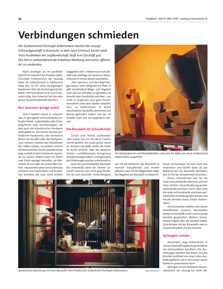 Dorfpost 324/11. Mai 2016 • www.gv-kuesnacht.ch 16 Verbindungen schmieden Der Goldschmied Christoph Krähenmann besitzt das einzige Schmuckgeschäft in Küsnacht, in dem noch Schmuck kreiert wird. Trotz Ausbleiben der Laufkundschaft, läuft sein Geschäft gut. Das hat er unteranderem der kreativen Werbung und seiner offenen Art zu verdanken. Noch wichtiger als ein perfekter Auftritt ist natürlich das Produkt selbst. Christoph Krähenmann, der dreissig Jahre als Goldschmied in Kalifornien tätig war, ist für seine einzigartigen Kreationen über die Kantonsgrenze bekannt. Seit fünf Jahren ist er nun in Küsnacht tätig. Sein Schmuck hat ihm eine grosse Stammkundschaft beschert. Nur Jammern bringt nichts Und trotzdem müsse er schauen, dass er genügend Schmuckstücke verkaufen könne. Ladensterben oder Dumping-Preise sind Erscheinungen, vor dem auch das künstlerische Handwerk nicht gefeit ist. Der Online-Handel, ausländische Konkurrenz, das vermehrte Reisen der Kunden oder die HochpreisInsel Schweiz machen den Detaillisten das Leben schwer. Ausserdem werfen die Konsumenten heute schneller etwas weg, anstatt es beim Fachmann reparieren zu lassen. Krähenmann ist davon zum Glück weniger betroffen, da Edelmetall, ob neu oder alt, seinen Wert behält. «Ausserdem seien Schmuckstücke meistens mit Geschichten und Emotionen behaftet, die man nicht einfach weggeben will». Krähenmann hat deshalb viele Aufträge, bei denen er «alten» Schmuck in etwas Neues umarbeitet. «Nur Jammern und den Kopf hängen lassen, wäre völlig fehl am Platz. Es gibt verschiedene Wege, sein Angebot nach wie vor attraktiv zu gestalten. Es braucht aber Kreativität und Mut – um nicht zu vergessen; eine gute Zusammenarbeit unter den lokalen Detaillisten», so Krähenmann. Er kennt verschiedene Geschäfte, die bereits ihre Nische gefunden haben, mit der sie Kunden nach wie vor begeistern können. Die Baustelle im Schaufenster Zurück zum Thema Laufkunden: «Die haben bei mir Am Bach 7 schon immer gefehlt. Die Leute gehen kaum an meinem Geschäft vorbei, die Pendler-Achse verläuft über die Allmendstrasse », so Krähenmann. Eine genaue Standortanalyse habe er nicht gemacht, die Erfahrungen reichen, schmunzelt er. Auch die Gemeindeplatz-Baustelle, die eineinhalb Jahre vor seinem Geschäft rumorte, war nicht grad förderlich für sein Geschäft. «Eines Morgens Die Holzskulpturen und Metallplastiken sind noch bis Mitte Juni beim Goldschmied Krähenmann ausgestellt. sah ich die Reflexion der Baustelle in meinem Schaufenster und merkte plötzlich, dass ich die Möglichkeit habe, das Negative der Baustelle, in etwas Po- sitives umzusetzen. Ich liess mich also inspirieren und durfte dann all das Material von der Baustelle benützen, das ich für das Schaufenster brauchte.» Dieses Schaufenster war für ihn einen entscheidender Moment, sich mit einer solchen Herausforderung positiv auseinanderzusetzen. Auch, dass man die Leute mit Kreativität und einer optimistischen Einstellung überraschen und Freude bereiten kann, freute Krähenmann. Die Küsnachter wollten sich dieses Schaufenster ansehen, Neukunden kamen im Geschäft vorbei und es wurde darüber gesprochen. Weitere Schaufenster folgten über die das Dorf redete. Zum Beispiel mit der Feuerwehr oder in Zusammenarbeit mit der Floristin. Synergien nutzen Symbiotische Beziehung mit einer Baustelle? Kein Problem für Goldschmid Christoph Krähenmann. (Peps Dändlicher) Ausserdem zeigt Krähenmann in seinem Geschäft regelmässig die Werke von befreundeten Künstlern. Die Ausstellungen beleben den Raum und der Künstler profitiert von einer tollen Ausstellungsfläche, wo er sich einem neuen Publikum präsentieren kann. Synergien ist das Stichwort, Zusammenarbeit die Lösung für mehr Be- Dorfpost 324/11. Mai 2016 • www.gv-kuesnacht.ch 17 Aktuell die Ausstellung von Peter Aerne Einige von Künstler Peter Aernes Holzskulpturen und Metallplastiken sind noch bis Mitte Juni im Atelier von Christoph Krähenmann ausgestellt. Die Kunstwerke harmonieren ausgezeichnet mit den feinen Schmuckstücken und den Werkzeugen in Krähenmanns Atelier. Wie der Goldschmied arbeitet Peter Aerne neben Holz auch mit Metall. Anders als Krähmann bearbeitet Aerne seine Kunstwerke aber mit grösserer Gerätschaft und wendet für seine Metallkunst die Schweisstechnik an. Ausserdem beweist er sein künstlerisches Geschick in der Steinbearbeitung. Das Atelier von Krähenmann ist Geschäft und Werkstatt in einem. kanntheit und Attraktivität. Neben gemeinsamen Schaufenstern, dem Teilen von Räumlichkeiten oder bestehende Projekte wie die Dorfchilbi, an der das Gewerbe auch gemeinsame Sache macht, könnte man sich weitere Kooperationen vorstellen. Zum Beispiel gemeinsame Online-Auftritte oder Veranstaltungen, die vermehrt in Zusammenarbeit stattfinden. Die Möglich- keiten für eine grössere Reichweite und Wahrnehmung sind vielseitig und interessant und tragen schlussendlich zu einem attraktiven und belebtem Dorf bei. rew Aerne wuchs in Sursee auf, als junger Erwachsener zog es ihn dann nach Zürich. Nach abwechslungsreichen Jahren in der Stadt, kam er im Jahr 2003 nach Küsnacht, wo er seither lebt und arbeitet. Von Revolutionen und verfluchten Streichquartetten Drei besondere Werke von grossen Meistern werden am 22. Mai vom Belenus Quartett im Seehof aufgeführt. Bestehend aus Seraina Pfenninger und Anne Battegay mit ihren Violinen und Esther Fritzsche an der Viola sowie Jonas Vischi am Violoncello, spielt das Quartett drei auserlesene Werke von Beethoven, Schnittke und Edward Grieg. Letzterer bezeichnete sein komponiertes Streichquartett in F-Dur als «unseliges Streichquar-tett, das ewig herum liegt wie alter norwegischer Käse». Ein Meisterwerk ist daraus entstanden, das Grieg selber nie zu hören bekam. Alfred Schnittkes Bemerkungen zu seiner eigenen Musik waren nicht so kritischer Natur. Er wollte komponieren «ohne konstruktive Regeln». Auf diese verzichtet er gekonnt in seinem 3. Stre