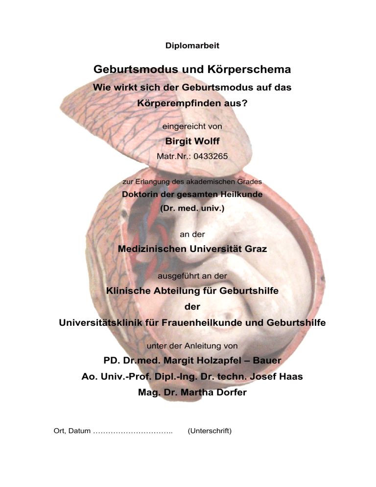 Diplomarbeit Geburtsmodus und Körperschema Wie wirkt sich der Geburtsmodus auf das Körperempfinden aus? eingereicht von Birgit Wolff Matr.Nr.: 0433265 zur Erlangung des akademischen Grades Doktorin der gesamten Heilkunde (Dr. med. univ.) an der Medizinischen Universität Graz ausgeführt an der Klinische Abteilung für Geburtshilfe der Universitätsklinik für Frauenheilkunde und Geburtshilfe unter der Anleitung von PD. Dr.med. Margit Holzapfel – Bauer Ao. Univ.-Prof. Dipl.-Ing. Dr. techn. Josef Haas Mag. Dr. Martha Dorfer Ort, Datum ………………………….. (Unterschrift) Eidesstattliche Erklärung Ich erkläre ehrenwörtlich, dass ich die vorliegende Arbeit selbstständig und ohne fremde Hilfe verfasst habe, andere als die angegebenen Quellen nicht verwendet habe und die den benutzten Quellen wörtlich oder inhaltlich entnommenen Stellen als solche kenntlich gemacht habe. Graz, am Unterschrift i Vorwort Viele Frauen beschäftigen sich während der Schwangerschaft und auch schon davor mit der Thematik der Geburt. In der heutigen Zeit ist es durchaus kein Muss mehr, spontan zu gebären, denn es besteht die Möglichkeit des so genannten „Wunschkaiserschnitts“. Er wird ohne medizinische Indikation und lediglich auf Wunsch der werdenden Mutter durchgeführt. Gründe für diese Überlegungen sind nicht nur die Auseinandersetzung mit dem Thema „Schmerzen unter der Geburt“, sondern auch die Frage, ob sich durch die Art der Geburt etwas verändert. Viele Frauen haben dabei auch um ihre Sexualität Angst, geschürt durch Slogans wie „save your love channel do a cesarean“ - ein Thema, welches in den verschiedenen Foren im Internet heiß diskutiert wird ( etwa 33.600 Treffer bei Google). Dies waren auch meine bzw. die Überlegungen von Frau PD. Dr. med. Margit Holzapfel-Bauer, Herrn ao. Univ.-Prof. Dipl.-Ing. Dr. techn. Josef Haas und Frau Mag. Dr. Martha Dorfer, welche uns zu dieser Studie inspiriert haben. Die grundsätzliche Fragestellung war, ob es gravierende Unterschiede im Schmerzempfinden und im Körperschema zwischen vaginaler Entbindung und Kaiserschnitt gibt. Nach reiflichen Überlegungen und gründlicher Planung startete ich schließlich in Zusammenarbeit mit meinen Betreuern am 29.9.2009 nach positivem Ethikkommissionsvotum die Studie für diese Diplomarbeit. Für die Rekrutierung der Schwangeren war bis zu ihrem Weggehen von der Frauenklinik des LKH Graz (UFK) Frau PD. Dr. Holzapfel-Bauer zuständig und dies wurde danach von Frau Mag. Dr. Dorfer und mir übernommen. In den darauffolgenden beinahe zwei Jahren wurden insgesamt mehr als 290 Studienteilnehmerinnen rekrutiert, in die Gruppen „vaginale Geburt“ und „Sectio“ eingeteilt und befragt. Da es leider nicht immer so einfach war die passenden Frauen zu gewinnen, konnte die Gruppe „Sectio“ bis zum Ende meines Studiums nicht abgeschlossen werden. (Die Studie läuft aber unabhängig davon weiter.) Auf Grund dessen bezieht sich die Diplomarbeit ausschließlich auf die „vaginale“ Gruppe. ii Danksagungen Großer Dank gilt meinen Betreuern, die mich bei der Planung, der Arbeit zur Studie und der Diplomarbeit großartig unterstützt haben und mir jederzeit beratend zur Seite standen. Bedanken möchte ich mich auch bei meinen Eltern und meiner Familie, die mir das Studium ermöglicht haben und mir immer unterstützend zur Seite stehen. Danken möchte ich auch den Schwestern des Gebärhauses unter der Leitung von Frau Sr. Brigitte Amon, Frau Sr. Elke Höflechner und Frau Sr. Elisabeth ZierlerMatzer, welche mir stets freundlich und hilfsbereit entgegengekommen sind. Des Weiteren möchte ich mich bei allen bedanken, die meine Arbeit Korrektur gelesen haben, allen voran Frau Claudia Stoiser, MA und meinem Partner Gernot Steyer. Ich danke auch Herrn PD Dr. Rainer Pöppinghege, welcher mir seine Broschüre über die Geschichte der Geburtshilfe und Gynäkologie zukommen ließ. iii Zusammenfassung In der vaginalen Gruppe wurden 110 Frauen zu insgesamt drei Zeitpunkten befragt. Den ersten Fragebogen (Frankfurter Körperkonzeptskalen) erhielten sie in etwa zehn Tage vor der Geburt. Eine Befragung über die Schmerzen während der Geburt wurde im Wochenbett durchgeführt und für die dritte Befragung wurden die Fragebögen per Post nach einem halben Jahr zugeschickt. Die Studienteilnehmerinnen gebaren meist in der 40. Schwangerschaftswoche, es war das erste Kind und das durchschnittliche Alter betrug 30 Jahre. Bei 74,5% war kein Eingreifen in die Geburt nötig, bei 25,5% wurde aufgrund eines pathologischen CTGs (15,5%) oder eines Geburtsstillstandes (5,5%) interveniert. Die häufigsten schmerzstillenden Mittel waren Nalbuphin (35,5%), Buscopan (19,1%) und die Periduralanästhesie (18,2%); 27,3% erhielten keine Schmerzstillung. Frankfurter Körperkonzeptskalen In der Auswertung wurde das Empfinden der Frauen in folgenden Skalen negativer: - Skala zur Selbstakzeptanz des Körpers - Skala zur Akzeptanz des Körpers durch andere - Skala zum Körperkontakt - Skala zu Aspekten der körperlichen Erscheinung - Skala zur Gesundheit und zum körperlichen Befinden - Skala zur Pflege des Körpers und der äußeren Erscheinung Die Skalen zur Sexualität und zu dissimilatorischen Körperprozessen blieben nahezu unverändert und die Einschätzungen in der Skala zur körperlichen Effizienz wurden positiver. Schmerzfragebogen Das Schmerzempfinden der Frauen in der Eröffnungsphase stieg im Vergleich zum Wochenbett an, das der Austreibungs- und Plazentaphase sank. Auch die iv postpartalen Schmerzen wurden ein halbes Jahr später als stärker empfunden und die Studienteilnehmerinnen fühlten sich im Wochenbett stärker durch die Dauer und Intensität der Schmerzen beeinträchtigt. 91,9% waren mit ihrer Geburtsmethode zufrieden, 22,7% hatten nach sechs Monaten noch Schmerzen, jedoch benötigten nur 1,8% Schmerzmittel. Diese waren meist ziehend und situationsabhängig im Genitalbereich durch Geschlechtsverkehr ausgelöst. 90,9% fühlt