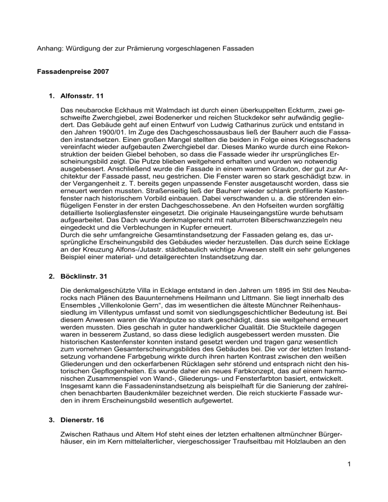 Anhang: Würdigung der zur Prämierung vorgeschlagenen Fassaden Fassadenpreise 2007 1. Alfonsstr. 11 Das neubarocke Eckhaus mit Walmdach ist durch einen überkuppelten Eckturm, zwei geschweifte Zwerchgiebel, zwei Bodenerker und reichen Stuckdekor sehr aufwändig gegliedert. Das Gebäude geht auf einen Entwurf von Ludwig Catharinus zurück und entstand in den Jahren 1900/01. Im Zuge des Dachgeschossausbaus ließ der Bauherr auch die Fassaden instandsetzen. Einen großen Mangel stellten die beiden in Folge eines Kriegsschadens vereinfacht wieder aufgebauten Zwerchgiebel dar. Dieses Manko wurde durch eine Rekonstruktion der beiden Giebel behoben, so dass die Fassade wieder ihr ursprüngliches Erscheinungsbild zeigt. Die Putze blieben weitgehend erhalten und wurden wo notwendig ausgebessert. Anschließend wurde die Fassade in einem warmen Grauton, der gut zur Architektur der Fassade passt, neu gestrichen. Die Fenster waren so stark geschädigt bzw. in der Vergangenheit z. T. bereits gegen unpassende Fenster ausgetauscht worden, dass sie erneuert werden mussten. Straßenseitig ließ der Bauherr wieder schlank profilierte Kastenfenster nach historischem Vorbild einbauen. Dabei verschwanden u. a. die störenden einflügeligen Fenster in der ersten Dachgeschossebene. An den Hofseiten wurden sorgfältig detaillierte Isolierglasfenster eingesetzt. Die originale Hauseingangstüre wurde behutsam aufgearbeitet. Das Dach wurde denkmalgerecht mit naturroten Biberschwanzziegeln neu eingedeckt und die Verblechungen in Kupfer erneuert. Durch die sehr umfangreiche Gesamtinstandsetzung der Fassaden gelang es, das ursprüngliche Erscheinungsbild des Gebäudes wieder herzustellen. Das durch seine Ecklage an der Kreuzung Alfons-/Jutastr. städtebaulich wichtige Anwesen stellt ein sehr gelungenes Beispiel einer material- und detailgerechten Instandsetzung dar. 2. Böcklinstr. 31 Die denkmalgeschützte Villa in Ecklage entstand in den Jahren um 1895 im Stil des Neubarocks nach Plänen des Bauunternehmens Heilmann und Littmann. Sie liegt innerhalb des Ensembles „Villenkolonie Gern“, das im wesentlichen die älteste Münchner Reihenhaussiedlung im Villentypus umfasst und somit von siedlungsgeschichtlicher Bedeutung ist. Bei diesem Anwesen waren die Wandputze so stark geschädigt, dass sie weitgehend erneuert werden mussten. Dies geschah in guter handwerklicher Qualität. Die Stuckteile dagegen waren in besserem Zustand, so dass diese lediglich ausgebessert werden mussten. Die historischen Kastenfenster konnten instand gesetzt werden und tragen ganz wesentlich zum vornehmen Gesamterscheinungsbildes des Gebäudes bei. Die vor der letzten Instandsetzung vorhandene Farbgebung wirkte durch ihren harten Kontrast zwischen den weißen Gliederungen und den ockerfarbenen Rücklagen sehr störend und entsprach nicht den historischen Gepflogenheiten. Es wurde daher ein neues Farbkonzept, das auf einem harmonischen Zusammenspiel von Wand-, Gliederungs- und Fensterfarbton basiert, entwickelt. Insgesamt kann die Fassadeninstandsetzung als beispielhaft für die Sanierung der zahlreichen benachbarten Baudenkmäler bezeichnet werden. Die reich stuckierte Fassade wurden in ihrem Erscheinungsbild wesentlich aufgewertet. 3. Dienerstr. 16 Zwischen Rathaus und Altem Hof steht eines der letzten erhaltenen altmünchner Bürgerhäuser, ein im Kern mittelalterlicher, viergeschossiger Traufseitbau mit Holzlauben an den 1 Hofseiten, der seine Fassade bei einem Umbau im Jahre 1747/48 erhalten hat. Aufgrund altersbedingter Verwitterungen wurde eine Instandsetzung der barocken Fassade notwendig. Hierbei mussten Putzschäden handwerklich ausgebessert und Feuchtigkeitsschäden im Sockelbereich behoben werden. Vor dem Neuanstrich waren die Rücklagen in einem hellen Braunton und die Gliederungen in einem Weißton gestrichen. Dadurch bestand ein sehr unpassender Farbkontrast zwischen diesen Fassadenteilen. Beim Neuanstrich wurde nun auf Wunsch des Bauherrn für die Rücklagen ein Grauton und für die Gliederungen ein aus dieser Farbe entwickelter, etwas hellerer Ton verwendet, was zu einer gestalterischen Verbesserung geführt hat. Insgesamt eine solide Renovierungsmaßnahme, die eine für die Baugeschichte der Stadt München bedeutende Barockfassade für die nächsten Jahre im Bestand sichert. 4. Eggernstr. 5 Das neubarocke Mietshaus mit Stuckdekor aus dem Jahre 1893 ist Teil einer geschlossenen Blockrandbebauung und als Einzelbaudenkmal in die Denkmalliste eingetragen. Vor Beginn der Sanierung wies die Fassade, insbesondere der Erdgeschossputz, starke Schäden auf, verursacht durch einen in der Vergangenheit aufgebrachten, diffusionsdichten Dispersionsanstrich. Es war daher unvermeidlich, die Dispersionsfarbe in der Erdgeschosszone abzubeizen und den schadhaften Putz durch Sanierputz zu ersetzen. Neben den Putzausbesserungen in den Obergeschossen ist die Erneuerung sämtlicher Verblechungen erwähnenswert. Soweit es möglich war, blieben die originalen Kastenfenster erhalten und wurden repariert. Lediglich im ersten Obergeschoss wurden die Fenster wegen irreparabler Schäden originalgetreu nachgebaut. Die unpassenden Kunststofffenster in den Gauben und im Giebel ersetzte man wieder durch denkmalgerechte Holzkastenfenster. Aufbauend auf eine Befunduntersuchung ließ der Bauherr schließlich ein neues Farbkonzept entwickeln, da der vorherige, sehr kräftige, rotbraune Anstrich mit seinen farblich stark abgesetzten Gliederungen dem Gebäude in keiner Weise gerecht geworden war. Die Wandflächen wurden nun in einem warmen Grauton mit nur um eine Nuance heller abgesetzten Gliederungen neu gestrichen und vereinen sich mit den rotbraunen Fenstern zu einem harmonischen Gesamtbild. Besonderer Wert wurde darauf gelegt, die Fassade farblich in die Bebauung der Eggernstraße zu integrieren und trotzdem die Ablesbarkeit der einzelnen Häuser zu gewährleisten. Die sehr aufwändige Fassadeninstandsetzung kann zu Recht als vorbildlich bezeichnet werden. Nach