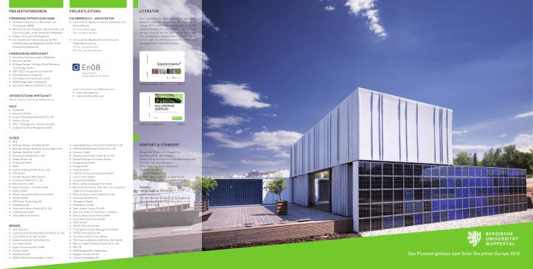 PROJEKTSPONSOREN PROJEKTLEITUNG LITERATUR FÖRDERUNG ÖFFENTLICHE HAND FACHBEREICH D – ARCHITEKTUR • Bundesministerium für Wirtschaft und Technologie, BMWi • Ministerium für Innovation, Wissenschaft und Forschung des Landes Nordrhein-Westfalen • Bergische Universität Wuppertal • mit freundlicher Unterstützung der Wirtschaftsförderung Wuppertal und der Stadtentwicklung Wuppertal • Lehrstuhl für Baukonstruktion, Entwerfen und Baustoffkunde Eine ausführliche Dokumentation des Wettbewerbs und der deutschen Beiträge ist im Januar 2011 im DETAIL Verlag unter dem Titel »Solararchitektur4« erschienen. Im gleichen Verlag erschien im Mai 2011 unser Buch zum Thema »Nullenergiegebäude« mit einem Querschnitt von 23 internationalen Projekten und umfangreicher Fachinformation. Prof. Anett-Maud Joppien Dipl.-Ing. Martin Hochrein • Lehrstuhl für Bauphysik und Technische Gebäudeausrüstung Prof. Dr.-Ing. Karsten Voss M.Sc. Dipl.-Ing. Soara Bernard FINANZIERUNG WIRTSCHAFT SolarArchitektur 4 Im Rahmen des internationalen Wettbewerbs Solar Decathlon Europe 2010 stellten sich 17 Hoch­ schulteams aus aller Welt den Her­ ausforderungen des Bauens der Zukunft. Ziel war es, ein energie­ effizientes und innovatives Haus zu entwerfen, das den gesamten Energiebedarf ausschließlich durch Solarenergie deckt. Die vier teilnehmenden Teams aus Deutschland schafften es alle unter die ersten zehn Plätze. Mit ihren eigens entwickelten Solar­ haus­Prototypen zeigen sie, wie sich energieoptimiertes Bauen mit Komfortsteigerung und ästhetischer Gestaltung verbinden lässt. In zahlreichen Abbildungen und Erläuterungen stellt das Buch die Konzepte der deutschen Teams im Detail vor und gibt einen Rück­ blick auf 18 Monate intensiver Arbeit inklusive der entscheidenden Wett­ bewerbstage in Madrid. • Barmenia Versicherungen, Wuppertal • bauserve GmbH • Bilfinger Berger Hochbau GmbH Building Technology Centre • GDF SUEZ Energie Deutschland AG • Stadtsparkasse Wuppertal • VHV Allgemeine Versicherung AG • WSW Wuppertaler Stadtwerke • Viessmann Werke GmbH & Co. KG SolarArchitektur 4 Die deutschen Beiträge zum Solar Decathlon Europe 2010 Edition ∂ Herausgeber: Bergische Universität Wuppertal Hochschule für angewandte Wissenschaften Fachhochschule Rosenheim Hochschule für Technik Stuttgart Hochschule für Technik und Wirtschaft Berlin ISBN 978-3-920034-48-5 9 783920 034485 ∂ Green Books ISBN 978-3-920034-48-5 35,90 € Material, Planung, Entwicklung und Realisierung Reihenfolge bleibt, da sonst unlogisch: ein Gebäude wird ERST gebaut, DANN genutzt -> „gerade“ ergänzt, um die inhaltliche Ebene rein zu bringen (die ein Leser hier eh noch nicht in der Komplexität weiß... – im Gegensatz zu Ihnen als Autor...) So einfach jedoch das Vorgehen der Energiebilanzierung auf den ersten Blick erscheint, so komplex wird es im Detail und so zahlreich sind die offenen Fragen. GOLD • • • • • • Nullenergiehaus, Plusenergiehaus, Nullemissionsstadt: Bei den Diskussionen über den richtigen energiepolitischen Kurs in die Zukunft steht auch unsere gebaute Umwelt im Fokus. Noch werden die bereits bekannten und erprobten Maßnahmen zu selten angewendet, mit denen sich Energieverbrauch und Emissionen vermindern lassen, die nicht nur bei der Errichtung von Gebäuden, sondern gerade auch bei der Instandhaltung und Nutzung über ihren gesamten Lebenszyklus entstehen. Diese Publikation stellt anhand 23 beispielhafter Projekte unterschiedlicher Nutzungstypologien und Größen die Umsetzung in verschiedenen Maßstäben und Klimaten vor. Die objektspezifische Dokumentation von Architektur und Energiekonzept wird durch die jeweiligen Erfahrungen auf dem Weg zu klimaneutralem Wohnen und Arbeiten ergänzt. Die aus dem Vergleich der Zielerreichung hergeleiteten Querschnittsergebnisse verweisen auf erfolgversprechende Strategien: »Nullenergie« ist machbar! Arnold AG bauserve GmbH Imtech Deutschland GmbH & Co. KG Nimbus Group ÖHS – Ökologischer Holzbau Sellsted Engineering Park Wuppertal GmbH ISBN 978-3-920034-50-8 9 783920 034508 KARSTEN VOSS EIKE MUSALL NULLENERGIE GEBÄUDE INTERNATIONALE PROJEKTE ZUM KLIMANEUTRALEN WOHNEN UND ARBEITEN Edition ∂ • www.sdeurope.org • www.solardecathlon.gov UNTERSTÜTZUNG WIRTSCHAFT NULLENERGIEGEBÄUDE weitere Informationen zum Wettbewerb unter: ISBN 978-3-920034-50-8 ∂ Green Books 49,90 € SILBER • • • • • • • • • • • • • • • • • • • • • • AEG Bilfinger Berger Hochbau GmbH Bilfinger Berger Building Technology Center Dachser GmbH & Co.KG Dornbracht GmbH & Co. KG ( Ewald Dörken AG Firstwood GmbH GIRA Hettich Holding GmbH & Co. oHG HVV GmbH Kondor Wessels West GmbH, Konvortec GmbH & Co. KG Microtherm GmbH Pazen Fenster + Technik GmbH Revox GmbH Rieder Faserbeton-Elemente GmbH Sattler GmbH SMA Solar Technology AG SolarWorld AG Viessmann Werke GmbH & Co. KG Und Krauss GmbH Zibell Willner & Partner BRONZE • • • • • • • • • ASA Selection Ingenieurbüro Reinhard Beck GmbH & Co. KG Josef Bindrum & Sohn GmbH Bodensteckdosen Systemtechnik Carl Stahl GmbH Egger Holzwerkstoffe GmbH Fissler GmbH Gardena GmbH GEOPLAN Vermessungsbüro GmbH • • • • • • • • • • • • • • • • • • • • • • • • • • • • • • • • Hasenkopf Holz + Kunststoff GmbH & Co KG HOPPECKE Batterien GmbH & Co. KG Horatec GmbH Feuerschutz-Jockel GmbH & Co. KG Kahla/Thüringen Porzellan GmbH Klingenburg GmbH Knapp GmbH Kvadrat GmbH LASTRO Technische Systeme GmbH Less’n’more GmbH luna.lichtarchitektur Mono, Seibel Designpartner GmbH Morhenne & Partner GbR, Büro für umweltver trägliche Energiesysteme Möve Frottana Textil GmbH & Co. KG Musculus GmbH & Co Riessbeck Möbel Rödelbronn GmbH Saint-Gobain Isover G+H AG Dipl.-Ing. Klaus-D. Schönau, Cuxhaven Sensus Metering Services GmbH Gerüstbau Schimmer GmbH TECE GmbH TENTE-ROLLEN GmbH Transparent Design Management GmbH