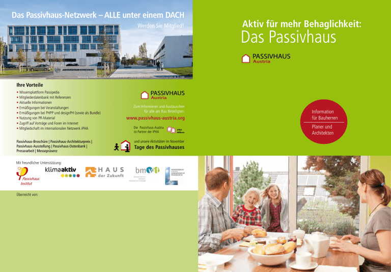 Das Passivhaus-Netzwerk – ALLE unter einem DACH Werden Sie Mitglied! Aktiv für mehr Behaglichkeit: Das Passivhaus Korneuburg Justizzentrum | DIN A4 Architektur ZT GmbH | Foto © markus bstieler | www.passivhausprojekt.de ID 2988 Ihre Vorteile • Wissensplattform Passipedia • Mitgliederdatenbank mit Referenzen •A ktuelle Informationen • Ermäßigungen bei Veranstaltungen • Ermäßigungen bei PHPP und designPH (sowie als Bundle) • Nutzung von PR-Material • Zugriff auf Vorträge und Foren im Internet • Mitgliedschaft im internationalen Netzwerk iPHA Passivhaus-Broschüre | Passivhaus-Architekturpreis | Passivhaus-Ausstellung | Passivhaus-Datenbank | Pressearbeit | Messepräsenz Mit freundlicher Unterstützung: Überreicht von: Zum Informieren und Austauschen für alle am Bau Beteiligten: www.passivhaus-austria.org Die Passivhaus-Austria ist Partner der iPHA PHA und unsere Aktivitäten im November Tage des Passivhauses Information für Bauherren Planer und Architekten IMPRESSUM DAS PASSIVHAUS: KOSTENGÜNSTIG – BEHAGLICH – NACHHALTIG 3. aktualisierte und erweiterte Auflage 2015 Auflage: 5.000 Gut beraten ist heute, wer alle Gelegenheiten ergreift, seine laufenden Energiekosten zu senken. Denn effiziente Energienutzung – vom guten Wärmeschutz über das Dreischeibenfenster bis zur Wärmerückgewinnung – ist der mit Abstand kostengünstigste Weg, diese Kosten ein für alle Mal zu senken. Und zwar nicht nur ein wenig, sondern umfassend – dafür steht der Passivhaus-Standard, und dafür stehen Passivhaus-Komponenten bei jedem Neu- und Umbau. Gelegenheiten nutzen: Das bedeutet, bei jedem Ersteinbau, jedem Ersatz, jeder Reparatur – kurz, bei jedem „Ohnehin-Anlass“ – immer die qualitätsgeprüften, hochenergieeffizienten Passivhaus-Komponenten zu nutzen. Im Gegensatz zu weit verbreiteten Vorurteilen sind diese nämlich heute kaum teurer in der Investition. Die Differenzkosten zwischen „mittlerer Qualität“ und dem richtigen Passivhaus sind heute für jede Baufamilie erschwinglich, das Passivhaus ist kostengünstig. Es rechnet sich sogar ausgezeichnet, in dieser Broschüre finden Sie mehr dazu. Viele der Komponenten sind schon nahezu selbstverständlich geworden – wie die Dreischeibenverglasung. Herausgeber | Redaktion und Copyright für Projekt- Dokumentation und Objektregister, Herstellung sowie Anzeigenredaktion Passivhaus Austria Anichstraße 29/54 A-6020 Innsbruck Tel.: 0043 | (0) 512 570768 Fax: 0043 | (0) 512 556212 [email protected] www.passivhaus-austria.org Redaktion und Copyright für PassivhausBasiswissen und -Detailwissen Passivhaus Institut Innsbruck www.phi-ibk.at Entwurf und Umsetzung Marlies Blücher, Patricia Inhofer | PHI Druckerei Ferdinand Berger & Söhne GmbH Bild- und Grafiknachweis Alexandra Lechner: Titelseite, S. 23, 24, 36, 50, 56, 58, Bettina Glaser S. 29, 39, Wohnbaugenossenschaft Balingen S. 33, InPlan (M.Kurz) S. 50, B-Süd Gemeinn. WohnungsgesmbH S. 61, alle weiteren Fotos und Grafiken, wenn nicht anders angegeben, Passivhaus Austria und PHI Wir bedanken uns herzlich bei allen Beteiligten, Planern, Bauherren, Ausführenden und Besuchern, die 2014 + 2015 zum großen Erfolg des internationalen „Tage des Passivhauses“ beigetragen und uns bei der Herstellung dieser Broschüre durch Bereitstellung von Bildmaterial ihrer Besichtigungsobjekten unterstützt haben. Haftungsausschluss Die in dieser Broschüre dokumentierten Informationen und technischen Daten von Passivhaus-Projekten basieren auf den Angaben der jeweiligen Planer. Eine detaillierte Prüfung konnte nicht in jedem Fall erfolgen. Zertifizierte Passivhäuser sind als solche gekennzeichnet. Jegliche Haftung, insbesondere für eventuelle Schäden, die durch die Nutzung der angebotenen Informationen entstehen, wird ausgeschlossen. Die Inhalte sind urheberrechtlich geschützt. Das ist noch nicht alles: Das Passivhaus bietet gute Innenraumluft auch in Ballungsräumen und bestmögliche Behaglichkeit. Der hohe Komfort ist dauerhaft gesichert, weil er vor allem durch die hohe Qualität der Dächer, Wände und Fenster geschaffen wird. Ob sich das Klima in der Region zum Heißen, zum Kalten oder zum Feuchten wandelt – eine gute Passivhaushülle trotzt allen Wetterlagen. Notfalls bietet das Gebäude, ergänzt durch die eigene Photovoltaik, auch unter extremsten Bedingungen noch Aufenthaltsqualität; auch im eisigen Winter und wenn die Sonneneinstrahlung sehr gering ist. Das Passivhaus liefert die Komfort-Versicherung für alle Eventualitäten gleich mit; ob Energie nun extrem teuer, schwer verfügbar oder das Wetter unkalkulierbar wird. Diese Erfahrung haben Tausende Familien bereits gemacht. Der Passivhaus-Standard ist eine wirkungsvolle, seit langem praktisch erprobte, sehr komfortable und kostengünstige Lösung. Unsere Messprojekte in rund 2.000 Wohneinheiten sowie etlichen Nichtwohnbauten, in denen wir die tatsächlichen Verbrauchswerte nachmessen, ergeben einen extrem geringen Heizwärmebedarf mit Einsparungen gegenüber dem bestehenden Durchschnittsverbrauch von etwa 90 Prozent. Ein Verbrauch von nur noch einem Zehntel, das ist „Nearly Zero Energy“ – und das ist nachhaltig, denn ein so geringer Energiebedarf kann problemlos von allen Menschen und allen künftigen Generationen beansprucht werden. Mit der Neufassung der Europäischen Gebäuderichtlinie (EPBD) wird vorgegeben, dass schon 2021 alle in der EU entstehenden Neubauten „Nearly Zero Energy Buildings“ (wörtlich übersetzt: Fast-Nullenergie-Häuser) sein müssen. Schon beim Vorwort der letzten Ausgabe hatte ich gefragt: Können wir es uns eigentlich noch leisten, schlechter zu bauen als den Passivhaus-Standard? Bei allen Unsicherheiten, die uns heute bewegen – bei einer Welt im Umbruch mit einer Vielzahl von Risiken – ist eine sichere Anlage gefragt. Ein Gebäude, das über Jahrzehnte dauerhaft den Schwankungen des Klimas und welchen Krisen der Energieversorgung auch immer trotzt – und dabei auch noch