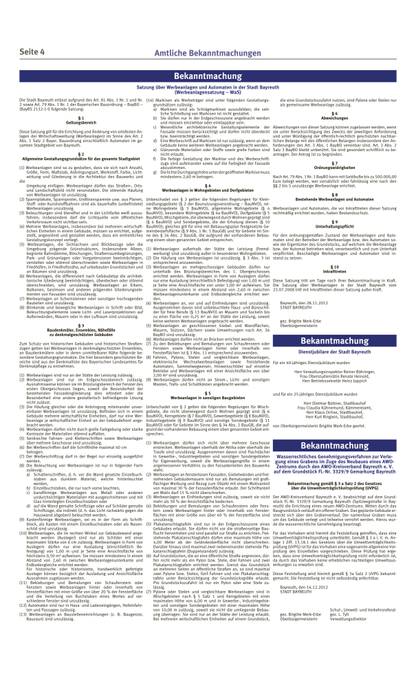 Seite 4 Amtliche Bekanntmachungen Bekanntmachung Satzung über Werbeanlagen und Automaten in der Stadt Bayreuth (Werbeanlagensatzung – WaS) Die Stadt Bayreuth erlässt aufgrund des Art. 81 Abs. 1 Nr. 1 und Nr. (14) Markisen als Werbeträger sind unter folgenden Gestaltungs2 sowie Art. 79 Abs. 1 Nr. 1 der Bayerischen Bauordnung – BayBO – grundsätzen zulässig: (BayRS 2132-1-I) folgende Satzung: a) Markisen sind als Schrägmarkisen auszubilden; die seitliche Schließung von Markisen ist nicht gestattet. §1 b) Sie dürfen nur in der Erdgeschosszone angebracht werden Geltungsbereich und müssen einziehbar oder einklappbar sein. c) Wesentliche architektonische Gestaltungselemente der Diese Satzung gilt für die Errichtung und Änderung von ortsfesten AnFassade müssen berücksichtigt und dürfen nicht überdeckt lagen der Wirtschaftswerbung (Werbeanlagen) im Sinne des Art. 2 bzw. beeinträchtigt werden. Abs. 1 Satz 2 Bayer. Bauordnung einschließlich Automaten im ged) Eine Werbeschrift auf Markisen ist nur zulässig, wenn an dem samten Stadtgebiet von Bayreuth. Gebäude keine weiteren Werbeanlagen angebracht werden. e) Glänzende Materialien oder Stoffe sowie grelle Farben sind nicht erlaubt. §2 f) Die farbige Gestaltung der Markise und des WerbeschriftAllgemeine Gestaltungsgrundsätze für das gesamte Stadtgebiet zugs sind aufeinander sowie auf die Farbigkeit der Fassade abzustimmen. (1) Werbeanlagen sind so zu gestalten, dass sie sich nach Anzahl, Größe, Form, Maßstab, Anbringungsart, Werkstoff, Farbe, Lichtg) Die lichte Durchgangshöhe unter der geöffneten Markise muss wirkung und Gliederung in die Architektur des Bauwerks und mindestens 2,60 m betragen. die Umgebung einfügen. Werbeanlagen dürfen das Straßen-, Orts§4 und Landschaftsbild nicht verunstalten. Die störende Häufung Werbeanlagen in Wohngebieten und Dorfgebieten von Werbeanlagen ist unzulässig. (2) Spannplakate, Spannposter, Großtransparente usw. aus Planen, Unbeschadet von § 2 gelten die folgenden Regelungen für KleinStoff- oder Kunststoffbahnen sind als dauerhafte (unbefristete) siedlungsgebiete (§ 2 der Baunutzungsverordnung – BauNVO), reiWerbeanlagen unzulässig. ne Wohngebiete (§ 3 BauNVO), allgemeine Wohngebiete (§ 4 (3) Beleuchtungen sind blendfrei und in der Lichtfarbe weiß auszu- BauNVO), besondere Wohngebiete (§ 4a BauNVO), Dorfgebiete (§ 5 führen; insbesondere darf die Lichtquelle vom öffentlichen BauNVO), Mischgebiete, die überwiegend durch Wohnen geprägt sind Verkehrsraum nicht sichtbar sein. (§ 6 BauNVO) und Sondergebiete, die der Erholung dienen (§ 10 (4) Mehrere Werbeanlagen, insbesondere bei mehreren wirtschaft- BauNVO); gleiches gilt für eine mit Bebauungsplan festgesetzte Gelichen Einheiten in einem Gebäude, müssen so errichtet, aufge- meinbedarfsfläche (§ 9 Abs. 1 Nr. 5 BauGB) und für Gebiete im Sinstellt, angeordnet und gestaltet werden, dass ein einheitliches ne des § 34 Abs. 2 BauGB, die aufgrund der vorhandenen BebauGestaltungskonzept vorliegt. ung einem oben genannten Gebiet entsprechen. (5) Werbeanlagen, die Sichtachsen und Blickbezüge oder die Umgebung prägende Grünstrukturen, insbesondere Alleen, (1) Werbeanlagen außerhalb der Stätte der Leistung (Fremdbegrünte Bahndämme, Böschungen, Straßenraumbegrünungen, werbung) sind unzulässig außer in besonderen Wohngebieten. Park- und Grünanlagen oder Vorgartenzonen beeinträchtigen, (2) Die Häufung von Werbeanlagen ist unzulässig. § 3 Abs. 3 ist verstellen oder störend überschneiden sowie Werbeanlagen in entsprechend anzuwenden. Friedhöfen, in Friedhofsnähe, auf unbebauten Grundstücken und (3) Werbeanlagen an mehrgeschossigen Gebäuden dürfen nur an Bäumen sind unzulässig. unterhalb des Brüstungsbereiches des 1. Obergeschosses (6) Werbeanlagen, die differenziert nach Gebäudetyp die architekerrichtet werden. Werbeanlagen in Form von Auslegern dürfen tonische Gliederung beeinträchtigen, überdecken oder störend nur eine Ausladung (einschließlich Befestigung) von 1,00 m und überschneiden, sind unzulässig. Werbeanlagen an Erkern, je Seite eine Ansichtsfläche von unter 1,00 m² aufweisen. Sie Balkonen, Gesimsen und anderen prägenden Gliederungselemüssen mindestens in einem Abstand von 2,60 m zwischen menten von Fassaden sind unzulässig. Werbeanlagenunterkante und Erdbodengleiche errichtet wer(7) Werbeanlagen an Schornsteinen oder sonstigen hochragenden den. Bauteilen sind unzulässig. (4) Werbeanlagen an, vor und auf Einfriedungen sind unzulässig. (8) Blinkende und bewegliche Werbeanlagen in Schrift oder Bild, Ausgenommen davon sind unbeleuchtete Haus- und BüroschilBeleuchtungselemente sowie Licht- und Laserprojektionen auf der für freie Berufe (§ 13 BauNVO) an Mauern und Sockeln bis Außenwänden, Mauern oder in den Luftraum sind unzulässig. zu einer Fläche von 0,25 m² an der Stätte der Leistung, soweit keine weiteren Werbeanlagen angebracht werden. §3 (5) Werbeanlagen an geschlossenen Giebel- und Wandflächen, Baudenkmäler, Ensembles, Nähefälle Mauern, Stützen, Dächern sowie Umwehrungen nach Art. 36 zu denkmalgeschützten Gebäuden BayBO sind unzulässig. (6) Werbeanlagen dürfen nicht an Brücken errichtet werden. Zum Schutz von historischen Gebäuden und historischen Straßen- (7) Zu den Beklebungen und Bemalungen von Schaufenstern oder zügen gelten bei Werbeanlagen in denkmalgeschützten Ensembles, Fenstern sowie Werbeanlagen hinter oder innerhalb von an Baudenkmälern oder in deren unmittelbarer Nähe folgende beFensterflächen ist § 3 Abs. 11 entsprechend anzuwenden. sondere Gestaltungsgrundsätze. Die hier besonders geschützten Be- (8) Fahnen, Pylone, Stelen und vergleichbare Werbeanlagen, reiche sind aus der Denkmalliste des Bayerischen Landesamtes für elektronische Wechselwerbeanlagen sowie freistehende Denkmalpflege zu entnehmen. Automaten, Sammelwegweiser, Hinweisschilder auf einzelne Betriebe und Werbeanlagen mit einer Ansichtsfläche von über (1) Werbeanl