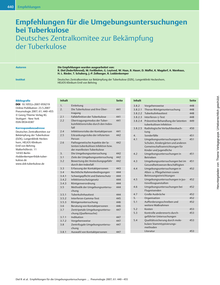 Empfehlungen Empfehlungen für die Umgebungsuntersuchungen bei Tuberkulose Deutsches Zentralkomitee zur Bekämpfung der Tuberkulose Autoren Die Empfehlungen wurden ausgearbeitet von: R. Diel (federführend), M. Forßbohm, G. Loytved, W. Haas, B. Hauer, D. Maffei, K. Magdorf, A. Nienhaus, H. L. Rieder, T. Schaberg, J.−P. Zellweger, R. Loddenkemper Institut Deutsches Zentralkomitee zur Bekämpfung der Tuberkulose (DZK), Lungenklinik Heckeshorn, HELIOS Klinikum Emil von Behring Bibliografie DOI 10.1055/s−2007−959219 Online−Publikation: 23.5.2007 Pneumologie 2007; 61; 440±455 Georg Thieme Verlag KG Stuttgart ´ New York ISSN 0934−8387 Korrespondenzadresse Deutsches Zentralkomitee zur Bekämpfung der Tuberkulose (DZK), Lungenklinik Heckes− horn, HELIOS Klinikum Emil von Behring Walterhöferstr. 11 14165 Berlin rloddenkemper@dzk−tuber− kulose.de www.dzk−tuberkulose.de Inhalt Seite 1. Einleitung 2. Die Tuberkulose und ihre Über− tragung 441 2.1 Falldefinition der Tuberkulose 2.2 Übertragungsmodus der Tuber− kuInfektionsrisiko durch den Index− fall 2.4 Infektionsrisiko der Kontaktperson 441 2.5 Erkrankungsrisiko der infizierten Person 442 2.6 Pathogenetische Aspekte der la− tenten tuberkulösen Infektion bzw. der manifesten Tuberkulose 442 3. Die Umgebungsuntersuchung 442 3.1 Ziele der Umgebungsuntersuchung 442 3.2 Bewertung der Ansteckungsgefahr durch den Indexfall 3.3 3.4 Inhalt Seite 3.8.2 Vorgehensweise 3.8.2.1 Thorax−Röntgenuntersuchung 448 3.8.2.2 Tuberkulinhauttest 448 441 3.8.2.3 Interferon− ã −Test 448 441 3.8.2.4 Präventive Behandlung der latenten tuberkulösen Infektion 449 3.8.2.5 Radiologische Verlaufsbeobach− tung 450 4. Sonderfälle 451 4.1 Umgebungsuntersuchungen in Schulen, Kindergärten und anderen Gemeinschaftseinrichtungen für Kinder und Jugendliche 451 4.2 Umgebungsuntersuchungen in Betrieben 451 442 4.3 Umgebungsuntersuchungen bei im Gesundheitswesen Beschäftigten 451 Erfassung der Kontaktpersonen 443 4.4 444 3.4.1 Schweigepflicht und Datenschutz 444 Umgebungsuntersuchungen in Alten− u. Pflegeheimen sowie Betreuungseinrichtungen 452 Rechtliche Rahmenbedingungen 3.4.2 Infektionsschutzgesetz 444 4.5 Röntgenverordnung 444 Umgebungsuntersuchungen in Jus− tizvollzugsanstalten 452 3.4.3 3.5 Methodik der Umgebungsuntersu− chung 444 4.6 Umgebungsuntersuchungen bei Flugreisenden 452 3.5.1 Tuberkulinhauttest 444 4.7 Große Ausbrüche 452 3.5.2 Interferon−Gamma−Test 445 5. Organisation 452 3.5.3 Röntgenuntersuchung 446 5.1 Beratung von Kontaktpersonen 446 Aufforderungsschreiben und weitere Maßnahmen 452 3.6 3.7 Zentripetale Umgebungsuntersu− chung (Quellensuche) 447 5.2 Kosten 453 5.3 453 3.7.1 Indikation 447 Kontrolle anderenorts durch− geführter Untersuchungen 3.7.2 Vorgehensweise 447 5.4 Zentrifugale Umgebungsuntersu− chung 447 Qualitätssicherung durch mole− kulare Stammtypisierungs− methoden 453 3.8 3.8.1 Auswahl von Kontaktpersonen 447 Literatur 453 Diel R et al. Empfehlungen für die Umgebungsuntersuchungen ¼ Pneumologie 2007; 61: 440 ± 455 448 Heruntergeladen von: Thieme Verlagsgruppe. Urheberrechtlich geschützt. 440 Empfehlungen Glossar 441 sis−Komplexes (M. tuberculosis, M. bovis, M. africanum, M. microti und M. canettii) verursacht werden. Umweltmykobakterien bzw. nicht−tuberkulöse Mykobakterien (NTM) und die verschiedenen Bacille Calmette−GuØrin (BCG)−Stämme zählen nicht zu den Er− regern der Tuberkulose [2]. ! BAL: Broncho−alveoläre Lavage BCG: Bacille Calmette−GuØrin CFP−10: Culture−filtrate−protein−10 ESAT−6: Early−secreted−antigenic−target−6 IFN: Interferon IfSG: Infektionsschutzgesetz INH: Isoniazid LTBI: latente tuberkulöse Infektion mit Mycobacterium tuberculosis−Komplex NTM: nicht−tuberkulöse Mykobakterien (Synonym: Umweltmykobakterien) MTB: M. tuberculosis−Bakterien P.− a.: posterior−anteriorer Strahlengang PBMC: periphere mononukleäre Zellen PPD: Purified−Protein−Derivative PPW: positiv prädiktiver Wert RFLP: restriction fragment length polymorphism RöV: Röntgenverordnung RR: relatives Risiko TNF: Tumor−Nekrose−Faktor THT: Tuberkulinhauttest TRU: Thorax−Röntgenuntersuchung 2.3 Infektionsrisiko durch den Indexfall1 1. Einleitung ! Die Veröffentlichung des DZK ¹Richtlinien für die Umgebungs− untersuchung bei Tuberkulose“ liegt mehr als 10 Jahre zurück [1]. Inzwischen wurden nicht nur neue molekular−epidemiologi− sche Erkenntnisse zur Übertragung der Tuberkulose gewonnen, sondern auch in−vitro−Verfahren zur Diagnose der latenten tu− berkulösen Infektion (LTBI) entwickelt. Dies macht eine Aktuali− sierung der bisherigen Empfehlungen erforderlich. Sie setzen neue Akzente durch " eine zielführendere Auswahl der zu untersuchenden Kon− taktpersonen " deren eingehende Beratung durch Mitarbeiter des Gesund− heitsamtes " deren Untersuchung mit Interferon (IFN)−ã−Tests in Kombi− nation mit dem Tuberkulinhauttest " eine Fokussierung auf die Detektion von Personen mit LTBI und deren präventive Chemotherapie " die Beschränkung der radiologischen Verlaufsbeobachtung auf das erste Jahr nach dem letzten Kontakt zur Infektions− quelle sowie " den vermehrten Einsatz molekularer Genotypisierungsver− fahren. Die neuen Empfehlungen sollen hierdurch zur Sicherung der Qualität der nach §§ 25 und 26 des Infektionsschutzgesetzes (IfSG) vorgeschriebenen Ermittlungen und Untersuchungen über Ansteckungsquelle und Ausbreitung der Tuberkulose bei− tragen. 2. Die Tuberkulose und ihre Übertragung Die Tuberkulose zählt nicht zu den hochinfektiösen Erkrankun− gen. Das Risiko einer Weiterverbreitung hängt ab von " Virulenz und Menge der ausgeschiedenen Erreger " Intensität und Dauer des Kontakts An Lungentuberkulose Erkrankte, in deren Sputum−Direktpräpa− rat säurefeste Stäbchen mikroskopisch nachgewiesen sind, be− sitzen daher die höchste Infektiosität [4]. Verglichen mit kultu− rell gesicherten, aber 