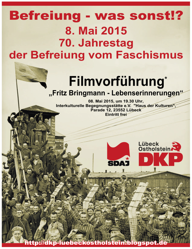 Befreiung - was sonst!? 8. Mai 2015 70. Jahrestag der Befreiung vom Faschismus Filmvorführung* „Fritz Bringmann - Lebenserinnerungen“ 08. Mai 2015, um 19.30 Uhr, Interkulturelle Begegnungsstätte e.V. "Haus der Kulturen", Parade 12, 23552 Lübeck Eintritt frei Lübeck Ostholstein http://dkp-luebeckostholstein.blogspot.de Unvergessen! Der Lübecker Antifaschist Fritz Bringmann Fritz Bringmann wurde am 9.2.1918 in Lübeck geboren. Er war das sechste von acht Kindern. Er wuchs in einer politisch aktiven Familie auf: Sein Großvater gehörte 1892 zu den Gründungsmitgliedern der SPD in Stockelsdorf. Auch sein Vater war Sozialdemokrat und seine älteren Brüder waren Mitglieder in der SAJ. Später traten seine Brüder dem Kommunistischen Jugendverband Deutschlands (KJVD) bei 1933 begann Fritz Bringmann eine Lehre als Klempner und Installateur. Im gleichen Jahr wurden seine Brüder Werner (19), Alfred (23) und Karl (18) wegen illegaler politischer Tätigkeit im KJVD verhaftet und ins Kolafu überstellt. Durch die Verhaftungen seiner Brüder entschloss sich Fritz Bringmann 1934 „etwas gegen die Nazis zu tun.“ [Aus Biografie 2004, S.26] Er begann, illegale Handzettel und Schriften zu verteilen. In der Nacht vom 27. zum 28. April 1935 malte er mit seinem Bruder Karl, der zu diesem Zeitpunkt wieder frei war, auf das Dach von „Marmor Rother“ die Losung „Nieder mit Hitler“, sie wurden entdeckt und mussten fliehen. Zurückgelassene Materialien wurden ihnen zum Verhängnis. Sie wurden in Schutzhaft genommen. Das Jugendgericht Lübeck verurteilte ihn wegen Sachbeschädigung zu zweieinhalb Monaten Gefängnis, die mit der Untersuchungshaft als verbüßt galten. Doch die Gestapo ordnete Schutzhaft bis September an. Im Oktober 1935 erfolgte die erneute Verhaftung. Im September 1936 wurde Fritz Bringmann zu zwei Jahren Gefängnis verurteilt. Das Jahr Untersuchungshaft wurde angerechnet, das andere Jahr zur Bewährung ausgesetzt. Doch es erfolgte die Einweisung in ein „Umschulungslager“. Anfang November wurde Fritz Bringmann -18jährig - in das KZ Sachsenhausen überstellt. Am 30. September 1940 erfolgte die Überstellung in das KZ Neuengamme. Hier war er anfänglich Vorarbeiter in der Strafkompanie. Im Oktober 1941 wurde er Häftlingssanitäter im neu errichteten „Kriegsgefangenen-Arbeitslager“. Im Dezember brach im Lager eine Flecktyphusepidemie aus. „Ende Januar 1942 erschien SS-Sanitäter Bahr und gab mir den Befehl des Standortarztes, nicht mehr arbeitsfähige Kriegsgefangene mittels Injektionen zu töten. Ohne mögliche Folgen zu bedenken, lehnte ich die Tötung der Kriegsgefangenen kategorisch ab.“ [HB 1288, S.8] Zu diesem Zeitpunkt erkrankte Fritz Bringmann auch an Flecktyphus, für vier Wochen musste er ins Krankenrevier. Bis Ende Mai 1942 waren von den 1000 sowjetischen Kriegsgefangenen 652 gestorben. Die verbliebenen wurden nach Sachsenhausen überstellt. „Wir haben nie wieder etwas von ihnen gehört. Als Erinnerung an sie ist mir ihre Danksagung und eine Schnitzarbeit geblieben, die sie mir vor ihrer Überstellung nach Sachsenhausen überreichten.“ [Biografie 2004, S.91 Nach dem Abtransport der Kriegsgefangenen, war Fritz Bringmann Stubenältester. Es folgte der Einsatz als Sanitäter in der 2. SS-Baubrigade Osnabrück. Im Mai 1943, dann die Verlegung nach BremenHuckelriede. Von dort aus unternahm er im April 1944 einen Fluchtversuch. Nach sieben Wochen wurde er gefasst. Es erfolgte die erneute Einweisung in das KZ Neuengamme, dann die Überstellung in das Zuchthaus Bremen-Oslebshausen. Dort blieb er bis Kriegsende. Im Juni 1945 kehrte er nach Lübeck zurück. „Die Empfindungen meiner Mutter vermag ich nicht zu schildern. Meine Brüder Karl und Alfred waren bereits zu Hause. […] Hans und Werner hatten um 1935 emigrieren müssen, um einer Verhaftung zu entgehen; wir wussten also nur, dass sie sich im Ausland aufhielten. Über Henry hatte ich ja gehört, er sei aus der Haft im Zuchthaus Waldheim in Sachsen befreit worden. Bruno war als Seemann in Indien interniert worden und auch der Jüngste, Günter war noch nicht zu Hause. Er war als einziger unserer Familie zur Wehrmacht eingezogen worden. […] Die Leidensgeschichte unserer Mutter […] ständig die Gestapo im Haus. Mein Vater unseretwegen monatelang in Haft. Von acht Söhnen sechs im antifaschistischen Widerstand aktiv, drei von ihnen erfolgreich aus Deutschland geflüchtet, drei für zehn und mehr Jahre in Zuchthäusern und Konzentrationslagern inhaftiert. Die anderen beiden interniert bzw. in Kriegsgefangenschaft. Nach seiner Rückkehr engagiert Fritz Bringmann sich beim Aufbau der FDJ [Freie Deutsche Jugend] in Lübeck. 1947 heiratete er seine Lebensgefährtin Alice. Er engagierte sich in der Arbeitsgemeinschaft ehemaliger politischer Gefangener. Nach dem Verbot der FDJ arbeitete er aktiv in der VVN und KPD. 1970 wurde er Generalsekretär der Amicale Internationale Neuengamme. Am 26. Januar 2000 wurde Fritz Bringmann das Bundesverdienstkreuz 1.Klasse verliehen. Eine Würdigung seiner Tätigkeit in der Amicale Internationale Neuengamme, deren Ehrenpräsident er bis zu seinem Tod im März 2011 war. *Mitglieder und Anhänger rechtsextremer Parteien und Organisationen wie NPD, „Die Rechte“,Pegida & Co., DVU, Republikaner und den freien Kameradschaften haben keinen Zutritt zu der Veranstaltung (nach § 6, VersG.)
