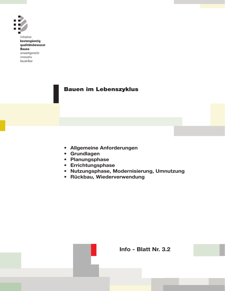 Bauen im Lebenszyklus • • • • • • Allgemeine Anforderungen Grundlagen Planungsphase Errichtungsphase Nutzungsphase, Modernisierung, Umnutzung Rückbau, Wiederverwendung Info - Blatt Nr. 3.2 Impressum Herausgeber: Kompetenzzentrum der Initiative „Kostengünstig qualitätsbewusst Bauen“ im Bundesinstitut für Bau-, Stadt- und Raumforschung (BBSR) im Bundesamt für Bauwesen und Raumordnung (BBR) Fasanenstraße 87, 10623 Berlin Telefon: 03018/401-3444 Telefax: 03018/401-3449 E-mail: [email protected] www.kompetenzzentrum-iemb.de Konzeption und Bearbeitung Institut für Erhaltung und Modernisierung von Bauwerken e.V. an der TU Berlin (IEMB) Salzufer 14,10587 Berlin Grafik Online Now! Gesellschaft für elektronisches Marketing mbH Kastanienallee 26, 14052 Berlin www.online-now.de Druck Druckerei V+V Sofortdruck GmbH Bunsenstraße 5, 53121 Bonn www.vuvdruck.de Dieses Info-Blatt soll dem breiten Kreis der Eigenheiminteressenten Informationen, Tipps und Anregungen geben. Es will und kann Gesetzestexte nicht ersetzen. Bei Rechtsfragen sollten daher immer die zuständigen Behörden oder die allgemein zur Rechtsauskunft befugten Stellen befragt werden. Dort können Sie z.B. auch Ausführungsbestimmungen erfahren, die nicht immer alle dargestellt werden können und die häufig von Bundesland zu Bundesland verschieden sind. Stand: Januar 2009 Weitere Merkblätter und Informationen zu aktuellen Themen können auf der Internetseite www.kompetenzzentrum-iemb.de abgerufen und ausgedruckt werden. Inhaltsverzeichnis 1 Grundlagen 2 1.1 Lebenszyklusbetrachtung 2 1.2 Aspekte der Nachhaltigkeit 3 2 Planungsphase 5 2.1 Grundstück 5 2.2 Gebäudeentwurf 6 2.3 Kostenplanung 10 3 Errichtungsphase 11 3.1 Bauausführung 11 3.2 Qualitätsprüfung 11 4 Nutzungsphase 12 4.1 Allgemeine Betriebskosten 12 4.2 Reinigungsaufwand 13 5 Instandhaltung und Modernisierungsphase 13 5.1 Instandhaltung 13 5.2 Modernisierung 14 6 Umnutzungsphase / Weiternutzungsphase 15 7 Rückbau, Wiederverwendung und Recycling 15 8 Quellen 16 1 3.2 Bauen im Lebenszyklus 1 Grundlagen 1.1 Lebenszyklusbetrachtung Jeder Bauherr möchte sein neues Haus so errichten, bzw. ein aus dem Bestand erworbenes Gebäude so gestalten, dass • es allen seinen gegenwärtigen Wohn- und Lebensbedürfnissen entspricht, • es an mögliche Veränderungen dieser Bedürfnisse während der gesamten Nutzungsperiode leicht anzupassen ist, • eine dauerhafte Nutzung des Gebäudes auch generationenübergreifend ohne Verluste an Wohnqualität möglich ist und • der Wiederverkaufswert des Hauses langfristig auf einem hohen Niveau bleibt. Damit ein Haus diesen Anforderungen gerecht werden kann, ist eine vorausschauende Planung erforderlich, d.h. der gesamte Lebenszyklus des Gebäudes – „von der Wiege bis zur Bahre“ - muss berücksichtigt werden. Der Lebenszyklus eines Hauses kann mit Hilfe des folgenden Schemas (Abb. 1) dargestellt werden: Abb. 1: Lebenszyklus eines Gebäudes Der Lebenszyklus eines Gebäudes kann in folgende einzelne Lebenszyklusphasen eingeteilt werden: − Planungsphase − Errichtungsphase − Nutzungs- und Betriebsphase − Instandhaltung- und Modernisierungsphase − Umnutzungs-/Weiternutzungsphase − Rückbau und Wiederverwendung − Recycling Die Lebenszyklusbetrachtung bietet die Chance, die Aufwendungen über die gesamte Lebensdauer eines Gebäudes – seien sie ökonomischer oder ökologischer Natur – auf der Grundlage einer fundierten Planung zu minimieren und gleichzeitig die Nutzungsqualität zu sichern. Dabei ggf. erforderliche höhere Planungs- und Errichtungskosten lassen sich in der Regel - insbesondere durch Einsparungen bei den Nutzungskosten refinanzieren, so dass insgesamt eine Senkung der Lebenszykluskosten möglich wird, ohne die Qualität des Gebäudes zu beeinträchtigen (win-win-Situation). 2 Die Bedeutung der Lebenszyklusbetrachtung kann beispielhaft an der Verteilung der Kosten eines Einfamilienhauses - geplant nach Energieeinsparverordnung - über dessen Gesamtlebensdauer veranschaulicht werden. In einer Simulation der Lebenszyklus- kosten kann der Einfluss der Betriebsphase auf die Gesamtkosten bei einer angesetzten Lebensdauer von 80 Jahren und einer jährlichen Energiepreissteigerung von 1, 2 und 3 % (Inflationsbereinigt, ohne Lohn bzw. Materialpreissteigerungen) wie folgt abgeschätzt werden: Tabelle 1: Lebenszykluskosten [1] Phasen (Betrachtungszeitraum 80 Jahre) Errichtung Energiepreissteigerung 1% 2% 3% 240.000,-€ 240.000,-€ 240.000,-€ 341.000,-€ 531.000,-€ 900.000,-€ 46.000,-€ 46.000,-€ 46.000,-€ 212.000,-€ 212.000,-€ 212.000,-€ 29.000,-€ 29.000,-€ 29.000,-€ rechnerische Lebenszykluskosten 868.000,-€ 1.058.000,-€ 1.427.000,-€ Anteil der Betriebsphase an den Gesamtlebenszykluskosten 69,0 % Betrieb Nutzung Wartung Instandsetzung Rückbau 74,6 % 81,2 % Es wird deutlich, dass unter den getroffenen Annahmen die Betriebskosten in der Simulationsrechnung den variabelsten Anteil darstellen und für das Gebäude mit Abstand den größten Anteil ausmachen. Entscheidendes Kriterium für die Betriebsphase ist die Entwicklung der Energiepreise. Auf die Berücksichtigung der Reinigungskosten wurde indes verzichtet, da sie für privat genutzte Wohngebäude von eher geringer Bedeutung sind. Da die einzelnen Lebenszykluskosten sehr von den zukünftigen Preisentwicklungen am Arbeits- und Rohstoffmarkt beeinflusst werden, sind diese sowohl bei der Lebenszyklusbetrachtung im Rahmen des Entwurfs als auch bei Modernisierungsmaßnahmen sinnvoll zu berücksichtigen. Die Einbeziehung der Lebenszyklusbetrachtung ist somit als neue Stufe der Planungsund Bauqualität anzusehen. 1.2 Aspekte der Nachhaltigkeit Die ganzheitliche Lebenszyklusbetrachtung berücksichtigt die drei Aspekte der Nachhaltigkeit: • ökonomische Aspekte, • ökologische Aspekte und • soziokulturelle Aspekte. Auf die einzelnen Aspekte wird im Weiteren näher eingegangen. Ökonomische Dimension Die ökonomische Dimen