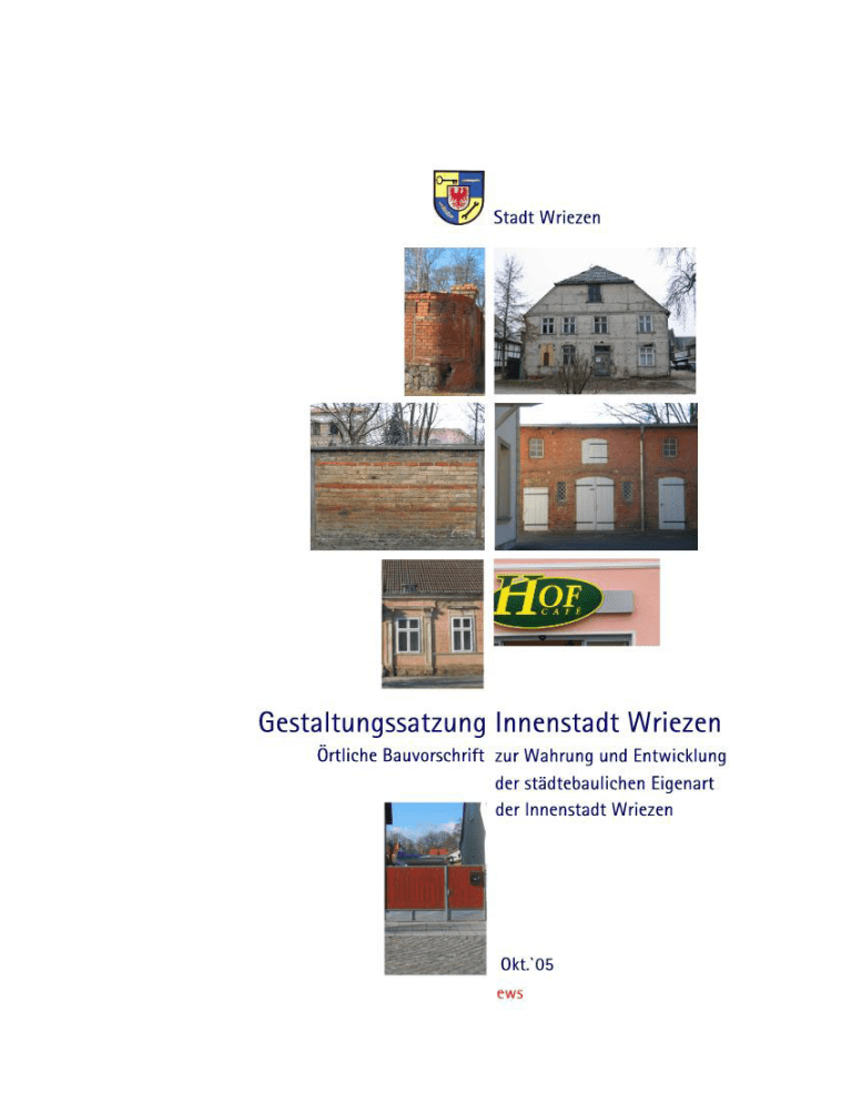 GESTALTUNGSSATZUNG WRIEZEN GESTALTUNGSSATZUNG INNENSTADT WRIEZEN Auftraggeber Stadt Wriezen Freienwalder Straße 50 16 269 Wriezen fon 033456-490 fax 033456-49400 mail [email protected] Bürgermeister Herr Uwe Siebert Auftragnehmer ews Stadtsanierungsgesellschaft mbH Grünberger Straße 26 10245 Berlin fon 030-293811-0 fax 030-293811-20 mail [email protected] GF Walter Bitzer Kai-Uwe Leonhardt Oktober 2005 GS-endtext-12-05.doc 1 GESTALTUNGSSATZUNG WRIEZEN INHALTSVERZEICHNIS Präambel 3 Satzung §1 Räumlicher Geltungsbereich §2 Sachlicher Geltungsbereich §3 Städtebaulich-räumliche Gestaltung §4 Dächer §5 Dachaufbauten §6 Fassaden, Fenster und Türen §7 Werbeanlagen und Warenautomaten §8 Sonnen- und Wetterschutzanlagen §9 Außenanlagen und Einfriedungen § 10 Abweichungen § 11 Zuständigkeiten § 12 Verhältnis zu anderen Rechtsvorschriften § 13 Ordnungswidrigkeiten § 14 Inkrafttreten 5 6 7 8 9 10 13 15 16 17 17 17 18 19 Ausfertigungsvermerk Karte des räumlichen Geltungsbereiches der Satzung GS-endtext-12-05.doc 19 (Anhang) 2 GESTALTUNGSSATZUNG WRIEZEN PRÄAMBEL Das gewachsene Bild der Stadt in seiner prägenden Erscheinung ist durch einen stetigen Veränderungsprozess bestimmt. Bauliche Veränderungen und die Überformung des Erscheinungsbildes im Ganzen wie in Einzelteilen können die Stadtgestalt harmonisch ergänzen oder beeinträchtigen. Besonders im Rahmen zunehmender Uniformität der Städte durch ästhetische und bautechnische Trends und Internationalisierung aller Lebensbereiche ist es wichtig, das Gesicht der Orte und ihre Eigenheiten zu wahren. Um diesen Prozess bewusst zu steuern, Verlusten an Stadtgestalt zu begegnen und harmonische Ergänzungen zu befördern, erlässt die Stadt Wriezen diese Gestaltungssatzung. Durch die starken Zerstörungen im Zweiten Weltkrieg und die städtebauliche Neuorientierung in den Folgejahrzehnten verblieben der Stadt Wriezen nur wenige „Altbauten“ und allmählich gewachsene Stadträume. Umso mehr gilt es, diese Strukturen sorgfältig weiterzuentwickeln. Das Satzungsgebiet teilt sich in zwei Siedlungseinheiten (Innenstadt/Altkietz und Freienwalder Straße), für die aus ihrer partiell voneinander abweichenden städtebaulichen Prägung in Teilen unterschiedliche Satzungsinhalte abgeleitet werden. Das Stadtbild ergibt sich von Straßen, Plätzen, Freiflächen, vom öffentlichen Raum aus. Deshalb ist der Geltungsbereich der Satzung auf Gebäudeteile, Freiflächen und sonstige Anlagen beschränkt, die öffentlichen Räumen zugewandt und von dort einsehbar sind. Gleichwohl sollte es zum Anspruch der Bauherren gehören, ihre Bauvorhaben einer ganzheitlichen harmonischen Gestaltung zuzuführen. Auf Grundlage des § 81 (1) Satz 1 und 2 der Brandenburgischen Bauordnung sollen geregelt werden: die äußere Gestaltung der baulichen Anlagen und anderer Anlagen und Einrichtungen und die Notwendigkeit von Einfriedungen sowie die Art, die Größe die Gestaltung, die Farbe und den Anbringungsort der Werbeanlagen und Warenautomaten sowie deren Ausschluss. Die Regeln der Gestaltungssatzung sind nicht sehr eng gefasst. Grundsatz ist die Regelung der unbedingt notwendigen Sachverhalte mit dem Ziel, das Stadtbild verunstaltende Eingriffe zu verhindern und zur Förderung der gewachsenen örtlichen Baukultur beizutragen. Zusätzlich unterliegen Maßnahmen an Denkmalen den weitergehenden Bestimmungen des Brandenburgischen Denkmalschutzgesetzes, insbesondere der Erlaubnispflicht nach § 15 BbgDSchG. GS-endtext-12-05.doc 3 P GESTALTUNGSSATZUNG WRIEZEN GESTALTUNGSSATZUNG INNENSTADT WRIEZEN Die Stadtverordnetenversammlung der Stadt Wriezen hat in ihrer Sitzung am 24.11.2005 auf Grundlage des § 81 der Brandenburgischen Bauordnung(BbgBO) in der aktuellen Fassung vom 26.06.2003 in Verbindung mit der Gemeindeordnung für das Land Brandenburg (GO-Bbg) die nachfolgende Satzung beschlossen. Die beigefügte Karte (Anlage) und die Zeichnungen sind Bestandteil der Satzung. GS-endtext-12-05.doc 4 GESTALTUNGSSATZUNG WRIEZEN §1 RÄUMLICHER GELTUNGSBEREICH (1) Der räumliche Geltungsbereich umfasst alle Grundstücke, die innerhalb der Grenze gemäß der beigefügten Karte (Anlage) liegen. Werden durch die Geltungsbereichsgrenze Grundstücke geschnitten, dann unterliegen die Grundstücke in einer Tiefe von 30 Metern den Anforderungen dieser Satzung. Die beigefügte Karte (Anlage) ist Bestandteil der Satzung. (2) Der räumliche Geltungsbereich wird unterteilt in die Gestaltungsbereiche Innenstadt/Altkietz und Freienwalder Straße, deren Geltungsbereiche in der beigefügten Karte (Anlage) dargestellt sind. (3) Der Gestaltungsbereich Innenstadt/Altkietz umfasst die Straßenabschnitte Oderstraße, Friedrichstraße, Wilhelmstraße, Schützenstraße, Feuerwehrgasse, Krausenstraße, Magazinstraße, Große Kirchstraße, Kleine Kirchstraße, Mauerstraße, Hückelgasse, Brauergasse, Jägerstraße/Ecke Wilhelmstraße, Steuerstraße (zwischen Freienwalder und Krausenstraße), Altkietz, Freienwalder Straße (zwischen Kreisel und Magazinstraße), Odervorstadt, Markt (Platzfläche und Randbebauung ohne südliche Platzwand). (4) Der Gestaltungsbereich Freienwalder Straße umfasst den Straßenabschnitt der Freienwalder Straße zwischen der Einmündung Magazinstraße und der Einmündung Kastanienweg. (5) Bei Zweifeln an der Einbeziehung von Grundstücken oder Grundstücksteilen in den Geltungsbereich dieser Satzung gilt die Innenkante der in der beigefügten Karte (Anlage) eingezeichneten Linie. GS-endtext-12-05.doc 5 §1 GESTALTUNGSSATZUNG WRIEZEN BEGRÜNDUNG Begründung zu § 1 (Räumlicher Geltungsbereich) Der räumliche Geltungsbereich umfasst die Grundstücke an den wichtigsten Straßen des historischen Stadtzentrums sowie die Grundstücke, die an der Freienwalder Straße als wichtiger Ausfallstraße liegen. Das in den Geltungsbereich einbezogene Gebiet ist bestimmend für die lokale Identität der Stadt und widerspiegelt die städtebauliche Entwicklung Wriezens. Die in der bisher