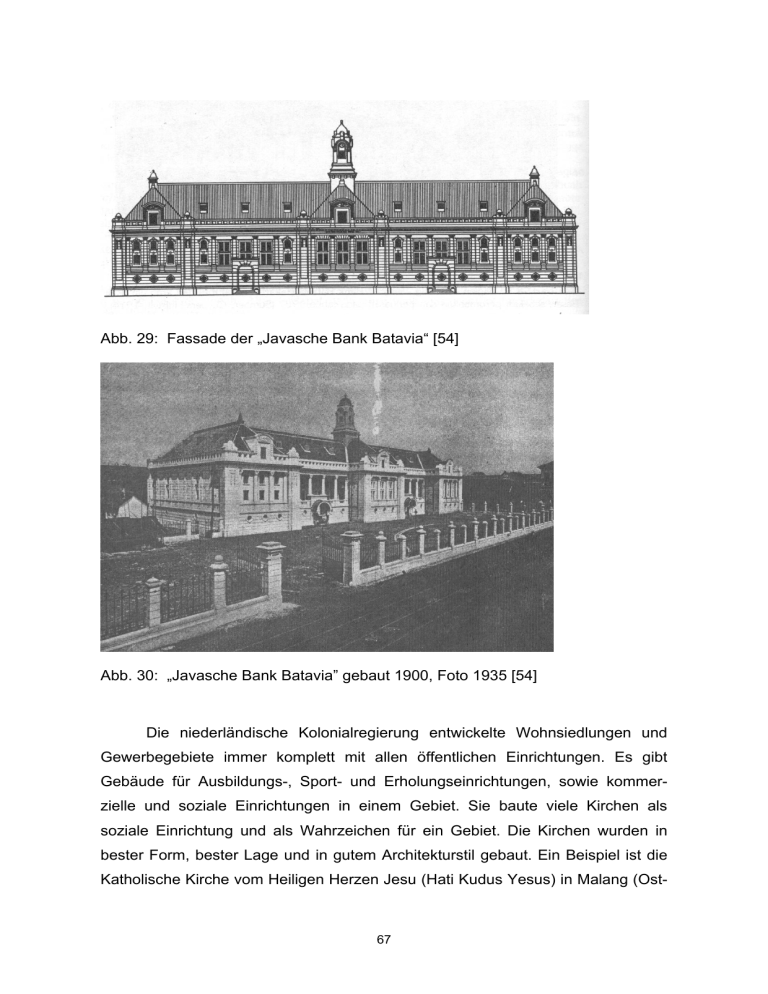 Abb. 29: Fassade der „Javasche Bank Batavia“ [54] Abb. 30: „Javasche Bank Batavia” gebaut 1900, Foto 1935 [54] Die niederländische Kolonialregierung entwickelte Wohnsiedlungen und Gewerbegebiete immer komplett mit allen öffentlichen Einrichtungen. Es gibt Gebäude für Ausbildungs-, Sport- und Erholungseinrichtungen, sowie kommerzielle und soziale Einrichtungen in einem Gebiet. Sie baute viele Kirchen als soziale Einrichtung und als Wahrzeichen für ein Gebiet. Die Kirchen wurden in bester Form, bester Lage und in gutem Architekturstil gebaut. Ein Beispiel ist die Katholische Kirche vom Heiligen Herzen Jesu (Hati Kudus Yesus) in Malang (Ost- 67 Java) im Neogotikstil (Abb. 31 und 32). Da die niederländische Regierung in dieser Zeit kein Geld hatte, baute der Architekt die Kirche ohne Turm. Ende 1930 wurde im Rahmen einer großen Renovierung der Zwillingsturm hinzugefügt. Abb. 31: Katholische Kirche vom Heiligen Herzen Jesu (Hati Kudus Yesus) in Malang (Ost-Java) gebaut 1905, Foto 1930 [55] Abb. 32: Katholische Kirche vom Heiligen Herzen Jesu (Hati Kudus Yesus) in Malang (Ost-Java) renoviert 1930, Foto 1935 [55] 68 Die niederländische Regierung wollte ein Duplikat im Kleinformat von einem berühmten Pilgerziel bauen. In Kediri (Ost-Java) wurde eine Anlage wie in Lourdes (Frankreich) gebaut und man nennt sie das „Lourdes van Java“. Das Kirchengebäude mit Namen „Pohsarang“ wurde in einem traditionellen indonesischen Architekturstil gebaut (Abb.33) [56]. Abb. 33: Katholische Kirche „Pohsarang“ in Kediri gebaut 1936, Foto 1975 [57] Die reichen Niederländer wollten Orte der Erholung in Höhenlagen schaffen. In Bandung, das man das „Paris van Java“ nennt, baute man viele Villen. Die berühmteste ist die Villa Isola im klassischen Stil (Abb. 34). Diese Villa bekam viel Lob von den niederländischen Architekten, weil sie eine gute Anpassung an das Klima mit vielen Ventilationsöffnungen und einem Laubengang um das Gebäude herum hat. Die Villa wurde am Stadtrand von Bandung (WestJava) gebaut [58]. Abb. 34: Villa Isola in Bandung gebaut 1933, Foto 1960 [59] 69 Die Entwicklungsmöglichkeiten für Wohnsiedlungen wurden immer schlechter, weil die reichen Niederländer viele Luxushäuser bauten und man den Eindruck eines exklusiven Wohnviertels bekam. Herman Thomas Karsten hat ein neues Konzept für die Stadtplanung vorgeschlagen. Er wollte in der Planung neuer Wohnsiedlungen eine Einteilung nach sozialen Schichten anstatt ethnischer Trennung erreichen. Die Verteuerung von Luxusgütern zur Subvention der Preise für Grundbedarfsgüter war eine Lösung, um günstige Wohnsiedlungen zu bauen. Die Luxushäuser wurden in Höhenlagen gebaut, wie in Bandung (West-Java) und Malang (Ost-Java), vgl. z.B. Abb. 35. Abb. 35: Erstes Haus in Ijenboulevard in Malang [55] 70 Als Erholungseinrichtung baute die niederländische Regierung viele Opernund Schauspielhäuser. Semarang hat sogar zwei Schauspielhäuser: die „Schouwburg” in der Cendrawasih-Strasse und das Volkstheater „Sobokarti” in der Dr. Cipto-Strasse. Das “Schouwburg” Schauspielhaus hat noch eine europäische Architektur, aber Herman Thomas Karsten hat das Volkstheater „Sobokarti” 1930 in javanischem Architekturstil geplant (Abb. 36). Er war ein Architekt mit einem starken Interesse an lokaler und traditioneller Architektur. Abb. 36: Volkstheater Sobokarti gebaut 1930, Foto 1996 [21] Wegen dem Zusammenwachsen der niederländischen Kolonialarchitektur mit lokalen Bautraditionen und ihre Anpassung an das lokale Klima gibt es viele Gebäude, die von niederländischen Architekten mit vielen lokalen Ornamenten geschmückt worden sind, wie etwa die Dachformen und die Raumgestaltung. Als gutes Beispiel ist dafür die Technische Hochschule in Bandung zu nennen, die von Henry Maclaine Pont 1918 geplant wurde (Abb. 37 und 38). Dieses Gebäude hat ein Lob eines sehr bekannten niederländischen Architekten, Hendrikus Petrus Berlage, bekommen. Er meinte, Henry Maclaine Pont habe bereits eine gute Proportion und Komposition zwischen dem indonesischen Stil, der indonesischen 71 Philosophie und Kunst mit der europäischen Bauform schaffen können. Hendrikus Petrus Berlage hat dieses Gebäude als indonesische Gotik benannt [61]. Abb. 37: Technische Hochschule in Bandung (gebaut von Henry Maclaine Pont 1918-1920) Foto 1934 [61] Abb. 38: Dach der Technischen Hochschule in Bandung „Minangkabau“ Haus aus Sumatra) Foto 1934 [61] (traditionelles 4.1.2. Baukonstruktion Die niederländischen Kolonialbauten wurden zuerst mit einfachen Baukonstruktionen gebaut. Sie benutzten Holzkonstruktionen mit Holzbrettern für die Wände. Danach traten Gebäude mit Ziegelmauerwerk an die Stelle der 72 Holzkonstruktionen. Der Ziegelstein wurde extra aus den Niederlanden importiert, weil er zu jener Zeit in Indonesien nicht hergestellt werden konnte. Der Ziegel diente zugleich auch als Ballast für die niederländischen Schiffe, die im Leerzustand aus den Niederlanden nach Indonesien fuhren. Wegen der einfachen Konstruktion der Schiffe in jener Zeit war die Schifffahrt gefährlich, wenn die Schiffe im Leerzustand fuhren. Auf der Rückfahrt von Indonesien nach den Niederlanden waren sie mit Gewürzen und anderen Kolonialwaren beladen. Das Ziegelmauerwerk in den niederländischen Kolonialbauten war noch einfach. Man benutzte den Ziegelstein als Tragwand. Auch Wandpfeiler (Pilaster) wurden aus Ziegelstein gebaut (Abb. 39). Das damalige Ziegelmauerwerk ist etwa 30 bis 45 cm dick. 30 cm Ziegelmauerwerk 45 cm x 45 cm Pilaster 3 cm Putz 45 cm Ziegelmauerwerk 75 cm x 60 cm Pilaster 3 cm Putz Abb. 39: Ziegelmauerwerk in den ersten niederländischen Kolonialbauten [62] Nach dem Aufkommen der Betonkonstruktion wurde auch diese bei den Kolonialbauten in Indonesien angewandt. Ihre Anwendung basierte noch auf einer einfachen Technologie. Der Beton wurde nur als Ersatz für das Holz verwendet, die Konstruktion blieb die gleiche. Als Tragsystem benutzten die niede