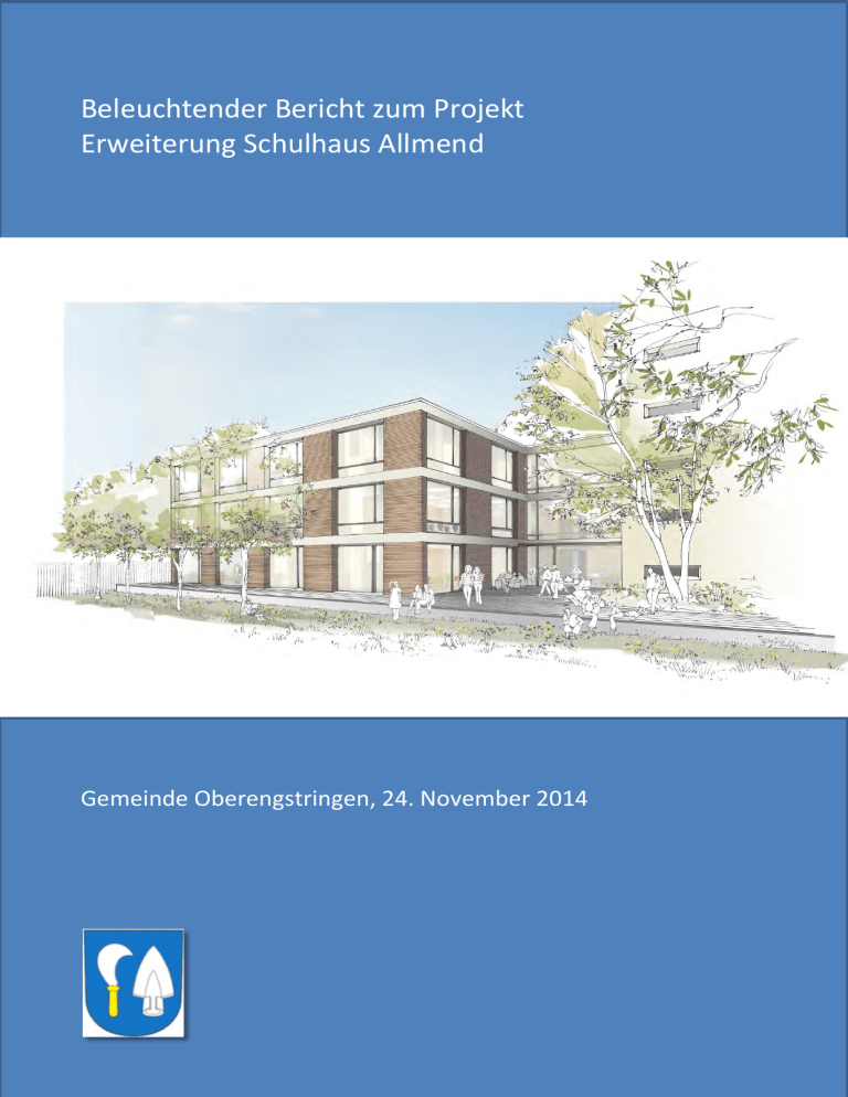 Beleuchtender Bericht zum Projekt Erweiterung Schulhaus Allmend Gemeinde Oberengstringen, 24. November 2014 1 Inhaltsverzeichnis 1. Antrag .........................................................................................................................................................4 2. Stellungnahme der Schulpflege Oberengstringen ......................................................................................5 3. Einleitung ....................................................................................................................................................7 4. Stellungnahme des Gemeinderates............................................................................................................7 5. Projektbeschrieb des Architekten ..............................................................................................................8 5.1. Ausgangslage ......................................................................................................................................8 5.2. Städtebau ...........................................................................................................................................8 5.3. Projekt ................................................................................................................................................8 5.4. Konstruktion .......................................................................................................................................9 5.5. Denkmalpflege....................................................................................................................................9 5.6. AWEL (Amt für Abfall, Wasser, Energie und Luft) ..............................................................................9 5.7. Raumprogramm............................................................................................................................... 10 5.7.1. Erweiterung ......................................................................................................................... 10 5.7.2. Bestehendes Schulhaus ....................................................................................................... 10 5.8. Kosten: ............................................................................................................................................. 10 5.9. Beiträge von Dritten: ....................................................................................................................... 11 5.10.Terminplan: ..................................................................................................................................... 11 6. Projektbeschrieb des Bauingenieurs ....................................................................................................... 11 6.1. Statisches Konzept ........................................................................................................................... 11 6.2. Tragstruktur ..................................................................................................................................... 11 7. Projektbeschrieb des Holzbauingenieurs ................................................................................................ 11 7.1. Statikkonzept ................................................................................................................................... 11 7.2. Wandkonstruktion ........................................................................................................................... 11 7.3. Fassade ............................................................................................................................................ 12 8. Projektbeschrieb des Elektroingenieurs .................................................................................................. 12 8.1. Erweiterungsbau.............................................................................................................................. 12 8.2. Bestehendes Schulhaus: .................................................................................................................. 12 9. Projektbeschrieb des Heizungsingenieurs ............................................................................................... 12 9.1. Erweiterungsbau.............................................................................................................................. 12 9.2. Bestehendes Schulhaus ................................................................................................................... 12 10. Projektbeschrieb des Lüftungsingenieurs................................................................................................ 13 10.1.Erweiterungsbau.............................................................................................................................. 13 10.2.Bestehendes Schulhaus ................................................................................................................... 13 11. Projektbeschrieb des Sanitäringenieurs .................................................................................................. 13 11.1.Erweiterungsbau.............................................................................................................................. 13 11.2.Bestehendes Schulhaus ................................................................................................................... 13 12. Projektbeschrieb des Landschaftsarchitekten ......................................................................................... 14 12.1.Sanierung bestehender Pausenhof ................................................................................................. 14 12.2.Umgebung Erweiterungsbau ........................................................................................................... 14 12.3.Vegetationskonzept Erweiterungsbau ......................................