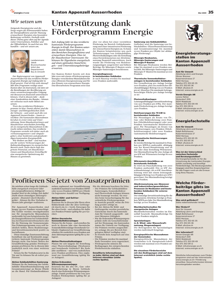 Kanton Appenzell Ausserrhoden Wir setzen um Steigende Energiepreise und die Sorge wegen des Klimawandels haben der Energieeffizienz und der Nutzung erneuerbarer Energien eine besondere Bedeutung verliehen. Deshalb steht dieses Thema ganz oben auf der Agenda vieler Unternehmen, Politiker und der Öffentlichkeit. So auch bei uns. Wir handeln – und wir setzen um. Landammann Jakob Brunnschweiler leitet das Departement Bau & Umwelt Der Regierungsrat von Appenzell Ausserrhoden hat das revidierte Förderprogramm Energie auf Anfang Jahr in Kraft gesetzt. Und ich bin stolz darauf! Mit dem Programm verfügt unser Kanton über ein Instrument, mit dem wir die Bemühungen der Bevölkerung um einen verantwortungsvollen Umgang mit Ressourcen finanziell unterstützen können. Und in diesem Jahr – dank einer Sonderaktion des Bundes – können wir teilweise noch mehr Mittel einsetzen. Trotz des revidierten Förderprogramms ist klar: Damit alleine sind die energie- und klimapolitischen Ziele der Schweiz – und somit auch die von Appenzell Ausserrhoden – kaum erreichbar. Die kantonalen Massnahmen beruhen in erster Linie auf Unterstützung. Denn Hausbesitzerinnen und Hausbesitzer entscheiden freiwillig, ob sie energetische Massnahmen in Betracht ziehen möchten. Das revidierte Programm versteht sich daher auch als «Umsetzungsmotor» und «Impulsgeber» einer konkreten und glaubwürdigen kantonalen Energiepolitik. Wir bleiben am Ball – und machen uns für weitere Verbesserungen der Rahmenbedingungen im energetischen Bereich stark. Denn darin liegt das grösste Potenzial, um Hausbesitzerinnen und Hausbesitzer freiwillig für eine energetische Optimierung des Hauses zu gewinnen. Für Appenzell Ausserrhoden sind knapp 545 000 Franken veranschlagt. Die Gelder werden zweckgebunden nur für energetische Massnahmen ausbezahlt; bei uns beispielsweise für die Energieeffizienz bei Gebäudehüllen, bei Dauerstromverbrauchern oder für die Nutzung der Sonnenenergie. Das Prämienprogramm 2009 soll zusätzlich helfen, Ihren Realisierungsund Investitionsentscheid positiv zu beeinflussen. Diese einmalige Zusatzausschüttung beeinflusst das auf Kontinuität ausgerichtete kantonale Förderprogramm Energie nicht. Das heisst: Neben der Grundförderung gemäss Förderprogramm profitieren Sie in diesem Jahr zusätzlich noch von einer weiteren Prämie! Setzen Sie Ihr Vorhaben jetzt in die Tat um! So können Sie ab sofort profitieren: Aktion Gebäudehüllen-Sanierung Nehmen Sie die Sanierung der Gebäudehülle (Einzelbauteilsanierung und Gesamtsanierung) an Ihrem Objekt an die Hand. Für Einfamilienhäuser 35 Unterstützung dank Förderprogramm Energie Seit Anfang Jahr ist das revidierte kantonale Förderprogramm Energie in Kraft. Der Kanton unterstützt damit Massnahmen in den Bereichen Energieeffizienz und erneuerbare Energien. Dies ist für Hausbesitzer interessant: Sie können ihr Eigenheim energetisch auf einen optimalen Stand bringen – und Unterstützungsbeiträge erwarten. aber vor allem bei einer verstärkten Förderung im Bereich Gebäudesanierung und einer intensiveren Förderung der erneuerbaren Energien an. So kann der Kanton beispielsweise neu auch Teilsanierungen von Gebäudehüllen, Photovoltaikanlagen oder die Erstellung eines Fernwärmenetzes zur Abwärmenutzung finanziell unterstützen. Auch wurde die Förderung von Holzfeuerungsanlagen ausgeweitet und höhere Beiträge für Minergie-P-Bauten sowie Minergie-Sanierungen beschlossen: Der Kanton fördert bereits seit dem Jahr 2000 mit einem «Förderprogramm Energie» verschiedene Massnahmen für eine effiziente Energienutzung und für den Einsatz von erneuerbarer Energie. Das überarbeitete Programm setzt nun Energiediagnosen in bestehenden Gebäuden Je nach Haustyp werden bis maximal 1000 Franken ausbezahlt. Sanierung von Gebäudehüllen Gefördert wird die Sanierung von Gebäudehüllen (Einzelbauteilsanierung und Gesamtsanierung) bis maximal 25 000 Franken pro Objekt (m2-abhängige Förderung). Minergie-Neubauten, Minergie-Sanierungen und Minergie-P-Bauten Bei Minergie-Neubauten werden Beiträge bis maximal 10 000 Franken ausbezahlt. Bei Minergie-Sanierungen und Minergie-P–Bauten bis maximal 30 000 Franken. Thermische Sonnenkollektoranlagen in bestehenden Gebäuden Der Grundbeitrag pro Anlage beträgt 1000 Franken, plus ein zusätzlicher flächenabhängiger Beitrag von 100 Franken pro m2 Absorber. Die maximale beitragsberechtigte Fläche pro Anlage beträgt 20 m2. Photovoltaikanlagen Leistungsabhängiger Investitionsbeitrag von 1500 Franken pro kWp. Der maximale Förderbeitrag pro Anlage beträgt 7500 Franken. Holzfeuerungen bis 70 kW in bestehenden Gebäuden Für Neuanlagen als Ersatz von Öl-, Gas- oder Elektroheizung: 2000 Franken (Stückholzfeuerungen) oder 3000 Franken (automatische Holzfeuerungen). Für Neuanlagen als Ersatz von Holzfeuerungen: 1500 Franken (Stückholzfeuerungen) oder 2000 Franken (automatische Holzfeuerungen). Automatische Holzfeuerungen ab 70 kW Es werden Beiträge bis maximal 60 Franken pro MWh/a ausbezahlt, abhängig von der Kessel-Nennleistung und ob mit oder ohne Erstellung Wärmenetz. Der Maximalbeitrag für eine Anlage ab 500 kW mit Wärmenetz beträgt 80 000 Franken. Profitieren Sie jetzt von Zusatzprämien Sie möchten schon lange die Gebäudehülle energetisch erneuern? Oder ein energieeffizienteres Kühlgerät kaufen? Jetzt ist die richtige Zeit dafür! Dank einem einmaligen Aktionsprogramm – finanziert durch Bundesgelder – können Sie Ihre Vorhaben in diesem Jahr günstiger realisieren. Mai 2009 stehen ergänzend zur Grundförderung zusätzlich maximal 10 000 Franken (EFH) oder 25 000 Franken (MFH) pro Objekt (in begrenzter Anzahl) zur Verfügung. Aktion Kühl- und Gefriergeräteersatz Ersetzen Sie in diesem Jahr Ihren alten Kühlschrank oder Ihr altes Gefriergerät durch ein A++ Gerät. Entsorgen Sie Ihr altes Gerät – und erhalten Sie dafür 200 Franken Prämie (gültig für 400 Geräte). Aktion thermische