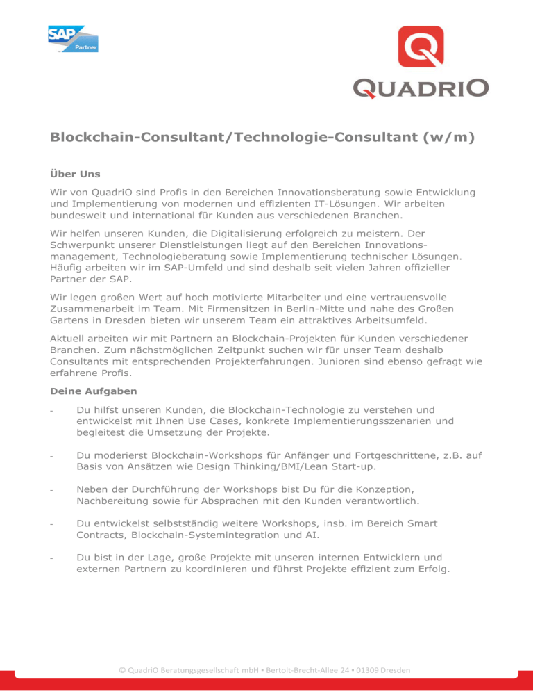 Blockchain-Consultant/Technologie-Consultant (w/m) Über Uns Wir von QuadriO sind Profis in den Bereichen Innovationsberatung sowie Entwicklung und Implementierung von modernen und effizienten IT-Lösungen. Wir arbeiten bundesweit und international für Kunden aus verschiedenen Branchen. Wir helfen unseren Kunden, die Digitalisierung erfolgreich zu meistern. Der Schwerpunkt unserer Dienstleistungen liegt auf den Bereichen Innovationsmanagement, Technologieberatung sowie Implementierung technischer Lösungen. Häufig arbeiten wir im SAP-Umfeld und sind deshalb seit vielen Jahren offizieller Partner der SAP. Wir legen großen Wert auf hoch motivierte Mitarbeiter und eine vertrauensvolle Zusammenarbeit im Team. Mit Firmensitzen in Berlin-Mitte und nahe des Großen Gartens in Dresden bieten wir unserem Team ein attraktives Arbeitsumfeld. Aktuell arbeiten wir mit Partnern an Blockchain-Projekten für Kunden verschiedener Branchen. Zum nächstmöglichen Zeitpunkt suchen wir für unser Team deshalb Consultants mit entsprechenden Projekterfahrungen. Junioren sind ebenso gefragt wie erfahrene Profis. Deine Aufgaben - Du hilfst unseren Kunden, die Blockchain-Technologie zu verstehen und entwickelst mit Ihnen Use Cases, konkrete Implementierungsszenarien und begleitest die Umsetzung der Projekte. - Du moderierst Blockchain-Workshops für Anfänger und Fortgeschrittene, z.B. auf Basis von Ansätzen wie Design Thinking/BMI/Lean Start-up. - Neben der Durchführung der Workshops bist Du für die Konzeption, Nachbereitung sowie für Absprachen mit den Kunden verantwortlich. - Du entwickelst selbstständig weitere Workshops, insb. im Bereich Smart Contracts, Blockchain-Systemintegration und AI. - Du bist in der Lage, große Projekte mit unseren internen Entwicklern und externen Partnern zu koordinieren und führst Projekte effizient zum Erfolg. © QuadriO Beratungsgesellschaft mbH ▪ Bertolt-Brecht-Allee 24 ▪ 01309 Dresden Dein Profil - Du hast Erfahrung im Bereich Blockchain-Consulting sowie optimaler Weise in weiteren aktuellen Themenfeldern der Digitalisierung (v.a. AI, IoT, Security). - Du bist in der Lage, dich in die Branchen und Anforderungen Deiner Kunden hineinzudenken. - Du setzt Impulse für die Entwicklung von Themen und Strategien zur weiteren Ausrichtung von QuadriO. - Optimaler Weise bringst du technische Fähigkeiten mit (z.B. ConsensusProtokolle und relevante Programmiersprachen wie C, C++, Node.js, Go, Rust, Haskell, Erlang, Clojure und Solidity). - Du siehst Deine Tätigkeit als Dienstleistung. Das heißt, Du kannst Dich in die Anforderungen und Wünsche unserer Kunden hineindenken und bist daran interessiert, die technisch und wirtschaftlich beste Lösung zu finden. - Du hast stark ausgeprägte analytische Fähigkeiten und Du bist in der Lage, komplexe Sachverhalte zu erschließen sowie in Wort und Schrift wiederzugeben. - Du hast Spaß an einer Reisetätigkeit und freust Dich auf die unterschiedlichen Standorte unserer Kunden. - Du sprichst fließend Deutsch und Englisch und hast eine EU-weit gültige Arbeitserlaubnis. Das bieten wir Die persönlichen Wünsche und Bedürfnisse unserer Mitarbeiter sind uns sehr wichtig. Daher bieten wir flexible Tätigkeits- und Arbeitszeitmodelle und gehen auf Deine Wünsche zur gezielten beruflichen Weiterentwicklung ein. In einer flachen Hierarchie kannst Du Deine Fähigkeiten jederzeit einbringen und Dich beruflich und persönlich weiterentwickeln. Die Übernahme von Verantwortung in Form von Themen- oder Teamentwicklung ist ein möglicher und gewünschter Bestandteil Deiner Entwicklung bei uns. Weiterhin bieten wir ein attraktives und konkurrenzfähiges Gehalts- und Mobilitätspaket sowie Start-up- Atmosphäre. Bei uns erwartet Dich ein angenehmes Arbeitsumfeld in einem motivierten und internationalen Team. Kontakt Deine Fragen oder elektronische Bewerbung sendest Du bitte an [email protected] © QuadriO Beratungsgesellschaft mbH ▪ Bertolt-Brecht-Allee 24 ▪ 01309 Dresden