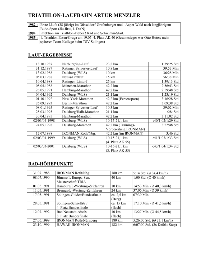 TRIATHLON-LAUFBAHN ARTUR MENZLER 1982 : Erste Läufe (38-jährig) im Düsseldorf-Grafenberger und –Aaper Wald nach langjährigem Budo-Sport (Jiu Jitsu, I. DAN) 1984 : Infektion am Triathlon-Fieber ! Rad und Schwimm-Start. 1985 : 1. Triathlon Essen/Gruga am 19.05. 4. Platz AK 40 (Gesamtsieger war Otto Hoter; mein späterer Team-Kollege beim TSV Solingen) LAUF-ERGEBNISSE 18.10.1987 31.12.1987 13.02.1988 05.03.1988 10.04.1988 08.05.1988 26.05.1991 04.04.1992 01.10.1992 26.09.1993 08.01.1995 25.03.1995 30.04.1995 02/03/04-1998 24.05.1998 Nürburgring-Lauf Ratinger Sylvester-Lauf Duisburg (WLS) Neuss/Erftlauf Ratingen-Lintorf München-Marathon Hamburg-Marathon Duisburg (WLS) New-York-Marathon Berlin-Marathon Ratinger Sylvester-Lauf Duisburg/Halb-Marathon Hamburg-Marathon Duisburg (WLS) Duisburg-Marathon 12.07.1998 02/03/04-1999 IRONMAN Roth/Nbg. Duisburg (WLS) 02/03/03-2001 Duisburg (WLS) 23,8 km 10,8 km 10 km 15 km 25 km 42,2 km 42,2 km 21,1 km 42,2 km (Fersensporn) 42,2 km 10,3 km 21,1 km 42,2 km 10-15-21,1 km 42,2 km (TrainingsVorbereitung IRONMAN) 42,2 km (im IRONMAN) 10-15-21,1 km (4. Platz AK 55) 10-15-21,1 km (3. Platz AK 55) 1:39:25 Std. 39:53 Min. 36:28 Min. 56:38 Min. 1:39:13 Std. 2:56:43 Std. 2:59:48 Std. 1:23:19 Std. 3:16:28 Std. 3:09:38 Std. 39:02 Min. 1:28: Std. 3:11:02 Std. -:40/1:02/1:29 Std. 3:22:48 Std. 3:46 Std. -:41/1:03/1:33 Std. -:43/1:04/1:34 Std. RAD-HÖHEPUNKTE 31.07.1988 08.07.1990 01.05.1991 11.05.1991 17.05.1991 28.05.1991 12.07.1992 27.06.1999 23.10.1999 IRONMAN Roth/Nbg. Jümme/1. Europa-Sen. Meisterschaft TRIA Hamburg/L-Wertung-Zeitfahren Bremen/L-Wertung-Zeitfahren Solingen-Glüder/Bundesfinale Solingen-Schnellstr./ 4. Platz Bundesfinale Bad Neustadt-Aisch/ 8. Platz Bundesfinale IRONMAN Roth/Nürnberg HAWAII-IRONMAN 180 km 40 km 5:14 Std. (Ø 34,4 km/h) 1:00 Std. (Ø 40 km/h) 10 km 24 km ca. 2,5 km (Berg) ca. 15 km (flach) 10 km (flach) 180 km 182 km 14:53 Min. (Ø 40,3 km/h) 37:06 Min. (Ø 39 km/h) 07:39 Min. 17:10 Min. (Ø 41,5 km/h) 13:27 Min. (Ø 44,5 km/h) 5:26:00 Std. (Ø 33,1 km/h) 6:07:00 Std. (2x Defekt-Stop) SCHWIMM-RESULTATE (im Triathlon) 10.05.1987 24.05.1987 Neuss/Kurz-Triathlon Hilden/Kurz-Triathlon 29.05.1987 23.07.1987 12.09.1987 Ratingen St. Wendel/Dt. Meisterschaft Triathlon Tegelen/Holland 31.07.1988 IRONMAN Roth/Nbg. 1.000 m (50m-Bahn) 16:08 Min. 1.000 m (50m-Bahn) 15:46 Min. (im TRI 3. Platz gesamt) 3.000 m (50m-Bahn) 52:46 Min. 1.500 m 24:45 Min. (Freigewässer) 1.900 m 30:58 Min. (Freigewässer) 3.800 m (Kanal) 1:04 Std. TRIATHLON-WETTKÄMPFE 03.10.1987 24.07.1988 31.07.1988 27.05.1990 08.07.1990 21.07.1990 29.07.1990 28.08.1990 04.08.1991 08.09.1991 02.08.1992 16.08.1992 06.09.1992 10.07.1993 04.08.1994 10.06.1995 25.06.1995 09.07.1995 26.08.1995 22.06.1997 27.07.1997 31.08.1997 06.09.1997 07.06.1998 12.07.1998 06.09.1998 20.09.1998 30.05.1999 Charlottsville/West-Virginia USA Kurz-Distanz Düsseldorf Deutschland-Cup Kurz-D. IRONMAN Europe Roth 3800/180/42,2 Sprint Kamen Westdtsch. S.M. 1. ESM Jümme, Kurz-D. DSM Losheim, Kurz-D. Westdtsch. M. Köln, Mittel-D. Krefeld, Kurz-D. Westdt. Mittel-M. Köln Tegelen Mittel-D. Holland Westdt. Mittel-M. Kaarst DSM Köln Westdt. Sprint-M. Xanten Mittel-D. Xanten Köln Kurz-D. Marienfeld-Harsewinkel Mittel-D. 2000/66/15 Dortmund-Hombruch Kurz-D. 1000/37/10 IRONMAN Roth 3800/180/42,2 DSM Olpe Kurz-D. 1500/45/10,5 Bonn Mittel-D. 4000/60/15 Bostalsee/Sauerland Mittel-D. 2300/84/21 Krefeld Kurz-D. 1500/38/10 Xanten Kurz-D. 1500/38/10 Marienfeld-Harsewinkel Mittel-D. 2000/85/20 IRONMAN Roth 3800/180/42 Xanten Kurz-D. 1500/38/10,5 Spalt/Powerman DUA-Mittel 20/116/10,5 Marienfeld-Harsewinkel Mittel-D. 2000/82/20 2. Platz AK 40 2. Platz AK 40 (Dtsch. Vize-Meister) 13. Platz AK 40 (S 1:04/R 5:14/L 3:49) 2. Platz AK 45 (Westdt. Vize) 20. Platz AK 45 7. Platz AK 45 2. Platz AK 45 (Westdt. Vize) 1. Platz AK 45 3. Platz AK 45(Rad-Sturz) 2. Platz AK 45 3. Platz AK 45 10. Platz AK 45 1. Platz AK 45(Westdt. Meister) 1. Platz AK 45 1. Platz AK 50 1. Platz AK 50 2:31 Std. 2:24:15 Std. 10:10:31 Std. 1:00:27 Std. 2:12:54 Std. 2:24:16 Std. 4:38 Std. 2:07:48 Std. 4:30 Std. 4:44 Std. 4:18 Std. 2:17 Std. 1:04 Std. 3:27 Std. 2:23:26 Std. 3:46 Std. 1. Platz AK 50 2:04 Std. 12. Platz AK 50 (Rad-Sturz/37°C) 7. Platz AK 50 11:18 Std 1. Platz AK 50 1. Platz AK 50 3:21 Std. 5:08 Std. 2. Platz AK 50 1. Platz AK 50 2. Platz AK 50 2:15 Std. 2:18 Std. 4:26 Std. (1:13/5:41/3:46) 2. Platz AK 55 1. Platz AK 55 2:49 Std. 10:47 Std. 2:16 Std. 6:38 Std. 4:52 Std. 27.06.1999 IRONMAN Europe Roth 07.08.1999 Hückeswagen Mitteld. 2000/76/21 Krefeld Kurz-D. Hawaii-IRONMAN 22.08.1999 23.10.1999 04.06.2000 23.07.2000 27.08.2000 03.09.2000 Marienfeld-Harsewinkel Mitteld. 2000/85/20 DSM Losheim/Saarland Kurzd. Krefeld Kurzd. Westdt. M. Xanten Kurzd. 4. Platz AK 55 (Hawaii-Qualif.) (1:14/5:26/4:13) 2. Platz AK 55 10:59 Std. 1. Platz AK 55 12. Platz AK 55 (1:23/6:07/4:23) 1. Platz AK 55 2:12 Std. 12:04 Std. 4:42 Std. 4:55 Std. (Dt. Vizemeister AK 55) 2:35 Std. 1. Platz AK 55 (NRW-Meister AK 55) 2:15 Std. 2:13 Std.