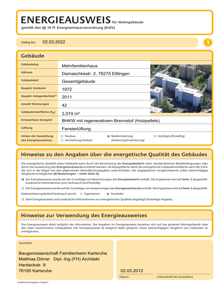 ENERGIEAUSWEIS für Wohngebäude gemäß den §§ 16 ff. Energieeinsparverordnung (EnEV) Gültig bis: 02.03.2022 1 Gebäude Gebäudetyp Mehrfamilienhaus Adresse Damaschkestr. 2, 76275 Ettlingen Gebäudeteil Gesamtgebäude Baujahr Gebäude 1972 Baujahr Anlagentechnik1) 2011 Anzahl Wohnungen 42 Gebäudenutzfläche (AN) 3.074 m² Erneuerbare Energien BHKW mit regenerativem Brennstof (Holzpellets) Lüftung Fensterlüftung Anlass der Ausstellung des Energieausweises Gebäudefoto (freiwillig) Neubau Vermietung/Verkauf Modernisierung (Änderung/Erweiterung) Sonstiges (freiwillig) Hinweise zu den Angaben über die energetische Qualität des Gebäudes Die energetische Qualität eines Gebäudes kann durch die Berechnung des Energiebedarfs unter standardisierten Randbedingungen oder durch die Auswertung des Energieverbrauchs ermittelt werden. Als Bezugsfläche dient die energetische Gebäudenutzfläche nach der EnEV, die sich in der Regel von den allgemeinen Wohnflächenangaben unterscheidet. Die angegebenen Vergleichswerte sollen überschlägige Vergleiche ermöglichen (Erläuterungen – siehe Seite 4). Der Energieausweis wurde auf der Grundlage von Berechnungen des Energiebedarfs erstellt. Die Ergebnisse sind auf Seite 2 dargestellt. Zusätzliche Informationen zum Verbrauch sind freiwillig. Der Energieausweis wurde auf der Grundlage von Auswertungen des Energieverbrauchs erstellt. Die Ergebnisse sind auf Seite 3 dargestellt. Datenerhebung Bedarf/Verbrauch durch: Eigentümer Aussteller Dem Energieausweis sind zusätzliche Informationen zur energetischen Qualität beigefügt (freiwillige Angabe). Hinweise zur Verwendung des Energieausweises Der Energieausweis dient lediglich der Information. Die Angaben im Energieausweis beziehen sich auf das gesamte Wohngebäude oder den oben bezeichneten Gebäudeteil. Der Energieausweis ist lediglich dafür gedacht, einen überschlägigen Vergleich von Gebäuden zu ermöglichen. Aussteller Baugenossenschaft Familienheim Karlsruhe Matthias Dörrer Dipl.-Ing (FH) Architekt Hardeckstr. 9 76185 Karlsruhe 02.03.2012 Datum 1) Mehrfachangaben möglich Unterschrift des Ausstellers ENERGIEAUSWEIS für Wohngebäude gemäß den §§ 16 ff. Energieeinsparverordnung (EnEV) Damaschkestr. 2 Gesamtgebäude Berechneter Energiebedarf des Gebäudes 2 Energiebedarf CO2-Emissionen1) 11 [kg/(m²·a)] Endenergiebedarf 152 0 50 100 48 150 kWh/(m²·a) 200 250 300 350 ≥ 400 kWh/(m²·a) Primärenergiebedarf "Gesamtenergieeffizienz" Anforderungen gemäß EnEV 2) Für Energiebedarfsberechnungen verwendetes Verfahren Primärenergiebedarf Ist-Wert 48 kWh/(m2 ·a) Anforderungswert 56 kWh/(m2 ·a) Verfahren nach DIN V 4108-6 und DIN V 4701-10 Verfahren nach DIN V 18599 Energetische Qualität der Gebäudehülle H’T Ist-Wert 1,11 W/(m2 ·K) Anforderungswert Sommerlicher Wärmeschutz (bei Neubau) W/(m2 ·K) Vereinfachungen nach § 9 Abs. 2 EnEV eingehalten Endenergiebedarf Energieträger Jährlicher Endenergiebedarf in kWh/(m2 ·a) für Heizung Warmwasser Hilfsgeräte 4) Erdgas H KWK (regenerativ) Strom-Mix 29,4 67,6 0,0 11,3 42,5 0,0 Gesamt in kWh/(m2 ·a) 0,0 0,0 1,1 40,7 110,1 1,1 Vergleichswerte Endenergiebedarf Ersatzmaßnahmen 3) Anforderungen nach § 7 Nr. 2 EEWärmeG kWh/(m2 ·a) Transmissionswärmeverlust H’T Verschärfter Anforderungswert: W/(m2 ·K) au s 100 150 200 250 300 350 ≥ 400 Ne ub au H Ne ub EF au H gu en e t m rg od eti er sch ni sie rt Du W rch oh sc ng hn eb itt M äu FH de we e se ne nt rg lic eti h m sc EF od h ni H er ch we e ni t se ne sie nt rg rt lic eti h m sc h od ni er ch ni t sie rt Verschärfter Anforderungswert: M Primärenergiebedarf FH % verschärft. 50 vh Die Anforderungswerte der EnEV sind um Pa ssi Anforderungen nach § 7 Nr. 2 i. V. m. § 8 EEWärmeG 0 EF Die um 15 % verschärften Anforderungswerte sind eingehalten. 5) Erläuterungen zum Berechnungsverfahren Die Energieeinsparverordnung lässt für die Berechnung des Energiebedarfs zwei alternative Berechnungsverfahren zu, die im Einzelfall zu unterschiedlichen Ergebnissen führen können. Insbesondere wegen standardisierter Randbedingungen erlauben die angegebenen Werte keine Rückschlüsse auf den tatsächlichen Energieverbrauch. Die ausgewiesenen Bedarfswerte sind spezifische Werte nach der EnEV pro Quadratmeter Gebäudenutzfläche (AN). 1) Freiwillige Angabe 2) bei Neubau sowie bei Modernisierung im Fall des § 16 Abs. 1 Satz 2 EnEV 3) nur bei Neubau im Falle der Anwendung von § 7 Nr. 2 Erneuerbare-Energien-Wärmegesetz 4) Ggf. einschließlich Kühlung 5) EFH: Einfamilienhäuser, MFH: Mehrfamilienhäuser ENERGIEAUSWEIS für Wohngebäude gemäß den §§ 16 ff. Energieeinsparverordnung (EnEV) Erfasster Energieverbrauch des Gebäudes 3 Energieverbrauchskennwert 0 50 Energieverbrauch für Warmwasser: 100 150 enthalten 200 250 300 350 ≥ 400 nicht enthalten Das Gebäude wird auch gekühlt; der typische Energieverbrauch für Kühlung beträgt bei zeitgemäßen Geräten etwa 6 kWh je m2 Gebäudenutzfläche und Jahr und ist im Energieverbrauchskennwert nicht enthalten. Verbrauchserfassung – Heizung und Warmwasser Energieträger Zeitraum von Energieverbrauch [kWh] bis Anteil Warmwasser [kWh] Klimafaktor Energieverbrauchskennwert in kWh/(m2 ·a) (zeitlich bereinigt, klimabereinigt) Heizung Warmwasser Kennwert Durchschnitt Vergleichswerte Endenergiebedarf 150 200 250 300 350 ≥ 400 Soll ein Energieverbrauchskennwert verglichen werden, der keinen Warmwasseranteil enthält, ist zu beachten, dass auf die Warmwasserbereitung je nach Gebäudegröße 20 – 40 kWh/(m2 ·a) entfallen können. EF FH M Pa ssi v 100 Ne ub au H Ne ub EF au H gu en t m erg od eti er sch ni sie rt Du W rch oh sc ng hn eb itt M äu F de we H e n se nt erg lic eti h m sc EF od h ni H er ch we e ni t se ne sie r nt rt lic geti h m sc h od ni er ch ni t sie rt 50 ha us 0 Die modellhaft ermittelten Vergleichswerte beziehen sich auf Gebäude, in denen die Wärme für Heizung und Warmwasser durch Heizkessel im Gebäude bereitgestellt 