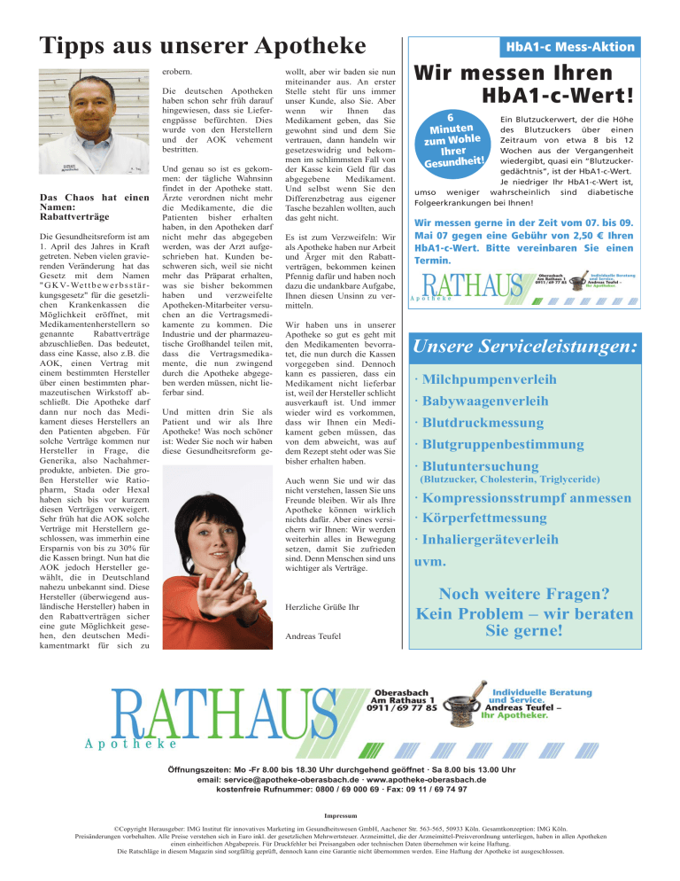 Tipps aus unserer Apotheke erobern. Die deutschen Apotheken haben schon sehr früh darauf hingewiesen, dass sie Lieferengpässe befürchten. Dies wurde von den Herstellern und der AOK vehement bestritten. Das Chaos hat einen Namen: Rabattverträge Die Gesundheitsreform ist am 1. April des Jahres in Kraft getreten. Neben vielen gravierenden Veränderung hat das Gesetz mit dem Namen " G K V- We t t b e w e r b s s t ä rkungsgesetz" für die gesetzlichen Krankenkassen die Möglichkeit eröffnet, mit Medikamentenherstellern so genannte Rabattverträge abzuschließen. Das bedeutet, dass eine Kasse, also z.B. die AOK, einen Vertrag mit einem bestimmten Hersteller über einen bestimmten pharmazeutischen Wirkstoff abschließt. Die Apotheke darf dann nur noch das Medikament dieses Herstellers an den Patienten abgeben. Für solche Verträge kommen nur Hersteller in Frage, die Generika, also Nachahmerprodukte, anbieten. Die großen Hersteller wie Ratiopharm, Stada oder Hexal haben sich bis vor kurzem diesen Verträgen verweigert. Sehr früh hat die AOK solche Verträge mit Herstellern geschlossen, was immerhin eine Ersparnis von bis zu 30% für die Kassen bringt. Nun hat die AOK jedoch Hersteller gewählt, die in Deutschland nahezu unbekannt sind. Diese Hersteller (überwiegend ausländische Hersteller) haben in den Rabattverträgen sicher eine gute Möglichkeit gesehen, den deutschen Medikamentmarkt für sich zu Und genau so ist es gekommen: der tägliche Wahnsinn findet in der Apotheke statt. Ärzte verordnen nicht mehr die Medikamente, die die Patienten bisher erhalten haben, in den Apotheken darf nicht mehr das abgegeben werden, was der Arzt aufgeschrieben hat. Kunden beschweren sich, weil sie nicht mehr das Präparat erhalten, was sie bisher bekommen haben und verzweifelte Apotheken-Mitarbeiter versuchen an die Vertragsmedikamente zu kommen. Die Industrie und der pharmazeutische Großhandel teilen mit, dass die Vertragsmedikamente, die nun zwingend durch die Apotheke abgegeben werden müssen, nicht lieferbar sind. Und mitten drin Sie als Patient und wir als Ihre Apotheke! Was noch schöner ist: Weder Sie noch wir haben diese Gesundheitsreform ge- wollt, aber wir baden sie nun miteinander aus. An erster Stelle steht für uns immer unser Kunde, also Sie. Aber wenn wir Ihnen das Medikament geben, das Sie gewohnt sind und dem Sie vertrauen, dann handeln wir gesetzeswidrig und bekommen im schlimmsten Fall von der Kasse kein Geld für das abgegebene Medikament. Und selbst wenn Sie den Differenzbetrag aus eigener Tasche bezahlen wollten, auch das geht nicht. Es ist zum Verzweifeln: Wir als Apotheke haben nur Arbeit und Ärger mit den Rabattverträgen, bekommen keinen Pfennig dafür und haben noch dazu die undankbare Aufgabe, Ihnen diesen Unsinn zu vermitteln. Wir haben uns in unserer Apotheke so gut es geht mit den Medikamenten bevorratet, die nun durch die Kassen vorgegeben sind. Dennoch kann es passieren, dass ein Medikament nicht lieferbar ist, weil der Hersteller schlicht ausverkauft ist. Und immer wieder wird es vorkommen, dass wir Ihnen ein Medikament geben müssen, das von dem abweicht, was auf dem Rezept steht oder was Sie bisher erhalten haben. Auch wenn Sie und wir das nicht verstehen, lassen Sie uns Freunde bleiben. Wir als Ihre Apotheke können wirklich nichts dafür. Aber eines versichern wir Ihnen: Wir werden weiterhin alles in Bewegung setzen, damit Sie zufrieden sind. Denn Menschen sind uns wichtiger als Verträge. Herzliche Grüße Ihr Andreas Teufel HbA1-c Mess-Aktion Wir messen Ihren HbA1-c-Wert! 6 Minuten zum Wohle Ihrer Gesundheit! Ein Blutzuckerwert, der die Höhe des Blutzuckers über einen Zeitraum von etwa 8 bis 12 Wochen aus der Vergangenheit wiedergibt, quasi ein “Blutzuckergedächtnis”, ist der HbA1-c-Wert. Je niedriger Ihr HbA1-c-Wert ist, umso weniger wahrscheinlich sind diabetische Folgeerkrankungen bei Ihnen! Wir messen gerne in der Zeit vom 07. bis 09. Mai 07 gegen eine Gebühr von 2,50 € Ihren HbA1-c-Wert. Bitte vereinbaren Sie einen Termin. Unsere Serviceleistungen: · Milchpumpenverleih · Babywaagenverleih · Blutdruckmessung · Blutgruppenbestimmung · Blutuntersuchung (Blutzucker, Cholesterin, Triglyceride) · Kompressionsstrumpf anmessen · Körperfettmessung · Inhaliergeräteverleih uvm. Noch weitere Fragen? Kein Problem – wir beraten Sie gerne! Öffnungszeiten: Mo -Fr 8.00 bis 18.30 Uhr durchgehend geöffnet · Sa 8.00 bis 13.00 Uhr email: [email protected] · www.apotheke-oberasbach.de kostenfreie Rufnummer: 0800 / 69 000 69 · Fax: 09 11 / 69 74 97 Impressum ©Copyright Herausgeber: IMG Institut für innovatives Marketing im Gesundheitswesen GmbH, Aachener Str. 563-565, 50933 Köln. Gesamtkonzeption: IMG Köln. Preisänderungen vorbehalten. Alle Preise verstehen sich in Euro inkl. der gesetzlichen Mehrwertsteuer. Arzneimittel, die der Arzneimittel-Preisverordnung unterliegen, haben in allen Apotheken einen einheitlichen Abgabepreis. Für Druckfehler bei Preisangaben oder technischen Daten übernehmen wir keine Haftung. Die Ratschläge in diesem Magazin sind sorgfältig geprüft, dennoch kann eine Garantie nicht übernommen werden. Eine Haftung der Apotheke ist ausgeschlossen. ! bei uns sammeln Ausgabe Mai 2007 Noch immer viele Irrtümer Auf Seite 1 sind 3Zeckenbisse gefährlich Stoffe mit 3Kleine großer Wirkung: Mineralstoffe Auf Seite 2 Haut 3Gesunde trotz Sonne und 3Sonnenschutz Regeneration Auf Seite 3 des 3Angebote Monats Auf Seite 4 aus unserer 3Tipps Apotheke: Das Chaos hat einen Namen: Rabattverträge messen Ihren 3 Wir HbA1-c-Wert 3 Unsere Serviceleistungen Termine im Mai 2007 07.05.-09.05.2007 HbA1-c-Wert MessAktion Gegen eine Gebühr von 2,50 € messen wir Ihren HbA1-c-Wert. Um Terminvereinbarung wird gebeten. (siehe auch Rückseite) An warmen Tagen kommen die Zecken aus ihren Verstecken. Sie lauern im Unterholz der Wälder, auf Wiesen und Büschen. Falsch ist die Annahme, dass Zecken nur im Frühsommer anzutreffen sind. Vielmehr sind 
