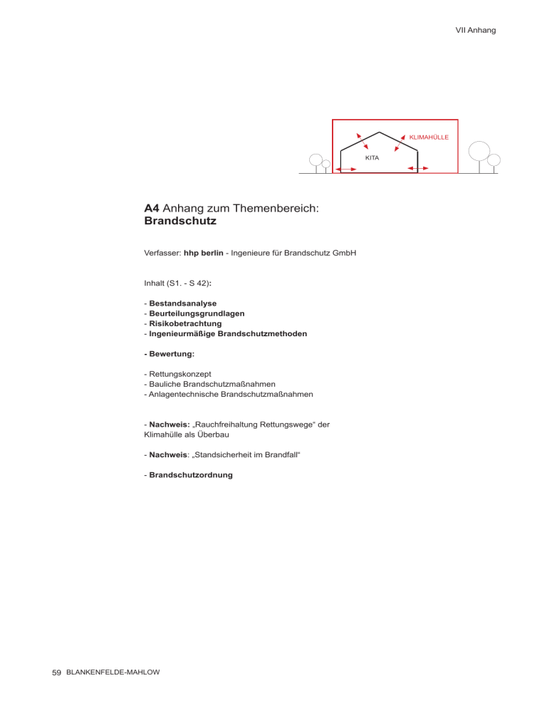 VII Anhang KLIMAHÜLLE KITA A4 Anhang zum Themenbereich: Brandschutz Verfasser: hhp berlin - Ingenieure für Brandschutz GmbH Inhalt (S1. - S 42): - Bestandsanalyse - Beurteilungsgrundlagen - Risikobetrachtung - Ingenieurmäßige Brandschutzmethoden - Bewertung: - Rettungskonzept - Bauliche Brandschutzmaßnahmen - Anlagentechnische Brandschutzmaßnahmen - Nachweis: „Rauchfreihaltung Rettungswege“ der Klimahülle als Überbau - Nachweis: „Standsicherheit im Brandfall“ - Brandschutzordnung 59 BLANKENFELDE-MAHLOW 30.04.2015 Brandschutztechnische Detailstellungnahme 14B0052-G1 zum Bauvorhaben „Kita Klimahülle TU Berlin, Blankenfelde“ Dieses Schriftstück umfasst 39 Seiten. Es darf nur ungekürzt vervielfältigt werden. Eine Veröffentlichung – auch auszugsweise – bedarf in jedem Einzelfall der schriftlichen Genehmigung. Die Ergebnisse dürfen nicht auf andere Bauwerke übertragen werden. Auftraggeber Auftragnehmer sbp sonne gmbh Schwabstraße 43 70197 Stuttgart hhpberlin Ingenieure für Brandschutz GmbH Rotherstraße 19 10245 Berlin T +49 [30] 89 59 55-0 F +49 [30] 89 59 55-9101 Entwurfsverfasser schlaich bergermann und partner Schwabstraße 43 70197 Stuttgart E [email protected] Bearbeiter Dipl.-Ing. Jana Köllner Dr.-Ing. Karen Paliga Next Generation Fire Engineering Next Generation Fire Engineering Inhaltsverzeichnis 1 Aufgabenstellung ...........................................................................................................4 1.1 1.2 1.2.1 1.2.2 1.2.3 1.2.4 Bestand ............................................................................................................................................................. 4 Klimahülle ........................................................................................................................................................ 5 Allgemeines ....................................................................................................................................................................... 5 Variante A ........................................................................................................................................................................... 5 Variante B ........................................................................................................................................................................... 6 Variante C ........................................................................................................................................................................... 7 2 Beurteilungsgrundlagen ..............................................................................................7 2.1 2.2 2.3 2.4 Rechtliche Grundlagen .................................................................................................................................. 7 Gesetze, Verordnungen ................................................................................................................................. 7 Technische Regelwerke ................................................................................................................................. 8 Literatur ............................................................................................................................................................ 8 3 Risikobetrachtung ..........................................................................................................9 4 Ingenieurmäßige Brandschutzmethoden .......................................................... 10 5 Bewertung ...................................................................................................................... 11 5.1 5.1.1 5.1.2 Rettungskonzept........................................................................................................................................... 11 Variante A und B ........................................................................................................................................................... 11 Variante C ........................................................................................................................................................................ 12 5.2 5.2.1 5.2.2 5.2.2.1 5.2.3 5.2.4 5.2.4.1 5.2.4.2 Bauliche Brandschutzmaßnahmen .......................................................................................................... 12 Tragende Bauteile und deren Aussteifungen .................................................................................................... 12 Dächer ............................................................................................................................................................................... 12 Bedachungen ................................................................................................................................................................. 13 Außenwände................................................................................................................................................................... 13 Brandabschnitte............................................................................................................................................................ 14 Brandwände als Gebäudeabschluss ...................................................................................................................... 14 Brandwände im Gebäudeinneren........................................................................................................................... 14 5.3 Anlagentechnische Brandschutzmaßnahmen ....................................................................................... 15 Seite 2 30.04.2015 Detailstellungnahme 14B0052-G1 Next Generation Fire Engineering 6 Nachweis „Rauchfreihaltung Rettungswege“ der Klimahülle als Überbau ...................................................................................
