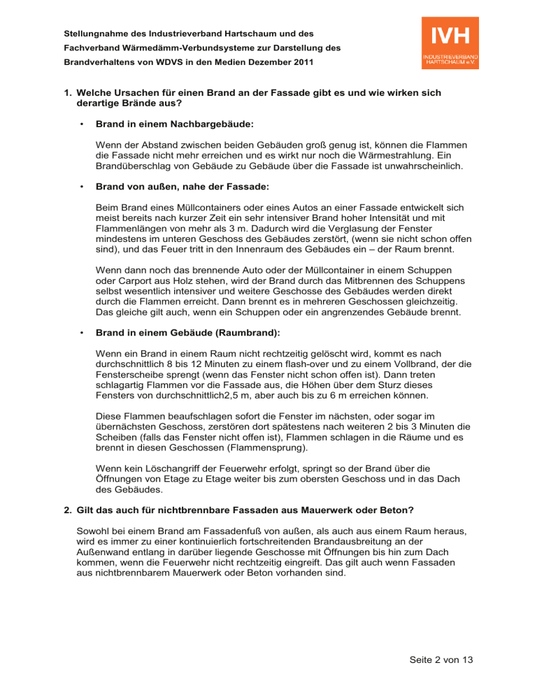 Stellungnahme des Industrieverband Hartschaum und des Fachverband Wärmedämm-Verbundsysteme zur Darstellung des Brandverhaltens von WDVS in den Medien Dezember 2011 1. Welche Ursachen für einen Brand an der Fassade gibt es und wie wirken sich derartige Brände aus? • Brand in einem Nachbargebäude: Wenn der Abstand zwischen beiden Gebäuden groß genug ist, können die Flammen die Fassade nicht mehr erreichen und es wirkt nur noch die Wärmestrahlung. Ein Brandüberschlag von Gebäude zu Gebäude über die Fassade ist unwahrscheinlich. • Brand von außen, nahe der Fassade: Beim Brand eines Müllcontainers oder eines Autos an einer Fassade entwickelt sich meist bereits nach kurzer Zeit ein sehr intensiver Brand hoher Intensität und mit Flammenlängen von mehr als 3 m. Dadurch wird die Verglasung der Fenster mindestens im unteren Geschoss des Gebäudes zerstört, (wenn sie nicht schon offen sind), und das Feuer tritt in den Innenraum des Gebäudes ein – der Raum brennt. Wenn dann noch das brennende Auto oder der Müllcontainer in einem Schuppen oder Carport aus Holz stehen, wird der Brand durch das Mitbrennen des Schuppens selbst wesentlich intensiver und weitere Geschosse des Gebäudes werden direkt durch die Flammen erreicht. Dann brennt es in mehreren Geschossen gleichzeitig. Das gleiche gilt auch, wenn ein Schuppen oder ein angrenzendes Gebäude brennt. • Brand in einem Gebäude (Raumbrand): Wenn ein Brand in einem Raum nicht rechtzeitig gelöscht wird, kommt es nach durchschnittlich 8 bis 12 Minuten zu einem flash-over und zu einem Vollbrand, der die Fensterscheibe sprengt (wenn das Fenster nicht schon offen ist). Dann treten schlagartig Flammen vor die Fassade aus, die Höhen über dem Sturz dieses Fensters von durchschnittlich2,5 m, aber auch bis zu 6 m erreichen können. Diese Flammen beaufschlagen sofort die Fenster im nächsten, oder sogar im übernächsten Geschoss, zerstören dort spätestens nach weiteren 2 bis 3 Minuten die Scheiben (falls das Fenster nicht offen ist), Flammen schlagen in die Räume und es brennt in diesen Geschossen (Flammensprung). Wenn kein Löschangriff der Feuerwehr erfolgt, springt so der Brand über die Öffnungen von Etage zu Etage weiter bis zum obersten Geschoss und in das Dach des Gebäudes. 2. Gilt das auch für nichtbrennbare Fassaden aus Mauerwerk oder Beton? Sowohl bei einem Brand am Fassadenfuß von außen, als auch aus einem Raum heraus, wird es immer zu einer kontinuierlich fortschreitenden Brandausbreitung an der Außenwand entlang in darüber liegende Geschosse mit Öffnungen bis hin zum Dach kommen, wenn die Feuerwehr nicht rechtzeitig eingreift. Das gilt auch wenn Fassaden aus nichtbrennbarem Mauerwerk oder Beton vorhanden sind. Seite 2 von 13 Stellungnahme des Industrieverband Hartschaum und des Fachverband Wärmedämm-Verbundsysteme zur Darstellung des Brandverhaltens von WDVS in den Medien Dezember 2011 3. Was leitet sich daraus für das Bauordnungsrecht ab? Das Ziel der Vorschriften für das Brandverhalten an der Außenwand ist es, an allen Fassaden, auch an brennbaren, zu verhindern, dass sich ein Brand schneller nach oben ausbreitet, als er es ohnehin an einer nichtbrennbaren Fassade mit übereinander liegenden Fenstern tut. Das Bauordnungsrecht orientiert sich bei seiner Risikoabschätzung an der Auftrittswahrscheinlichkeit „üblicher“ Brände und legt diese als Bemessungsszenario zugrunde. Anhand aktueller Schadensfälle werden diese Ansätze ständig überprüft. Denkbare Extrembrandfälle (z.B. brennender Tanklaster an einer Fassade) werden angemessen betrachtet, jedoch nicht als alleinige Grundlage angenommen. Das baurechtliche Brandschutzziel an der Gebäudeaußenwand besteht deshalb darin, eine schnelle Brandausbreitung über mehr als zwei (nicht ein!) Geschosse oberhalb der Brandausbruchstelle (Raumbrand oder am Fassadenfuß) vor dem Löschangriff der Feuerwehr (Zeitraum von 15 – 20 Minuten) zu verhindern. Ein lokales Mitbrennen eines Außenwandbekleidungssystems ist daher bei Gebäuden normaler Art und Nutzung bis zu einer Gebäudehöhe, die der Feuerwehr noch einen externen Löschangriff erlaubt, zulässig. 4. Welche Forderungen werden daraus für Außenwandbekleidungen abgeleitet? Der zulässige Beitrag von Außenwandbekleidungen zum Gesamtbrandgeschehen wird in Abhängigkeit von der Art und Höhe eines Gebäudes geregelt. Fassadenbekleidungssysteme werden brandschutztechnisch als Baustoffe behandelt, da sie weder raumbildend noch Bestandteil des Tragwerks des Gebäudes sind. Bewertet werden dabei aber nicht nur die einzelnen verwendeten Materialien, sondern auch Baustoffverbunde bzw. Systeme, wie z.B. Wärmedämm-Verbundsysteme. Es wird unterschieden zwischen leichtentflammbaren, normalentflammbaren, schwerentflammbaren und nichtbrennbaren Fassadenbekleidungssystemen: • Leichtentflammbare Fassadenbekleidungssysteme wären durch eine kleine Flamme (z.B. Streichholz) sofort entzündbar und würden unkontrollierbar schnell abbrennen • • Normalentflammbare Fassadenbekleidungssysteme dürfen durch eine kleine Flamme (z.B. Streichholz) entzündbar sein, dann aber nur langsam fortschreitend brennen (Beispiel: Holzfassaden) • Schwerentflammbare Fassadenbekleidungssysteme dürfen auch bei Einwirkung einer größeren Zündquelle nicht zu einer schnellen Brandausbreitung führen, der Brand muss lokal begrenzt bleiben (Beispiel: WDVS mit Polystyrolhartschaum) • Nichtbrennbare Fassadenbekleidungssysteme dürfen auch bei einem teilweise oder voll entwickelten Brand nicht wesentlich zum Brand beitragen, ein lokales Mitbrennen kann aber auftreten (Beispiel: WDVS mit Mineralwolle) Die nachfolgend angegebenen Gebäudehöhen werden baurechtlich jeweils nach der Höhe über der Geländeoberkante des Fußbodens des obersten Geschosses bemessen, in dem Aufenthaltsräume möglich sind. Seite 3 von 13 Stellungnahme des Industrieverband Hartschaum und des Fachverband Wärmedämm-Verbundsysteme zur Darstellung des Bran