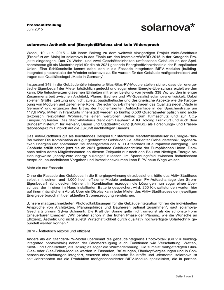 Pressemitteilung Juni 2015 solarnova: Ästhetik und (Energie)Effizienz sind kein Widerspruch Wedel, 10. Juni 2015 – Mit ihrem Beitrag zu dem weltweit einzigartigen Projekt Aktiv-Stadthaus (Frankfurt am Main) ist solarnova in das Finale um den IntersolarAWARD 2015 in der Kategorie Projekte eingezogen. Das 74 Wohn- und zwei Geschäftseinheiten umfassende Gebäude an der Speicherstrasse gilt als Musterbeispiel für die ab 2021 geltende Energieeffizienzrichtlinie der Europäischen Union. Eine Schlüsselrolle kommt dabei den in die Fassade integrierten BIPV-Modulen (buildingintegrated photovoltaic) der Wedeler solarnova zu. Sie wurden für das Gebäude maßgeschneidert und tragen das Qualitätssiegel „Made in Germany“. Insgesamt 348 in die Gebäudehülle integrierte Glas-Glas-PV-Module stellen sicher, dass der energetische Eigenbedarf der Mieter tatsächlich gedeckt und sogar einen Energie-Überschuss erzielt werden kann. Die tiefschwarzen gläsernen Einheiten mit einer Leistung von jeweils 338 Wp wurden in enger Zusammenarbeit zwischen Architekt, Planer, Bauherr und PV-Spezialist solarnova entwickelt. Dabei spielten Größe, Leistung und nicht zuletzt bauästhetische und designerische Aspekte wie die Farbgebung von Modulen und Zellen eine Rolle. Die solarnova-Einheiten tragen das Qualitätssiegel „Made in Germany“ und ergänzen den Ertrag der hocheffizienten Aufdachanlage in der Speicherstraße um 117,6 kWp. Mitten in Frankfurts Innenstadt werden so künftig 6.500 Quadratmeter optisch und architektonisch reizvollsten Wohnraums einen wertvollen Beitrag zum Klimaschutz und zur CO 2Einsparung leisten. Das Stadt-Aktivhaus dient dem Bauherrn ABG Holding Frankfurt und auch dem Bundesministerium für Verkehr, Bauen und Stadtentwicklung (BMVBS) als Forschungs- und Präsentationsobjekt im Hinblick auf die Zukunft nachhaltigen Bauens. Das Aktiv-Stadthaus gilt als leuchtendes Beispiel für städtische Mehrfamilienhäuser in Energie-PlusBauweise: Die Kombination aus gut gedämmter Gebäudehülle, effizienter Gebäudetechnik, regenerativen Energien und sparsamen Haushaltsgeräten des A+++-Standards ist europaweit einzigartig. Das Gebäude erfüllt schon jetzt die ab 2021 geltende Gebäuderichtlinie der Europäischen Union. Demnach sollen deren Mitgliedsstaaten ab diesem Zeitpunkt nur noch den Bau von Niedrigst-Energie beziehungsweise „nearly-zero energy buildings“ zulassen. Im Spannungsfeld zwischen ästhetischem Anspruch, baurechtlichen Vorgaben und Investitionsvolumen kann BIPV neue Wege weisen. Mehr als nur Fassade Ohne die Fassade des Gebäudes in die Energiegewinnung einzubeziehen, hätte das Aktiv-Stadthaus selbst mit seiner rund 1.000 hoch effiziente Module umfassenden PV-Aufdachanlage den StromEigenbedarf nicht decken können. In Kombination erzeugen die Lösungen nun sogar einen Überschuss, der in einer im Haus installierten Batterie gespeichert wird. 250 Kilowattstunden warten hier auf ihren (nächtlichen) Abruf. Über ein Display kann jeder Mieter des Aktiv-Stadthauses den jeweiligen Energieverbrauch mit der aktuellen Stromerzeugung vergleichen. „Unsere maßgeschneiderten Photovoltaiklösungen für die Gebäudeintegration führen die individuellen Ansprüche von Architekten, Planungsbüros und Bauherren optimal zusammen“, sagt solarnovaGeschäftsführerin Sylvia Schmenk. Die Kraft der Sonne gelte nicht umsonst als die schönste Form Erneuerbarer Energien: „Wir beraten schon in der frühen Phase der Planung, wie die Wünsche an Effizienz, Ästhetik und nicht zuletzt Wirtschaftlichkeit durch qualitativ hochwertigste Solartechnik gebündelt werden können.“ BIPV - Ästhetisch reizvoll und effizient Anders als ein Standard-PV-Modul übernimmt die gebäudeintegrierte Photovoltaik (BIPV = buildingintegrated photovoltaic) neben der Stromerzeugung auch Funktionen wie Verschattung, Wetter-, Sicht- und Schallschutz, als Isolierglas sogar die Wärmedämmung. Die zumeist maßgefertigten GlasGlas- oder Glas-Folien-Module werden in Fassaden, Brüstungen, Überkopfverglasungen und in Sonnenschutzvorrichtungen integriert, ersetzen also klassische Baustoffe und -elemente. solarnova ist seit Jahrzehnten auf die Produktion maßgeschneiderter BIPV-Module spezialisiert, die in partner- Seite 1 von 2 Pressemitteilung Juni 2015 schaftlicher Zusammenarbeit mit den Projektbeteiligten geplant und gesized werden – im Hinblick auf Form, Farbgebung, Transparenz und natürlich Leistung. Photovoltaik in Innenstädten Die Idee zum Aktiv-Stadthaus lieferte der Architekt Professor Manfred Hegger. Er gilt als Vordenker im Bereich energieeffiziente Architektur und hatte bis 2014 den Lehrstuhl für energieeffizientes Bauen an der Technischen Universität Darmstadt inne. Außerdem war er viele Jahre Präsidiumsmitglied der Deutschen Gesellschaft für Nachhaltiges Bauen. Verantwortlicher Bauherr ist die ABG Frankfurt Holding – städtische Wohnungsbaugesellschaft, die mit ihren 50.000 Wohneinheiten fast einem Viertel der Frankfurter Bevölkerung ein Zuhause bietet. Über solarnova Seit 1996 produziert solarnova in Wedel bei Hamburg hochwertige Photovoltaik-Module (PV). Die einstigen Firmengründer kamen aus dem Bereich Forschung und Entwicklung der AEG, die in Wedel schon zu Beginn der 1980er Jahre eine der ersten PV-Produktionslinien aufgebaut hatte. Die hier hergestellten Lösungen wurden für Spezialanwendungen in der Raumfahrt beziehungsweise der Satellitentechnik genutzt. Vor allem als Hersteller individueller Module für bauwerkintegrierte Photovoltaik (BIPV) hat sich solarnova weltweit einen erstklassigen Ruf erarbeitet. BIPV ergänzt klassische Baumaterialien nicht nur, sondern ersetzt sie. Neben der Stromerzeugung übernimmt gebäudeintegrierte PV auch Funktionen wie Verschattung, Wetter-, Sicht- und Schallschutz, als Isolierglas sogar die Wärmedämmung. solarnova ist außerdem zuverlässiger OEM-Partner, hat eine eigene, hochleistungsfähige Standardmodulserie (SOL GT) im Programm und ist in ihr