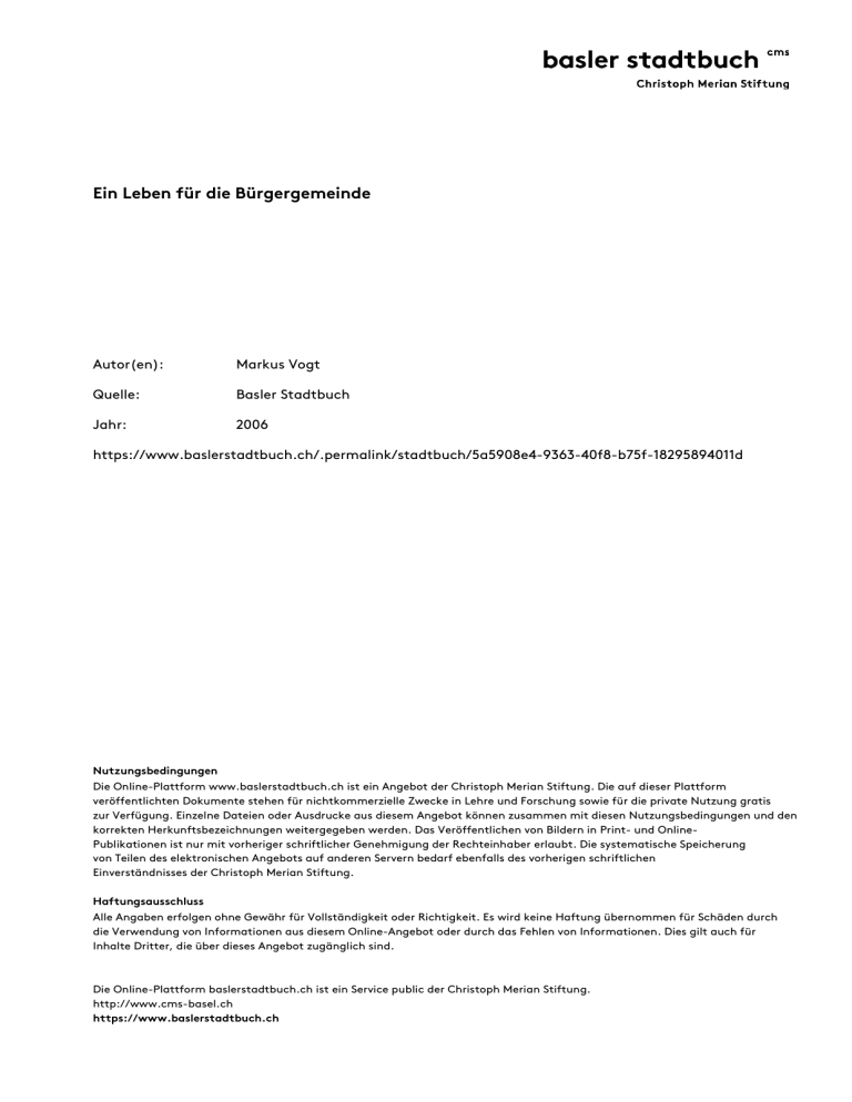 Ein Leben für die Bürgergemeinde Autor(en): Markus Vogt Quelle: Basler Stadtbuch Jahr: 2006 https://www.baslerstadtbuch.ch/.permalink/stadtbuch/5a5908e4-9363-40f8-b75f-18295894011d Nutzungsbedingungen Die Online-Plattform www.baslerstadtbuch.ch ist ein Angebot der Christoph Merian Stiftung. Die auf dieser Plattform veröffentlichten Dokumente stehen für nichtkommerzielle Zwecke in Lehre und Forschung sowie für die private Nutzung gratis zur Verfügung. Einzelne Dateien oder Ausdrucke aus diesem Angebot können zusammen mit diesen Nutzungsbedingungen und den korrekten Herkunftsbezeichnungen weitergegeben werden. Das Veröffentlichen von Bildern in Print- und OnlinePublikationen ist nur mit vorheriger schriftlicher Genehmigung der Rechteinhaber erlaubt. Die systematische Speicherung von Teilen des elektronischen Angebots auf anderen Servern bedarf ebenfalls des vorherigen schriftlichen Einverständnisses der Christoph Merian Stiftung. Haftungsausschluss Alle Angaben erfolgen ohne Gewähr für Vollständigkeit oder Richtigkeit. Es wird keine Haftung übernommen für Schäden durch die Verwendung von Informationen aus diesem Online-Angebot oder durch das Fehlen von Informationen. Dies gilt auch für Inhalte Dritter, die über dieses Angebot zugänglich sind. Die Online-Plattform baslerstadtbuch.ch ist ein Service public der Christoph Merian Stiftung. http://www.cms-basel.ch https://www.baslerstadtbuch.ch Ein Leben für die Bürgergemeinde Ein Gespräch mit dem im Jahr 2006 zurückgetretenen Bürgerratsschreiber Rudolf Grüninger Markus Vogt Gut fünfundzwanzig Jahre wirkte Rudolf Grüninger als Bürgerratsschreiber, das heisst als Verwaltungschef der Bürgergemeinde der Stadt Basel. Ende August 2006 übergab er das Amt seinem Nachfolger Daniel Müller und zog sich aus dem aktiven Berufsleben zurück. Im Interview blickt er auf ereignisreiche Jahre zurück. Wie haben Sie die Bürgergemeinde 1981 angetroffen, und wie sehen Sie sie heute? Die Bürgergemeinde war schon immer eine wohltätige Institution. Sie wirkte aber damals im Schatten, man hat sie kaum wahrgenommen. Sie verhielt sich eher wie eine Stiftung, und der Bürgergemeinderat (damals Weiterer Bürgerrat) war eine meist ruhige Einrich­ tung, die fleissig und wirkungsvoll, aber unspektakulär arbeitete. Heute ist das anders: Die Bürgergemeinde ist längst ein politisch interessantes Aktionsfeld geworden. Die Bas­ ler Bürgergemeinde arbeitet überdies seit Kurzem mit einem modernen Organisations­ system, mit Leistungsaufträgen, Globalbudgets und ähnlichen Führungsinstrumenten. Früher wurde, simpel ausgedrückt, einfach geschaut, wie viel Geld vorhanden war und wie dieses am besten einzusetzen wäre. Die Bürgergemeinde ist also eine moderne Institution geworden. Was hat sich geändert? Damals, als ich mein Amt antrat, wackelte die Bürgergemeinde stets brav dem Kanton hinterher. Man befolgte das Lohngesetz und das Personalgesetz des Kantons, war an­ geschlossen an die kantonale Pensionskasse. All das wurde inzwischen geändert. Eine eigene Lohnordnung und eine eigene Anstellungsordnung wurden entwickelt. Als Arbeitgeberin bietet die Bürgergemeinde attraktive Anstellungsbedingungen. Zudem musste eine eigene Pensionskassenlösung gefunden werden. Schon in den 80er Jahren wurden eine neue Gemeindeordnung und neue Geschäftsordnungen in Kraft gesetzt, weiter eine Ordnung über die politischen Rechte, sodass man für die damals erstmaligen Referendums-Abstimmungen gerüstet war. Stadt und Gesellschaft 97 Die Bürgergemeinde hat in den fünfundzwanzig Jahren viel gebaut und umgebaut, zum Beispiel die Rehaklinik. Im Bereich des Bürgerspitals handelt es sich um die Gesamtsanierung der Reha Chrischona. Auf dem Milchsuppe-Areal ist viel passiert. Hier befindet sich der neue Werkstätten­ bau, einiges mehr ist im Entstehen: Die Werkstätten werden ausgebaut, neue Betriebe und die Direktion werden angesiedelt. Am selben Ort wurde das alte Paraplegikerzentrum, nachdem es verselbstständigt worden war, als Reha Basel ganz neu erstellt. Etliche Alters- und Pflegeheime wurden renoviert oder neu gebaut, das Alterszentrum Weiherweg wurde instand gestellt, im Gundeli wurde das ganz neue Heim <Falkenstein> gebaut. Neu eingerichtet wurde seinerzeit das <Lamm> im Kleinbasel. Das Altersheim am Bruderholz, ursprünglich den Sozialbehörden zugeordnet, wurde in den Geschäfts­ bereich des Bürgerspitals überführt, nachdem es eine grundlegende bauliche Auf­ frischung erfahren hatte. Im Waisenhaus mit seinen historischen Gebäulichkeiten, etwa der Kirche oder dem Laienrefektorium, ist baulich viel geschehen. Das Stadthaus ist wäh­ rend meiner Amtszeit total überholt sowie mit einer unterirdischen Archivanlage ergänzt worden. Eine grosse Sache war die Verlegung der Sozialhilfe der Stadt Basel vom Peters­ platz, wo es zu eng wurde, ins Kleinbasel. Die Bürgergemeinde erledigt vieles im Auftrag Dritter, etwa des Kantons BaselStadt, gerade im Sozialbereich. Der Bürgergemeinde obliegen eigene Aufgaben, die sie in Selbstverantwortung erledigt, so das Einbürgerungswesen oder die Waldbewirtschaftung. Allerdings hat sie keine Steuereinnahmen. Sie muss also, bevor sie Geld ausgibt, dieses zuerst einmal einnehmen. Viele Tätigkeiten erledigt sie daher im entgeltlichen Auftrag von Dritten, vor allem im Auftrag der Einwohnergemeinde oder des Kantons. Die Sozialhilfe etwa vollzieht einen Leistungsauftrag der Einwohnergemeinde. Als grösster öffentlich-rechtlicher Anbieter von Betten in Alters- und Pflegeheimen könnte das Bürgerspital seinen Auftrag nicht er­ füllen, wenn es keine Pflegeplatzbeiträge vom Kanton erhielte; solche Zuschüsse bezie­ hen übrigens private Heime ebenfalls. Im Bereich der Behinderten ist man im Auftrag der Eidgenössischen Invalidenversicherung tätig. Auch das Waisenhaus hat im Heimbereich seit Kurzem einen Leistungsauftrag vom Kanton Basel-Stadt. Welches sind die Aufgaben der Bürgergemeinde im Sozialbereich? Der B