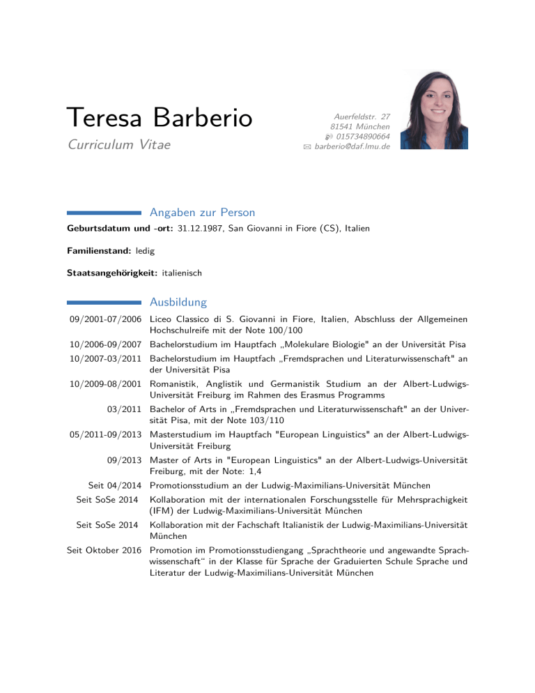 Teresa Barberio Curriculum Vitae Auerfeldstr. 27 81541 München H 015734890664 B [email protected] Angaben zur Person Geburtsdatum und -ort: 31.12.1987, San Giovanni in Fiore (CS), Italien Familienstand: ledig Staatsangehörigkeit: italienisch Ausbildung 09/2001-07/2006 Liceo Classico di S. Giovanni in Fiore, Italien, Abschluss der Allgemeinen Hochschulreife mit der Note 100/100 10/2006-09/2007 Bachelorstudium im Hauptfach „Molekulare Biologie" an der Universität Pisa 10/2007-03/2011 Bachelorstudium im Hauptfach „Fremdsprachen und Literaturwissenschaft" an der Universität Pisa 10/2009-08/2001 Romanistik, Anglistik und Germanistik Studium an der Albert-LudwigsUniversität Freiburg im Rahmen des Erasmus Programms 03/2011 Bachelor of Arts in „Fremdsprachen und Literaturwissenschaft" an der Universität Pisa, mit der Note 103/110 05/2011-09/2013 Masterstudium im Hauptfach "European Linguistics" an der Albert-LudwigsUniversität Freiburg 09/2013 Master of Arts in "European Linguistics" an der Albert-Ludwigs-Universität Freiburg, mit der Note: 1,4 Seit 04/2014 Promotionsstudium an der Ludwig-Maximilians-Universität München Seit SoSe 2014 Kollaboration mit der internationalen Forschungsstelle für Mehrsprachigkeit (IFM) der Ludwig-Maximilians-Universität München Seit SoSe 2014 Kollaboration mit der Fachschaft Italianistik der Ludwig-Maximilians-Universität München Seit Oktober 2016 Promotion im Promotionsstudiengang „Sprachtheorie und angewandte Sprachwissenschaft“ in der Klasse für Sprache der Graduierten Schule Sprache und Literatur der Ludwig-Maximilians-Universität München Bachelorarbeit Titel Danae. Metafora di una società in declino Betreuer Prof. Dr. Giovanna Cermelli und Prof. Dr. Marianne Hepp Masterarbeit Titel Briefe aus der Ferne - kalabrische Immigration am Rio de la Plata. Eine soziolinguistische Analyse Betreuer Prof. Dr. Rolf Kailuweit und Prof. Dr. Stefan Pfänder Dissertation Titel Sprachkontaktphänomene bilingualer Schüler am Beispiel argumentativer und narrativer Texte in der L1 Italienisch und der L2 Deutsch Betreuer Prof. Dr. Claudia Maria Riehl Arbeitsverhältnisse 10/2009-07/2010 Praktikum an der Bibliothek des Romanischen Seminars der Albert-LudwigsUniversität, Freiburg 04/2010-08/2010 Sprach-Tutorin am Romanischen Seminar der Albert-Ludwigs-Universität, Freiburg 10/2011-12/2011 Studentische Hilfskraft an der Bibliothek des Romanischen Seminares der Albert-Ludwigs-Universität, Freiburg 01/2011-04/2012 Nachhilfelehrerin für Italienisch, Deutsch, Englisch und Mathematik. Eulenschule, Denzlingen 10/2012-11/2012 Praktikum im Rahmen des SNF Forschungsprojektes "Italian Constituent Order in a Contrastive Perspective (ICOCP)" geleitet von Prof. Dr. Anna-Maria De Cesare, Institut für Italianistik, Universität Basel 05/2012-03/2013 Wissenschaftliche Hilfskraft am Romanischen Seminar der Albert-LudwigsUniversität Freiburg, Lehrstuhl: Prof. Dr. Stefan Pfänder 07/2012-09/2013 Wissenschaftliche Hilfskraft am Romanischen Seminar der Albert-LudwigsUniversität Freiburg, Lehrstuhl: Prof. Dr. Rolf Kailuweit 10/2013-10/2016 Wissenschaftliche Mitarbeiterin im BMBF Projekt „Mehrschriftlichkeit: Zur Wechselwirkung von Sprachkompetenzen in Erst-und Zweitsprache und außersprachlichen Faktoren" am Institut für Deutsch als Fremdsprache, LudwigMaximiliams-Universität München, Lehrstuhl: Prof. Dr. Claudia Maria Riehl 10/2015-04/2016 Lehrkraft Deutsch an der Sprachschule Hilfe von Mensch zu Mensch e.V., München Seit Oktober 2016 Wissenschaftliche Mitarbeiterin im Promotionsstudiengang „Sprachtheorie und angewandte Sprachwissenschaft“ in der Klasse für Sprache der Graduierten Schule Sprache und Literatur der Ludwig-Maximilians-Universität München Wissenschafliche Vorträge 19.12.2013 Mehrsprachigkeit: Zur Wechselwirkung von Sprachkompetenzen in Erst- und Zweitsprache und außersprachlichen Faktoren. Kick-off- Worshop, LudwigMaximilians-Universität München (mit Seda Yilmaz Woerfel, LMU) 15.02.2014 Mehrschriftlichkeit: Zur Wechselwirkung von Sprachkompetenzen in Erst- und Zweitsprache und außersprachlichen Faktoren. EmMeth 2014, Otto-FriedrichUniversität Bamberg 03.09.2014 Multiliteracy: The interrelation between textual competences in L1 and L2 and extra-linguistic factors. EuroSLA 24, University of York, England 08.11.2014 Schreibkompetenz und Schreibförderung unter den Bedingungen von Mehrsprachigkeit. Kick-off-Meeting des Forschungsschwerpunktes „Sprachliche Bildung und Mehrsprachigkeit" des Bundesministeriums für Bildung und Forschung, Hamburg (mit Christa Dürscheid, UZH Zürich) 13.11.2014 Multiliteracy in bilingual children with a Turkish and Greek background. Primary results of a BMBF project. Internationales Symposium zur Mehrschriftlichkeit, Ludwig-Maximilians-Universität München (mit Seda Yilmaz Woerfel, LMU) 20.11.2015 Muliliteracy: Interrelation between textual competence in L1 and L2 and extra-linguistic factors in bilingual Italian-German pupils. Colloquie international/International Workshop. Langue nationale, dialectes/langues régionales, langues des migrants, Freiburg/Mulhouse 18.02.2016 Metasprachliches Bewusstsein und außersprachliche Faktoren: der Einfluss auf die Textkompetenzen bilingualer Schüler. MehrSpracheN, Ludwig-MaximiliansUniversität München (mit Eleni Tasiopoulou, LMU) 16.06.2016 Language awareness and extra-linguistic factors: Effects on bilingual textual competence. Sociolinguistics Symposium 21, Universität Murcia, Spanien (mit Claudia Maria Riehl, LMU) Workshops und Öffentlichkeitsarbeiten 28.03.2014 Mehrschriftlichkeit: Zur Wechselwirkung von Sprachkompetenzen in Erst- und Zweitsprache und außersprachlichen Faktoren. Bildungsforschungstagung Berlin 17.04.2014 Elternseminar: Mehrsprachige Erziehung. Internationale Forschungsstelle für Mehrsprachigkeit (IFM) der Ludwig-Maximilians-Universität, München 15.11.2014 Seminario per genitori sul plurilinguismo. Scuola Leonardo Da Vinci, München 20.09.201