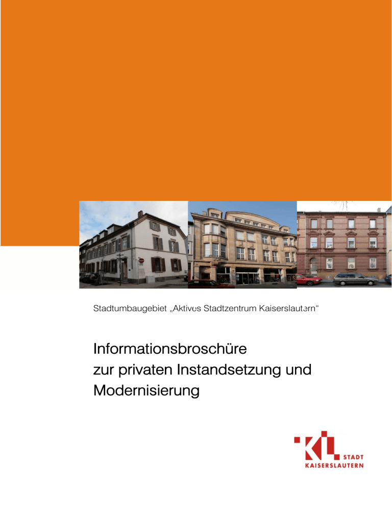 Stadtumbaugebiet „Aktives Stadtzentrum Kaiserslautern“ Informationsbroschüre zur privaten Instandsetzung und Modernisierung Impressum Auftraggeber | Herausgeber S T A DT K AI S E R SLA U TE RN Referat Stadtentwicklung, Abteilung Stadtplanung Willy-Brandt-Platz 1 67657 Kaiserslautern Internet: www.kaiserslautern.de Hinweis: Die Broschüre stellt eine Fortschreibung / Übertragung einer Broschüre für das Soziale-Stadt-Gebiet „Innenstadt West“ auf das Stadtumbaugebiet „Aktives Stadtzentrum Kaiserslautern“ durch die Stadtverwaltung dar. Die Bearbeitung und Gestaltung der v.g. Broschüre wurde betreut von: LANDSCHAFTSPLANUNG Bruchstraße 5 67655 Kaiserslautern Dipl.-Ing. Reinhard Bachtler Dipl.-Ing. Frank Böhme SRL Dipl.-Ing. Heiner Jakobs SRL Roland Kettering Stadtplaner Telefon: Fax: E-Mail: Internet: STADTPLANUNG Reinhard Bachtler, Walter Ruppert Kaiserslautern, März 2012 2 0631 / 36158-0 0631 / 36158-24 [email protected] www.bbp-kl.de Liebe Bürgerinnen und Bürger Mit dieser Informationsbroschüre übergebe ich Ihnen eine Zusammenfassung der wichtigsten Fakten zum Thema „Private Instandsetzung und Modernisierung“ im Stadtumbaugebiet „Aktives Stadtzentrum Kaiserslautern“. Das Ziel des Stadtumbauprozesses im Stadtumbaugebiet „Aktives Stadtzentrum Kaiserslautern“. ist nicht nur die Schaffung von Neuem, sondern auch die Erhaltung der traditionsreichen Bausubstanz in den Wohnquartieren im Süden der Stadt Kaiserslautern. Im Rahmen der Stadterneuerung soll unter Nutzung des Bund-Länder-Förderprogramms „Aktive Ortsund Stadtteilzentren“ dazu ein wesentlicher Beitrag geleistet werden. Durch die „Vorbereitenden Untersuchungen“ und das „Städtebauliche Entwicklungskonzept“ zum Stadtumbaugebiet „Aktives Stadtzentrum Kaiserslautern“ hat die Stadt die notwendigen Rahmenbedingungen zur Unterstützung privater Vorhaben geschaffen. Ich bitte Sie nun, diesen Rahmen mit Ihren Aktivitäten auszufüllen. Die erfolgreiche Erneuerung und Weiterentwicklung unserer Innenstadt ist ein wichtiger Schritt auf dem Wege zur Verbesserung der Wohn- und Lebensqualität der Bewohner und zur Attraktivierung von Kaiserslautern als Arbeitsplatzstandort. Die vorliegende Broschüre soll Sie, liebe Bürgerinnen und Bürger, über die Möglichkeiten der Förderung von privaten Modernisierungs- und Instandsetzungsmaßnahmen - sowohl im baulichen, als auch im energetischen Bereich - informieren. Über diese Grundinformationen hinaus bietet die Stadt Kaiserslautern die Möglichkeit einer individuellen fachlichen Beratung zu Baugestaltungs- wie auch Förderungsfragen an. Ihr Oberbürgermeister Dr. Klaus Weichel 3 4 Inhaltsverzeichnis Stadtumbaugebiet „Aktives Stadtzentrum Kaiserslautern“ Modernisierungs- und Instandsetzungsmaßnahmen Zwei Beispiele zur Gebäudemodernisierung – Drei Fördervariationen Wofür gibt es Geld von Kommune, Land und Bund? Tipps zur Finanzierung | Beispiel für den Ablauf einer Förderantragstellung Noch Fragen? Adressen und Ansprechpartner 5 6 Informationen zu den Zielen des Soziale-Stadt-Projektes „Stadtteilerneuerung Innenstadt West“ Stadtumbau „Aktives Stadtzentrum Kaiserslautern“ Der Stadtrat hat in seiner Sitzung vom 25.08.2008 eine vorläufige Gebietsabgrenzung für das „Aktive Stadtzentrum Kaiserslautern“ beschlossen, um hierauf basierend ein Städtebauliches Entwicklungskonzept erstellen zu lassen. Die endgültige Gebietsabgrenzung wurde auf Basis der durchgeführten Bestandsaufnahmen und der daraus abgeleiteten Analyseergebnisse vorgenommen. Dem Antrag der Stadt Kaiserslautern auf Aufnahme in das Förderprogramm „Aktive Stadtzentren“ vom 29.08.2008 hat das Ministerium des Innern und für Sport Rheinland-Pfalz mit Schreiben vom 10.10.2008 entsprochen und mitgeteilt, dass die Stadt Kaiserslautern als eine von vier Startergemeinden in Rheinland-Pfalz in das Programm aufgenommen wurde. In der Sitzung vom 03.05.2010 hat der Stadtrat das Städtebauliche Entwicklungskonzept erstmals zur Kenntnis genommen. Hierauf basierend wurde in der Zeit vom 27.09.2010 bis zum 15.10.2010 die Beteiligung der Betroffenen bzw. der Öffentlichkeit durchgeführt. Die Ergebnisse des Beteiligungsverfahrens wurden in der Sitzung des Stadtrats vom 16.05.2011 in das Entwicklungskonzept aufgenommen. Nach förderrechtlicher Anerkennung durch die Aufsichts- und Dienstleistungsdirektion Süd vom 02.11.2010 wurde das Städtebauliche Entwicklungskonzept durch den Stadtrat in seiner Sitzung vom 27.02.2012 abschließend bestätigt. Folgende Ziele für die Stadterneuerung wurden hierin formuliert: Attraktivierung der Innenstadt durch städtebaulich gestalterische Maßnahmen als Basis für eine lebenswerte Stadt und attraktive Einkaufsstadt sowie verkehrliche Neugestaltung der Innenstadt zur Reduzierung des die Innenstadt trennenden Ost-West Verkehrs im Bereich der Königstraße/Fruchthallstraße bzw. Burgstraße/Pariser Straße und Neuorganisation der Haltestellen des Öffentlichen Personennahverkehrs. Um das grundsätzliche Ziel einer hohen und nachhaltigen Qualität der Innenstadt Kaiserslauterns im Sinne des Programms „Aktives Stadtzentrum“ umzusetzen, bedarf es eines ganzheitlichen Ansatzes bzw. einer Strategie, die als inhaltlicher und zeitlicher „roter Faden“ für die Umsetzung der Ziele durch entsprechende Maßnahmen dient und zur Schaffung einer starken urbanen Mitte der Stadt beiträgt. Hierzu wurde eine Rangfolge der Maßnahmen gebildet. Ziele für die Stadterneuerung… Ganzheitliche Strategie 7 Informationen zu den Zielen des Stadtumbaugebiets „Aktives Stadtzentrum Kaiserslautern“ Neben den definierten Prioritätengebieten wurde die Konzentration auf ein zentrales Leitprojekt als Hauptbaustein des Gesamtkonzepts gerichtet, das den höchsten Stellenwert für die weitere Entwicklung der Innenstadt von Kaiserslautern und damit natürlich auch besonders zielführende Auswirkungen auf die Gesamtstadt hat. Das Leitprojekt „Neue Mitte Kaiserslautern