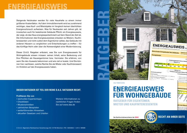 Steigende Heizkosten werden für viele Haushalte zu einem immer größeren Kostenfaktor. Auf dem Immobilienmarkt wird es zunehmend wichtiger, dass Kauf- und Mietobjekte im Vergleich keinen überhöhten Energieverbrauch aufweisen. Was für Neubauten seit Jahren gilt, ist inzwischen auch für bestehende Gebäude Pflicht: ein Energieausweis, der zeigt, ob das Haus energiespartechnisch auf dem Stand der Zeit ist. Die Informationen des Energieausweises erlauben es Mietern, Kaufinteressenten und nicht zuletzt dem Eigentümer selbst, das Gebäude mit anderen Häusern zu vergleichen und Entscheidungen zu treffen – für das künftige Heim oder über die Notwendigkeit einer Modernisierung. Dieser D.A.S. Ratgeber erläutert, was Sie zum Energieausweis für Wohngebäude wissen müssen: seinen Inhalt, seine Bedeutung und Ihre Pflichten als Hauseigentümer bzw. Vermieter. Sie erfahren, von wem Sie den Ausweis bekommen und wie viel er kostet. Und Sie können hier nachlesen, welche Rechte Sie als Mieter oder Kaufinteressent im Hinblick auf den Energieausweis haben. RATGEBER ENERGIEAUSWEIS ENERGIEAUSW gemäß den §§ 16 EIS ff. der Energieeinsp arverordnung (EnE V) vom Berechneter Energ iebedarf des Ge bäudes Anforderungen A+ A 25 50 B 75 C100 CO2 dieses Gebäud kWh/(m²·a) D F 150 175 20 Für Energiebedarfs berech (m²·a) Anforderun gswert kWh/(m²·a) Energetische Quali tät der Gebäudeh ülle HT‘ Ist-Wert W/(m²·K) Anforderungswert W/(m²·K) Sommerlicher Wärm eschutz (bei Neub au) eingehalten Endenergiebedarf [Pflichtangabe in E 125 kWh/(m²·a) Primärenergiebed arf dieses Geb gemäß EnEV 4 Primärenergiebedarf Ist-Wert kWh/ dieses Gebäudes Verfahren nach DIN V 41 Verfahren nach DIN V 18 Regelung nach § 3 Absat Vereinfachungen nach § Immobilienanzeig en] Energieausweis für Wohngebäude Angaben zum EE Wärm eG 5 Profitieren Sie von • wertvollen Expertentipps • Checklisten • Musterschreiben • zahlreichen Beispielen • weiterführenden Hinweisen • aktuellen Gesetzen und Urteilen Registriernum Endenergiebedarf 0 für (oder: „Registrier n Energiebedarf ULF MATZEN DIESER RATGEBER IST TEIL DER REIHE D.A.S. RATGEBER RECHT. 1 Nutzung erneuerbar er Energien zur Deckung des Wärme- und Kälte bedarfs auf Grun d des ErneuerbareEnergien-Wärm egesetzes (EEW ärmeG) Art: Deckungsanteil: % Vergleichswerte A+ 0 25 A 50 B 75 Endene C 100 D 125 % Weitere Informationen zu rechtlichen Fragen finden Sie auf www.das.de © D.A.S. Allgemeine Rechtsschutz-Versicherungs-AG | 81728 München | RS | 50050842 | 1.2014 | MKMM Ersatzmaßnahm en 6 % Die Anforderungen des EEWärmeG werden durch die Ersatzmaßnahme nach § 7 Absatz 1 Nummer 2 EEWärmeG erfül lt. Die nach § 7 Absatz 1 Nummer 2 EEWärmeG verschärften Anfor derungswerte der EnEV sind eingehalten. Die in Verbindun g mit § 8 EEWärme G um verschärften Anfor % derungswerte der EnEV sind eingehalten. Die Energieeinsparve rordnung lässt für Verschärfter Anfor unterschiedliche die Be derun Verfahren zu, die im Einzelfa Primärenergiebedarf: gswert nissen führen könn en. Insbesondere wegen stan erlauben die ange kWh/(m²·a) Verschärfter Anfor gebenen Werte derungswert keine Energ Rück iever s brauc für die energetisch h. Die ausgewies e Qualität der enen Bedarfsw Werte nach der Gebäudehülle H EnEV pro Quad T´: ratmeter Geb Allgemeinen größe r ist als die Wohn W/(m²·K) fläche des Ge 1 siehe Fußnote 1 auf Seite 1 des Energ 4 ieausweises nur bei Neubau sowie 2 siehe Fußnote 2 bei Modernisierung 6 auf Seite 1 des Energ im Fall des § 16 Absa nur bei Neubau im ieausweises Fall der Anwendun tz 1 Satz 3 EnEV 5 g von § 7 Absatz nur bei Neubau 1 Nummer 2 EEW ärmeG 7 EFH: Einfamilien ha RATGEBER FÜR EIGENTÜMER, MIETER UND KAUFINTERESSENTEN Erläuterungen zum Berec ENERGIEAUSWEIS Ulf Matzen ENERGIEAUSWEIS FÜR WOHNGEBÄUDE RATGEBER FÜR EIGENTÜMER, MIETER UND KAUFINTERESSENTEN 2014 ENERGIEAUSWEIS Liebe Leserin, lieber Leser, was für Kühl- und Gefriergeräte, Waschmaschinen, Wäschetrockner und Spülmaschinen sowie Neubauten schon lange gilt, ist auch für bestehende Häuser Realität geworden: Ein Zertifikat gibt über den Energieverbrauch bzw. -bedarf Auskunft. Anhand einer farbigen Skala kann jeder abschätzen, ob ein Haus geringe oder hohe Energiekosten verursacht. Herausgeber: D.A.S. Deutscher Automobil Schutz Allgemeine Rechtsschutz-Versicherungs-AG Thomas-Dehler-Str. 2 81737 München www.das.de Layout: Stefan Schweizer, www.stefanschweizer.de Druck: Werbedruck A. Lönneker / Stadtoldendorf Lektorat: Caroline Kazianka, www.kazianka.de Fotos: Fotolia.de Redaktionsschluss: Januar 2014 Copyright © 2008 by D.A.S. 4. aktualisierte Auflage 2014 Copyright Alle Inhalte dieses Ratgebers sind urheberrechtlich geschützt. Die Vervielfältigung und der Nachdruck sind ohne Genehmigung der D.A.S. untersagt. Alle Rechte bleiben vorbehalten. Hinweis: Der D.A.S. Ratgeber informiert über die juristischen Grundlagen und soll nicht der Beratung im Falle eines individuellen rechtlichen Anliegens dienen. Die Informationen in diesem Ratgeber sind sorgfältig recherchiert. Eine Haftung für die Richtigkeit, Aktualität und Vollständigkeit der Beiträge kann jedoch nicht übernommen werden. Nachdem Strom, Gas und Öl ständig teurer werden, schauen sich immer mehr Kauf- und Mietinteressenten die Werte im Energieausweis bei der Haus- und Wohnungsbesichtigung genau an. Schlecht gedämmte alte Häuser können heute nur noch zu ungünstigeren Bedingungen vermietet oder verkauft werden. In deutschen Städten hat sich dies bereits bemerkbar gemacht: In den letzten Jahren wurde eine erhebliche Zahl von Mietshäusern mit Wärmedämmung und neuen Heizanlagen ausgestattet. Mit diesem D.A.S. Ratgeber Recht informieren wir darüber, wer einen Energieausweis braucht, wer ihn ausstellt und was genau aus ihm hervorgeht. Er erläutert auch die Änderungen durch die Neufassung der Energieeinsparverordnung 2014. Unabhängig davon, ob Sie Eigentümer, Vermieter, 