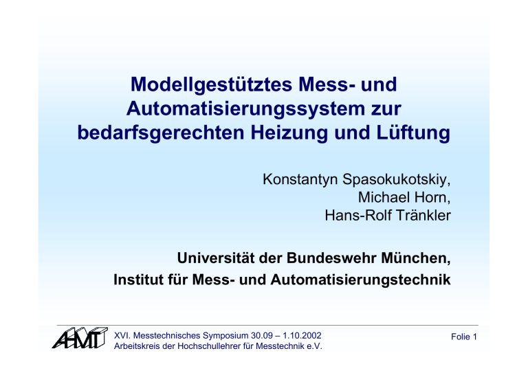 Konstantyn Spasokukotskiy, Michael Horn, Hans-Rolf Tränkler Modellgestütztes Mess- und Automatisierungssystem zur bedarfsgerechten Heizung und Lüftung Modellgestütztes Mess- und Automatisierungssystem zur bedarfsgerechten Heizung und Lüftung Konstantyn Spasokukotskiy, Michael Horn, Hans-Rolf Tränkler Universität der Bundeswehr München, Institut für Mess- und Automatisierungstechnik XVI. Messtechnisches Symposium 30.09 – 1.10.2002 Arbeitskreis der Hochschullehrer für Messtechnik e.V. Folie 1 Konstantyn Spasokukotskiy, Michael Horn, Hans-Rolf Tränkler Modellgestütztes Mess- und Automatisierungssystem zur bedarfsgerechten Heizung und Lüftung Inhalt Ziel •Energieeinsparung bei gleichzeitiger Sicherung der Behaglichkeit Ansätze •Energieeinsparung durch bedarfsgerechte Heizung und Lüftung Problem •Aufgabenstellung Methoden •Stand der Erfassung thermischer Gebäudezustände Behaglichkeit •Bauphysikalisches Raummodell zur Messung der Behaglichkeit Energieeinsparung •Modellgestützte Messung der Energieeinsparung durch veränderte . Betriebsbedingungen Technische Basis •Aufbau der Testplattform •Zusammenfassung und Ausblick XVI. Messtechnisches Symposium 30.09 – 1.10.2002 Arbeitskreis der Hochschullehrer für Messtechnik e.V. Folie 2 Konstantyn Spasokukotskiy, Michael Horn, Hans-Rolf Tränkler Modellgestütztes Mess- und Automatisierungssystem zur bedarfsgerechten Heizung und Lüftung Energieeinsparung Ziel Treibhauseffekt Ansätze Antropogene CO2-Emission durch Erzeugung von Energie Problem Ca. 14% Primärenergie wird in Methoden Deutschland für Heizung verbraucht Behaglichkeit Heizenergieeinsparung Energieeinsparung Technische Basis Sicherstellung der Behaglichkeit XVI. Messtechnisches Symposium 30.09 – 1.10.2002 Arbeitskreis der Hochschullehrer für Messtechnik e.V. Minderung der Heizenergie verringerte Behaglichkeit Folie 3 Konstantyn Spasokukotskiy, Michael Horn, Hans-Rolf Tränkler Modellgestütztes Mess- und Automatisierungssystem zur bedarfsgerechten Heizung und Lüftung Behaglichkeit Ziel Die technische Definition der thermischen Behaglichkeit erfolgt über den PMV-Wert [EN ISO 7730] Ansätze ⎡M ⎡ ⎤ M PMV = 0.352e −0.042 ( M / ADu ) + 0.032 ⋅ ⎢ (1 − η ) − 0.35⎢43 − 0.061 (1 − η ) − pa ⎥ − ADu ⎣ ⎦ ⎣ ADu Problem ⎡M ⎤ M M − 0.42 ⎢ (1 − η ) − 50⎥ − 0.0023 (44 − pa ) − 0.014 (34 − t a ) − 3.4 ⋅10 −8 f cl ⋅ ADu ADu ⎣ ADu ⎦ ⋅ (tcl + 273) 4 − (t mrt + 273) 4 + f cl hc (tcl − t a ) [ Methoden Icl t cl Behaglichkeit f cl ta t mrt Energieeinsparung Technische Basis ADu pa hc ) ] ] - Thermischer Wiederstand der Kleidung - Kleidungstemperatur - Verhältnisrate zwischen bekleideter und . nackter Oberfläche des menschlichen . Körpers - Lufttemperatur - mittlere Strahlungstemperatur - Oberfläche des menschlichen Körpers - Luftdruck - konvektiver Wärmeübertragungskoeffizient η - mechanische Effektivität der menschlichen Arbeit M - Energieumsatz des menschlichen Körpers Vorausgesagter Prozentsatz Unzufriedener ( % 80 60 40 30 20 10 8 6 5 Schwellwert -2,0 -1,5 -1,0 -0,5 0 0,5 1,0 1,5 2,0 PMV XVI. Messtechnisches Symposium 30.09 – 1.10.2002 Arbeitskreis der Hochschullehrer für Messtechnik e.V. Folie 4 Konstantyn Spasokukotskiy, Michael Horn, Hans-Rolf Tränkler Modellgestütztes Mess- und Automatisierungssystem zur bedarfsgerechten Heizung und Lüftung Bedarfsgerechte Heizung und Lüftung Ziel Konventionelle TGA P - Regelung Raumlufttemperatur Basistemperatur Ansätze Zeit Anwesenheitsbeeinflußte TGA möglich: PI, PID – Regelung, und adaptive Regelung Raumlufttemperatur Problem Basistemperatur Absenkungstemperatur Zeit Methoden Aktivitätsbeeinflußte TGA Möglich: PID adaptive Regelung, Fuzzy usw. Raumlufttemperatur Basistemperatur Behaglichkeit (etwas tiefer als in allen anderen Beispielen) Zeit Aktivitätsbeeinflußte sowie Anwesenheitsbeeinflußte TGA Raumlufttemperatur Energieeinsparung XVI. Messtechnisches Symposium 30.09 – 1.10.2002 Arbeitskreis der Hochschullehrer für Messtechnik e.V. Abwesend 11:30 13:00 Zeit Sitzend 8:00 Abwesend 6:00 Badend Schlafend 21:00 23:00 Abwesend 16:00 Haushaltarbeit 12:00 Abwesend Technische Basis Sitzend Absenkungstemperatur Folie 5 Konstantyn Spasokukotskiy, Michael Horn, Hans-Rolf Tränkler Modellgestütztes Mess- und Automatisierungssystem zur bedarfsgerechten Heizung und Lüftung Problem Ziel 1. Häufige Zustandsänderungen im Raum 2. Geringe Behaglichkeit Behaglichkeit Legende: - Heizenergie - Wärmegewinne Energieeinsparung - Transmissionswärme Technische Basis - Lüftungswärme - Behaglichkeitsbereich XVI. Messtechnisches Symposium 30.09 – 1.10.2002 Arbeitskreis der Hochschullehrer für Messtechnik e.V. Stationär Heute (dynamisch) Personenbezogene Parameter Früher (quasistationär) Methoden Umgebungsvariablen Problem Nicht stationär Größen zur Berechnung der thermischen Behaglichkeit nach EN ISO 7730 Ansätze Lufttemperatur X X Luftgeschwindigkeit X (X) Luftfeuchte X (X) Strahlungstemperatur X Luftdruck X Bekleidung (X) Energieumsatz (X) Mechanische Leistung (X) Folie 6 Konstantyn Spasokukotskiy, Michael Horn, Hans-Rolf Tränkler Modellgestütztes Mess- und Automatisierungssystem zur bedarfsgerechten Heizung und Lüftung Aufgabenstellung Ziel Messung Ansätze Behaglichkeit Zustandsregler Energieverbrauch Problem Objekt (Raum) Methoden Behaglichkeit Messung der Behaglichkeit in jedem Raum? Energieeinsparung Technische Basis XVI. Messtechnisches Symposium 30.09 – 1.10.2002 Arbeitskreis der Hochschullehrer für Messtechnik e.V. Folie 7 Konstantyn Spasokukotskiy, Michael Horn, Hans-Rolf Tränkler Modellgestütztes Mess- und Automatisierungssystem zur bedarfsgerechten Heizung und Lüftung Modellgestützte Messung des PMV Ziel Messung (modellgestützt) Ansätze Problem Phänomene Methoden Behaglichkeit Energieeinsparung Technische Basis Weiterentwickeltes Modell Modell nach Glück Wärmeleitung Konvektion Strahlung (langwellig) 