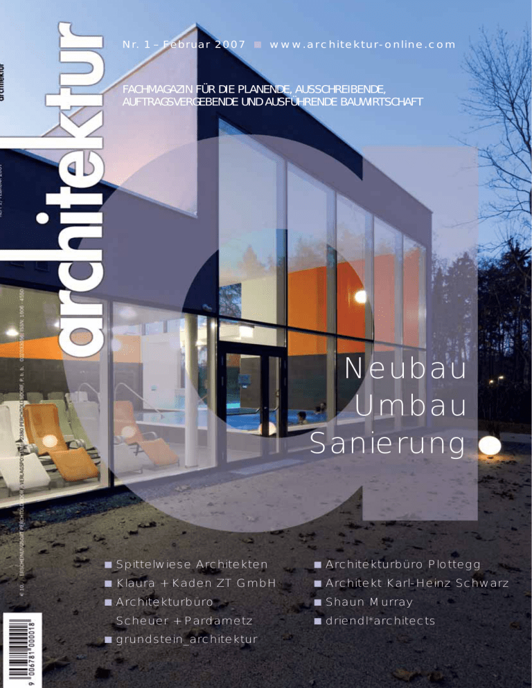 Nr. 1 – Februar 2007 ■ www.architektur-online.com FACHMAGAZIN FÜR DIE PLANENDE, AUSSCHREIBENDE, AUFTRAGSVERGEBENDE UND AUSFÜHRENDE BAUWIRTSCHAFT Neubau Umbau Sanierung ■ Spittelwiese Architekten ■ Architekturbüro Plottegg ■ Klaura + Kaden ZT GmbH ■ Architekt Karl-Heinz Schwarz ■ Architekturbüro ■ Shaun Murray Scheuer + Pardametz ■ grundstein_architektur ■ driendl*architects NEUBAU, UMBAU, SANIERUNG Badeoase Hummelhofbad / Spittelwiese Architekten / Linz Text: Astrid Meyer, Fotos: Christian Schepe inz verfügt über fünf Stadtteilbäder, die annähernd gleich groß sind und Funktionen wie Sport-, Lehr- und Kleinkinderbecken umfassen. Der Betreiber Linz AG will nun mit einem neuen Marketingkonzept die fünf Badehäuser mit der Spezialisierung auf Themenbereiche neu positionieren. L Das Hummelhofbad wurde im Jahr 1958 als Freibad für die Stadtteile Bindermichl, Spallerhof, Keferfeld und Neue Heimat errichtet. In den 70ern kam ein Hallenbad dazu, dessen Renovierung nun notwendig wurde. Im Jahr 2005 wurde ein Wettbewerb nach dem 3-Töpfe-Modell für Architekten mit Referenzen im Bäderbau, Architekten mit allgemeinen Referenzen und junge Architekten ausgeschrieben. Jeweils drei Architekten pro Kategorie wurden daraufhin eingeladen, Projekte für eine Sanierung und Erweiterung des Hummelhofbades zu einer Wellnessoase einzureichen. Spittelwiese Architekten konnten gemeinsam mit 3:0 Landschaftsarchitektur mit einem klaren Entwurf den Wettbewerb für sich entscheiden. Das bestehende Bad umschloss als gegliedertes Ensemble u-förmig den Freibadbereich. Westseitig war es begrenzt von den freistehenden Garderobetrakten, nach Süden durch einen schmalen Baukörper abgeschlossen. Der Trakt mit Kassa, Schwimmhalle und Sprungturm bildete den Schwerpunkt nach Osten zum Wald hin, der für das „Waldbad“ auch namensgebend war. Im Zuge des Umbaus blieben die Garderoben, der südliche Bauteil und die Freibecken weitgehend unverändert. Der Bauteil mit Küche, Kassa und Garderobe wurde auf seine tragenden Wände reduziert. Diesem wurde eine transparente Raumschicht vorgesetzt, womit die einst gegliederte Front eine klare Ansicht bekam. Der Schwimmhalle wurde nach Westen ebenfalls eine Zone vorgestellt und der bestehende Sprungturm in die Form integriert. Die Erweiterung des Bades schließt im Osten an die Schwimmhalle an und vervollständigt die Gebäudeform annähernd zu einem Rechteck. Die Hülle wirkt klar, gegliedert nur durch Höhenabstufungen in den Geschoßen und Einschnitte bei den westseitigen Terrassen. Das Hummelhofbad im zentrumsnahen Bindermichl ist verkehrsgünstig gelegen und über den nahen Autobahnknoten leicht erreichbar. Am 24 architektur feb.2007 Rande des Hummelhofwaldes situiert, stellt es ein Naherholungsgebiet und die grüne Lunge für die Bewohner des Viertels dar. Die Hauptzufahrt erfolgt über die südseitige Ramsauerstraße, von der man bereits am Eck des Grundstücks in die Tiefgarage gelangt. Der Freibereich vor dem Bad dient als Parkfläche und wurde von den Landschaftsarchitekten 3:0 gestaltet. Wellenzeichnungen, durch Materialwechsel zu kleinformatigen Steinen gegenüber Asphalt, stimmen den Besucher auf das bevorstehende Badeerlebnis ein. Pflanztröge in Linsenform lenken den Besucher zum Eingang, der sich als Windfang in Form einer Box von der verglasten Fassade abhebt. Eine zweigeschoßige Eingangshalle empfängt den Besucher und dient als Verteiler zwischen Freibereich, Sauna und Garderoben des Schwimmbereichs. Der Aufgang von der Tiefgarage mündet ebenfalls in die Halle. Der für das Leitkonzept verantwortliche Künstler Gerhard Müllner ließ graue Beschriftungen zur Orientierung und Kennzeichnung anbringen. Diese finden sich als Anekdoten zu den Themen Baden, Sauna und zum Hummelhofbad an vielen Stellen wieder. Die Orientierung erleichtert aber nicht zuletzt die Transparenz des Entwurfs: Eine Glaswand hinter der Kassa trennt den Wartebereich räumlich, nicht aber optisch von der dahinterliegenden Gastrozone und erlaubt Durchblicke zur anschließenden Schwimmhalle, die man durch die bestehende Garderobe erreicht. An den Längsseiten des Beckens wurde der Liegebereich nach Westen durch die vorgesetzte Raumzone erweitert; im Osten ist das neue Lehrbecken angelegt, akustisch abgetrennt durch eine Glaswand. Das Babybecken am Kopfende der Halle füllt die Nische zum angrenzenden räumlich separierten Sprungbecken aus. An der Schnittstelle zwischen Schwimmhalle, Sprungbecken und Wellness liegt die Bademeisterkoje. Über eine Schallschleuse betritt der Besucher hier den Wellnessbereich, der als Folge von einund zweigeschoßigen Räumen organisiert ist. Badezonen mit Sole- und Massagebecken, die sich über zwei Geschoße öffnen, wechseln sich mit den niedrigen privaten Liegezonen im Erdgeschoß ab. Dem Gebäude nördlich vorgelagert ist das Außenbecken, ein Gymnastikbecken fungiert als Schaltraum zum Badebereich. In Verlängerung der Erschließungsachse führt eine Treppe in die obere Ebene, welche durch die Lufträume über den Becken und eingestellte Boxen für Klang- und Duftraum sowie Massage strukturiert ist. Bequeme Sofas aus Kunststoff gruppieren sich um einen offenen Kamin, der die heimelige Atmosphäre einer Skihütte assoziieren lässt. Eine verglaste Galerie mit Wasserbar, von der man die Schwimmhalle überblickt, verbindet Wellness mit dem Wintergarten an der Westfassade. Entlang der Längsseite der Schwimmhalle führt eine weitere Galerie zum neuen gemischten Saunabereich, der an die bestehende Sauna angebunden ist. Dieser ist ein Aufenthaltsbereich mit Blick auf das Sportbecken. Dabei fällt die filigrane Tragstruktur der Hallendecke auf. Die Konstruktion aus Stahlfachwerkbindern wurde nicht nur aus ökonomischen Gründen erhalten. Trotz der starken Belastung in einem Schwimmbad durch Feuchtigkeit und Chemikalien war das Stahlfachwerk gut erhalten. Um den heutigen Normen zu entsprechen wurde die Eigenlast dank einem neuen Dachaufbau 