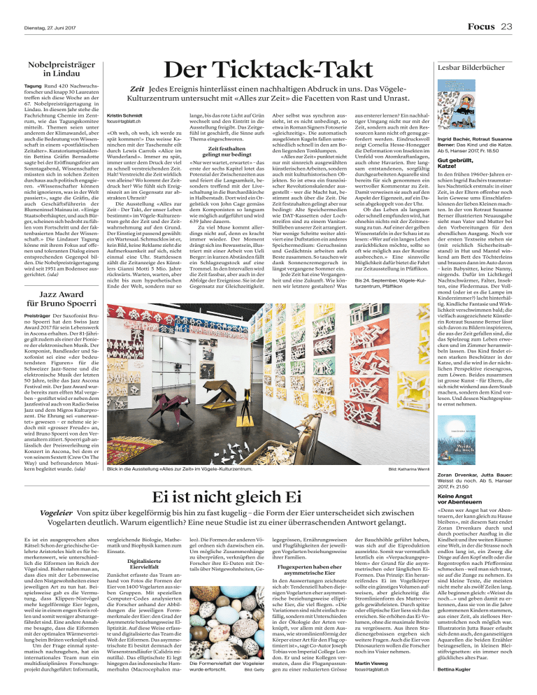 Focus 23 Dienstag, 27. Juni 2017 Der Ticktack-Takt Nobelpreisträger in Lindau Tagung Rund 420 Nachwuchs- forscher und knapp 30 Laureaten treffen sich diese Woche an der 67. Nobelpreisträgertagung in Lindau. In diesem Jahr stehe die Fachrichtung Chemie im Zentrum, wie das Tagungskomitee mitteilt. Themen seien unter anderem der Klimawandel, aber auch die Bedeutung von Wissenschaft in einem «postfaktischen Zeitalter». Kuratoriumspräsidentin Bettina Gräfin Bernadotte sagte bei der Eröffnungsfeier am Sonntagabend, Wissenschafter müssten sich in solchen Zeiten durchaus auch politisch engagieren. «Wissenschafter können nicht ignorieren, was in der Welt passiert», sagte die Gräfin, die auch Geschäftsführerin der Blumeninsel Mainau ist. «Einige Staatsoberhäupter, und auch Bürger, scheinen sich bedroht zu fühlen vom Fortschritt und der faktenbasierten Macht der Wissenschaft.» Die Lindauer Tagung könne mit ihrem Fokus auf offenen und toleranten Dialog einen entsprechenden Gegenpol bilden. Die Nobelpreisträgertagung wird seit 1951 am Bodensee ausgerichtet. (sda) Lesbar Bilderbücher Zeit Jedes Ereignis hinterlässt einen nachhaltigen Abdruck in uns. Das VögeleKulturzentrum untersucht mit «Alles zur Zeit» die Facetten von Rast und Unrast. Kristin Schmidt [email protected] «Oh weh, oh weh, ich werde zu spät kommen!» Das weisse Kaninchen mit der Taschenuhr eilt durch Lewis Carrols «Alice im Wunderland». Immer zu spät, immer unter dem Druck der viel zu schnell verstreichenden Zeit. Halt! Verstreicht die Zeit wirklich von alleine? Wo kommt der Zeitdruck her? Wie fühlt sich Ereigniszeit an im Gegensatz zur abstrakten Uhrzeit? Die Ausstellung «Alles zur Zeit – Der Takt, der unser Leben bestimmt» im Vögele-Kulturzentrum geht der Zeit und der Zeitwahrnehmung auf den Grund. Der Einstieg ist passend gewählt: ein Wartesaal. Schmucklos ist er, kein Bild, keine Reklame zieht die Aufmerksamkeit auf sich, nicht einmal eine Uhr. Stattdessen zählt die Zeitanzeige des Künstlers Gianni Motti 5 Mio. Jahre rückwärts. Warten, warten, aber nicht bis zum hypothetischen Ende der Welt, sondern nur so lange, bis das rote Licht auf Grün wechselt und den Eintritt in die Ausstellung freigibt. Das Zeitgefühl ist geschärft, die Sinne aufs Thema eingeschworen. Zeit festhalten gelingt nur bedingt «Nur wer wartet, erwartet» – das erste der sechs Kapitel lotet das Potenzial der Zwischenzeiten aus und feiert die Langsamkeit, besonders treffend mit der Liveschaltung in die Burchardikirche in Halberstadt. Dort wird ein Orgelstück von John Cage gemäss dem Komponisten so langsam wie möglich aufgeführt und wird 639 Jahre dauern. Zu viel Muse kommt allerdings nicht auf, denn es kracht immer wieder. Der Moment drängt sich ins Bewusstsein, illustriert mit einer Arbeit von Ueli Berger: in kurzen Abständen fällt ein Schlagzeugstock auf eine Trommel. In den Intervallen wird die Zeit fassbar, aber auch in der Abfolge der Ereignisse. Sie ist der Gegensatz zur Gleichzeitigkeit. Aber selbst was synchron aussieht, ist es nicht unbedingt, so etwa in Roman Signers Fotoserie «gleichzeitig». Die automatisch ausgelösten Kugeln fallen unterschiedlich schnell in den am Boden liegenden Tonklumpen. «Alles zur Zeit» punktet nicht nur mit sinnreich ausgewählten künstlerischen Arbeiten, sondern auch mit kulturhistorischen Objekten. So ist etwa ein französischer Revolutionskalender ausgestellt – wer die Macht hat, bestimmt auch über die Zeit. Die Zeit festzuhalten gelingt aber nur bedingt: Alte Speichermedien wie DAT-Kassetten oder Lochstreifen sind zu einem VanitasStillleben unserer Zeit arrangiert. Nur wenige Schritte weiter aktiviert eine Duftstation ein anderes Speichermedium: Geruchssinn und Gedächtnis arbeiten aufs Beste zusammen. So tauchen wir dank Sonnencremegeruch in längst vergangene Sommer ein. Jede Zeit hat eine Vergangenheit und eine Zukunft. Wie können wir letztere gestalten? Was aus ersterer lernen? Ein nachhaltiger Umgang nicht nur mit der Zeit, sondern auch mit den Ressourcen kann nicht oft genug gefordert werden. Eindrucksvoll zeigt Cornelia Hesse-Honegger die Deformation von Insekten im Umfeld von Atomkraftanlagen, auch ohne Havarien. Ihre langsam entstandenen, sorgfältig durchgearbeiteten Aquarelle sind bereits für sich genommen ein wertvoller Kommentar zu Zeit. Damit verweisen sie auch auf den Aspekt der Eigenzeit, auf ein Dasein abgekoppelt von der Uhr. Ob das Leben als langsam oder schnell empfunden wird, hat ohnehin nichts mit der Zeitmessung zu tun. Auf einer der gelben Wissenstafeln in der Schau ist zu lesen: «Wer auf ein langes Leben zurückblicken möchte, sollte so oft wie möglich aus der Routine ausbrechen.» Eine sinnvolle Möglichkeit dafür bietet die Fahrt zur Zeitausstellung in Pfäffikon. Bis 24. September, Vögele-Kulturzentrum, Pfäffikon Jazz Award für Bruno Spoerri Preisträger Der Saxofonist Bru- no Spoerri hat den Swiss Jazz Award 2017 für sein Lebenswerk in Ascona erhalten. Der 81-Jährige gilt zudem als einer der Pioniere der elektronischen Musik. Der Komponist, Bandleader und Saxofonist sei eine «der bedeutendsten Figuren» für die Schweizer Jazz-Szene und die elektronische Musik der letzten 50 Jahre, teilte das Jazz Ascona Festival mit. Der Jazz Award wurde bereits zum elften Mal vergeben − gestiftet wird er neben dem Jazzfestival auch von Radio Swiss Jazz und dem Migros Kulturprozent. Die Ehrung sei «unerwartet» gewesen − er nehme sie jedoch mit «grosser Freude» an, wird Bruno Spoerri von den Veranstaltern zitiert. Spoerri gab anlässlich der Preisverleihung ein Konzert in Ascona, bei dem er von seinem Sextett (Crew On The Way) und befreundeten Musikern begleitet wurde. (sda) Blick in die Ausstellung «Alles zur Zeit» im Vögele-Kulturzentrum. Digitalisierte Eiervielfalt Zunächst erfasste das Team anhand von Fotos die Formen der Eier von 1400 Vogelarten aus sieben Gruppen. Mit speziellen Computer-Codes analysierten die Forscher anha