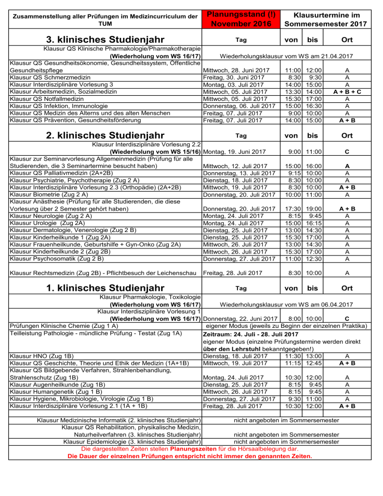 Zusammenstellung aller Prüfungen im Medizincurriculum der TUM Planungsstand (!) November 2016 3. klinisches Studienjahr Tag Klausurtermine im Sommersemester 2017 von bis Ort Klausur QS Klinische Pharmakologie/Pharmakotherapie (Wiederholung vom WS 16/17) Klausur QS Gesundheitsökonomie, Gesundheitssystem, Öffentliche Gesundheitspflege Klausur QS Schmerzmedizin Klausur Interdisziplinäre Vorlesung 3 Klausur Arbeitsmedizin, Sozialmedizin Klausur QS Notfallmedizin Klausur QS Infektion, Immunologie Klausur QS Medizin des Alterns und des alten Menschen Klausur QS Prävention, Gesundheitsförderung Mittwoch, 28. Juni 2017 Freitag, 30. Juni 2017 Montag, 03. Juli 2017 Mittwoch, 05. Juli 2017 Mittwoch, 05. Juli 2017 Donnerstag, 06. Juli 2017 Freitag, 07. Juli 2017 Freitag, 07. Juli 2017 11:00 8:30 14:00 13:30 15:30 15:00 9:00 14:00 12:00 9:30 15:00 14:00 17:00 16:30 10:00 15:00 A A A A+B+C A A A A+B 2. klinisches Studienjahr Tag von bis Ort Klausur Interdisziplinäre Vorlesung 2.2 (Wiederholung vom WS 15/16) Klausur zur Seminarvorlesung Allgemeinmedizin (Prüfung für alle Studierenden, die 3 Seminartermine besucht haben) Klausur QS Palliativmedizin (2A+2B) Klausur Psychiatrie, Psychotherapie (Zug 2 A) Klausur Interdisziplinäre Vorlesung 2.3 (Orthopädie) (2A+2B) Klausur Biometrie (Zug 2 A) Klausur Anästhesie (Prüfung für alle Studierenden, die diese Vorlesung über 2 Semester gehört haben) Klausur Neurologie (Zug 2 A) Klausur Urologie (Zug 2A) Klausur Dermatologie, Venerologie (Zug 2 B) Klausur Kinderheilkunde 1 (Zug 2A) Klausur Frauenheilkunde, Geburtshilfe + Gyn-Onko (Zug 2A) Klausur Kinderheilkunde 2 (Zug 2B) Klausur Psychosomatik (Zug 2 B) Klausur Rechtsmedizin (Zug 2B) - Pflichtbesuch der Leichenschau 1. klinisches Studienjahr Wiederholungsklausur vom WS am 21.04.2017 Montag, 19. Juni 2017 9:00 11:00 C Mittwoch, 12. Juli 2017 Donnerstag, 13. Juli 2017 Dienstag, 18. Juli 2017 Mittwoch, 19. Juli 2017 Donnerstag, 20. Juli 2017 15:00 9:15 8:30 8:30 10:00 16:00 10:00 10:00 10:00 11:00 A A A A+B A Donnerstag, 20. Juli 2017 Montag, 24. Juli 2017 Montag, 24. Juli 2017 Dienstag, 25. Juli 2017 Dienstag, 25. Juli 2017 Mittwoch, 26. Juli 2017 Mittwoch, 26. Juli 2017 Donnerstag, 27. Juli 2017 17:30 8:15 15:00 13:00 15:30 13:00 15:30 11:00 19:00 9:45 16:15 14:30 17:00 14:30 17:00 12:30 A+B A A A A A A A Freitag, 28. Juli 2017 Tag 8:30 10:00 von bis A Ort Klausur Pharmakologie, Toxikologie (Wiederholung vom WS 16/17) Wiederholungsklausur vom WS am 06.04.2017 Klausur Interdisziplinäre Vorlesung 1 C 8:00 10:00 (Wiederholung vom WS 16/17) Donnerstag, 22. Juni 2017 Prüfungen Klinische Chemie (Zug 1 A) eigener Modus (jeweils zu Beginn der einzelnen Praktika) Teilleistung Pathologie - mündliche Prüfung - Testat (Zug 1A) Zeitraum: 24. Juli - 28. Juli 2017 eigener Modus (einzelne Prüfungstermine werden direkt über den Lehrstuhl bekanntgegeben!) Klausur HNO (Zug 1B) Dienstag, 18. Juli 2017 11:30 13:00 A Klausur QS Geschichte, Theorie und Ethik der Medizin (1A+1B) Mittwoch, 19. Juli 2017 11:15 12:45 A+B Klausur QS Bildgebende Verfahren, Strahlenbehandlung, Strahlenschutz (Zug 1B) Montag, 24. Juli 2017 10:30 12:00 A Klausur Augenheilkunde (Zug 1B) Dienstag, 25. Juli 2017 8:15 9:45 A Klausur Humangenetik (Zug 1 B) Mittwoch, 26. Juli 2017 8:15 9:45 A Klausur Hygiene, Mikrobiologie, Virologie (Zug 1 B) Donnerstag, 27. Juli 2017 9:30 11:00 A Klausur Interdisziplinäre Vorlesung 2.1 (1A + 1B) Freitag, 28. Juli 2017 10:30 12:00 A+B Klausur Medizinische Informatik (2. klinisches Studienjahr) nicht angeboten im Sommersemester Klausur QS Rehabilitation, physikalische Medizin, Naturheilverfahren (3. klinisches Studienjahr) nicht angeboten im Sommersemester Klausur Epidemiologie (3. klinisches Studienjahr) nicht angeboten im Sommersemester Die dargestellten Zeiten stellen Planungszeiten für die Hörsaalbelegung dar. Die Dauer der einzelnen Prüfungen entspricht nicht immer den genannten Zeiten.