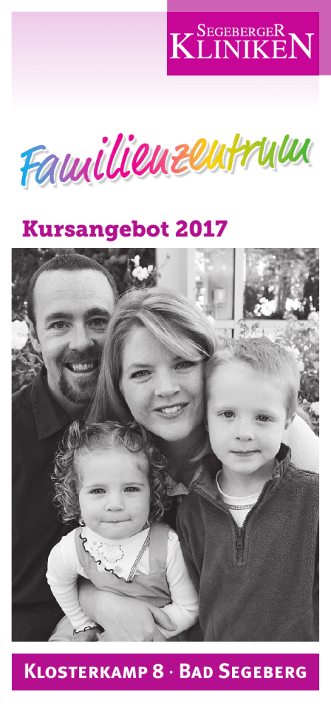Kursangebot 2017 Klosterkamp 8 · Bad Segeberg Liebe werdende Eltern und junge Familien, wir möchten Sie zu unserem neuen Kursprogramm einladen. Bei uns finden Sie zahlreiche Angebote und Informationen rund um die Themen Schwangerschaft und Geburt. Erlernen Sie z. B. Atem- und Entspannungsübungen und bereiten Sie sich – gern auch mit Ihrem Partner – körperlich und geistig auf die Geburt Ihres Kindes vor. Oder entspannen Sie sich während der Schwangerschaft bei einer ayurvedische Schwangerenmassage. Wir unterstützen Sie nach der Geburt bei der Rückbildungsgymnastik, der Säuglingspflege, der Babymassage, der Trageschule, dem Breikochkurs sowie dem Baby- und Kleinkinderschwimmen. Informieren Sie sich in unserer Hebammensprechstunde, bei den Kreißsaalführungen und tauschen Sie sich im Still-Café mit anderen aus. Wir freuen uns darauf, Sie willkommen zu heißen! Ihr Familienzentrum Stand: November 2016 Informationen und Kursangebot auch online Geburtsvorbereitung Gymnastik, Atem- und Entspannungsübungen und angeleitete Massagen sollen Ihnen und Ihrem Partner helfen, sich körperlich und geistig auf die Geburt vorzubereiten, Ängste auszuräumen und sich auf die neue Lebenssituation einzustellen. Sie erhalten Informationen zum Schwangerschafts- und Geburtsverlauf sowie zur Wochenbett- und Stillzeit. Geburtsvorbereitung für Frauen Dienstags um 17:00 oder 19:00 Uhr, ein bis zwei Partnerabende sind vorgesehen Kursgebühr: Für den Partner 12,– € pro Abend, die Kursgebühr für die Schwangere wird von der Krankenkasse getragen. Leitung: Hebammen Nicole Winter (04551 9997345), Karin Mohr (04554 4285), Sophie Neuenfeldt (04553 9959552), Janin Langenau (04551 9428530), Laura Kirch (0178 7985987) Anmeldung telefonisch bei jeweiliger Kursleitung Anmeldeschluss ist 14 Tage vor Kursbeginn Mitzubringen sind: bequeme Kleidung, warme Socken, großes Handtuch, Versichertenkarte, Kursgebühr Termine: 1. 12.01. – 23.02.2017 um 19 Uhr (N.W.) 2. 07.03. – 18.04.2017 um 17 und 19 Uhr (J.L. + S.N.) 3. 16.05. – 27.06.2017 um 17 Uhr (L.K.) 4. 05.09. – 24.10.2017 um 17 Uhr (L.K.) 5. 07.11. – 19.12.2017 um 17 Uhr (K.M.) 6. 09. 01. – 22.02.2018 um 17 Uhr (K.M.) auf www.familienzentrum-segeberg.de Geburtsvorbereitung für Paare Montags oder donnerstags von 19:00 – 21:00 Uhr, 6x2 Stunden Kursgebühr: 72,– € für Paare Leitung: Hebammen Sofia Rewert-Strasser, Susanne Kind (0173 9128485) Anmeldung telefonisch (Frau Kind) oder per Mail (beide Kursleitungen): [email protected] Mitzubringen sind: bequeme Kleidung, warme Socken, Mutterpass, Versichertenkarte, Kursgebühr Termine donnerstags: 1. 05.01. – 09.02.2017 (S.K.) 3. 18.05. – 06.07.2017 (S.K.) 6. 11.01. – 15.02.2018 (S.K.) Termine montags: 2. 03.04. – 08.05.2017 (S.R.-S.) (2x donnerstags, 20.04. + 04.05.) 4. 14.08. – 25.09.2017 (S.R.-S.) 5. 30.10. – 04.12.2017 (S.R.-S.) Geburtsvorbereitung am Vormittag Dienstags von 9:00 – 11:00 Uhr, 6x2 Stunden Individuelle Übungen und Themen nach Bedarf und Wunsch. Kursgebühr: Krankenkassenleistung Leitung:Hebammen Margret Schley (04553 1049), Susanne Götze (Kurs 2+4 sind nur für Frauen, die bereits Kinder haben, 04551 7846) Anmeldung telefonisch bei jeweiliger Kursleitung oder per Mail (bei Kursen von Frau Schley): [email protected] Mitzubringen sind: bequeme Kleidung, warme Socken, großes Handtuch Termine: 1. 10.01. – 14.02.2017 (M.S.) Anmeldeschluss 20.12.2016 2. 14.03. – 11.04.2017 (S.G.) Anmeldeschluss 24.02.2017 3. 06.06. – 11.07.2017 (M.S.) Anmeldeschluss 18.05.2017 4. 17.10. – 14.11.2017 (S.G.) Anmeldeschluss 22.09.2017 Informationen und Kursangebot auch online Geburtsvorbereitung am Wochenende Freitag von 17:00 – 20:00 Uhr, Samstag von 9:00 – 17:00 Uhr mit Mittagspause und Sonntag von 9:00 – 13:00 Uhr Unser Wochenend-Crashkurs soll Paaren die Möglichkeit bieten, sich gemeinsam intensiv und effektiv auf die Geburt und das Leben mit einem Baby vorzubereiten. Kursgebühr: 110,– € Leitung:Hebammen Heinke Hansen und Caroline Prieß Anmeldung per Mail an: [email protected] Anmeldeschluss: jeweils drei Wochen vor Kursbeginn Mitzubringen sind: bequeme Kleidung, dicke Socken, Versichertenkarte, Kursgebühr, Mutterpass und gute Laune Termine: 1. 24./25./26.02.2017 2. 25./26./27.08.2017 Wassergymnastik für Schwangere Donnerstags von 17:00 – 17:45 Uhr und 18:00 – 18:45 Uhr Im Wasser ist eine leichte, schonende und doch sehr effektive Gymnastik möglich, die Schwangerschaftsbeschwerden (wie z. B. Rückenschmerzen, Wassereinlagerungen und Gelenkbeschwerden) lindert. Entspannungsübungen am Ende der Stunde tragen zum allgemeinen Wohlbefinden bei. Ort: kleines Bewegungsbad, VITALIA Gesundheitszentrum Kursgebühr: 60,– € Leitung:Hebamme Sophie Neuenfeldt (04553 9959552) Anmeldung telefonisch oder mit Anmeldeformular zum Download auf www.bauch-gefluester.de, Anmeldeschluss ist 14 Tage vor Kursbeginn! Mitzubringen sind: übliche Badebekleidung, Handtücher, Kursgebühr zur 1. Stunde, evtl. Fön und ein 2€-Stück für den Schrank und etwas zu trinken. Termine: 1. 05.01. – 16.02.2017 (26.01. fällt aus) 3. 12.10. – 16.11.2017 2. 04.05. – 15.06.2017 (25.05. fällt aus) 4. 11.01. – 15.02.2018 auf www.familienzentrum-segeberg.de Erste Hilfe am Kind Mittwochs von 18:30 – 21:00 Uhr, 2 Abende Stellen Sie sich vor Ihr Kind verschluckt ein Stück Apfel und droht zu ersticken, stürzt vom Wickeltisch oder bekommt mitten in der Nacht Pseudokrupp. Ich nehme Ihnen die Angst, etwas falsch zu machen und bespreche die richtigen Maßnahmen und Handgriffe. Kursgebühr: 45,– €, inkl. Schulungsunterlagen, Paare zahlen zusammen 85,– € Leitung: Claudia Schimkat (04551 9081645), Fachkinderkrankenschwester Anmeldung telefonisch bei der Kursleitung oder über www.sicherheit-am-kind.de Mitzubringen sind: bequeme Kleidung, warme Socken Termine: 1.15.02./22.02.2017 3.06.09./13.09.2017 2. 31.05./07.06.2017 4. 22.11./29.11.2017 Rückbildungsgymnastik Montags von 17:00 – 
