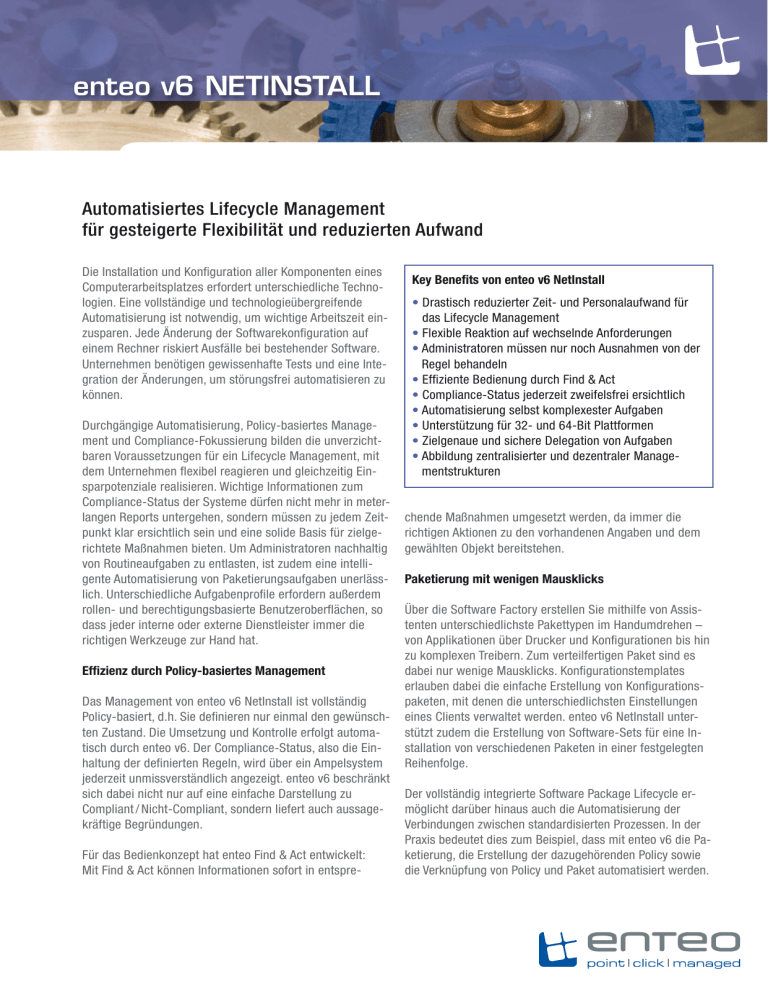 enteo v6 NETINSTALL Automatisiertes Lifecycle Management für gesteigerte Flexibilität und reduzierten Aufwand Die Installation und Konfiguration aller Komponenten eines Computerarbeitsplatzes erfordert unterschiedliche Technologien. Eine vollständige und technologieübergreifende Automatisierung ist notwendig, um wichtige Arbeitszeit einzusparen. Jede Änderung der Softwarekonfiguration auf einem Rechner riskiert Ausfälle bei bestehender Software. Unternehmen benötigen gewissenhafte Tests und eine Integration der Änderungen, um störungsfrei automatisieren zu können. Durchgängige Automatisierung, Policy-basiertes Management und Compliance-Fokussierung bilden die unverzichtbaren Voraussetzungen für ein Lifecycle Management, mit dem Unternehmen flexibel reagieren und gleichzeitig Einsparpotenziale realisieren. Wichtige Informationen zum Compliance-Status der Systeme dürfen nicht mehr in meterlangen Reports untergehen, sondern müssen zu jedem Zeitpunkt klar ersichtlich sein und eine solide Basis für zielgerichtete Maßnahmen bieten. Um Administratoren nachhaltig von Routineaufgaben zu entlasten, ist zudem eine intelligente Automatisierung von Paketierungsaufgaben unerlässlich. Unterschiedliche Aufgabenprofile erfordern außerdem rollen- und berechtigungsbasierte Benutzeroberflächen, so dass jeder interne oder externe Dienstleister immer die richtigen Werkzeuge zur Hand hat. Effizienz durch Policy-basiertes Management Das Management von enteo v6 NetInstall ist vollständig Policy-basiert, d.h. Sie definieren nur einmal den gewünschten Zustand. Die Umsetzung und Kontrolle erfolgt automatisch durch enteo v6. Der Compliance-Status, also die Einhaltung der definierten Regeln, wird über ein Ampelsystem jederzeit unmissverständlich angezeigt. enteo v6 beschränkt sich dabei nicht nur auf eine einfache Darstellung zu Compliant / Nicht-Compliant, sondern liefert auch aussagekräftige Begründungen. Für das Bedienkonzept hat enteo Find & Act entwickelt: Mit Find & Act können Informationen sofort in entspre- Key Benefits von enteo v6 NetInstall • Drastisch reduzierter Zeit- und Personalaufwand für das Lifecycle Management • Flexible Reaktion auf wechselnde Anforderungen • Administratoren müssen nur noch Ausnahmen von der Regel behandeln • Effiziente Bedienung durch Find & Act • Compliance-Status jederzeit zweifelsfrei ersichtlich • Automatisierung selbst komplexester Aufgaben • Unterstützung für 32- und 64-Bit Plattformen • Zielgenaue und sichere Delegation von Aufgaben • Abbildung zentralisierter und dezentraler Managementstrukturen chende Maßnahmen umgesetzt werden, da immer die richtigen Aktionen zu den vorhandenen Angaben und dem gewählten Objekt bereitstehen. Paketierung mit wenigen Mausklicks Über die Software Factory erstellen Sie mithilfe von Assistenten unterschiedlichste Pakettypen im Handumdrehen – von Applikationen über Drucker und Konfigurationen bis hin zu komplexen Treibern. Zum verteilfertigen Paket sind es dabei nur wenige Mausklicks. Konfigurationstemplates erlauben dabei die einfache Erstellung von Konfigurationspaketen, mit denen die unterschiedlichsten Einstellungen eines Clients verwaltet werden. enteo v6 NetInstall unterstützt zudem die Erstellung von Software-Sets für eine Installation von verschiedenen Paketen in einer festgelegten Reihenfolge. Der vollständig integrierte Software Package Lifecycle ermöglicht darüber hinaus auch die Automatisierung der Verbindungen zwischen standardisierten Prozessen. In der Praxis bedeutet dies zum Beispiel, dass mit enteo v6 die Paketierung, die Erstellung der dazugehörenden Policy sowie die Verknüpfung von Policy und Paket automatisiert werden. enteo v6 NETINSTALL Policy-basierte Zuweisung und Compliance-fokussierte Auswertung für mehr Transparenz und Effizienz Release-Management sorgt für aktuelle Endgeräte Das Release Management von enteo v6 NetInstall gewährleistet, dass alle Ihre Endgeräte stets aktuell sind. Wenn eine Software einmal freigegeben wurde, sind nachträglich keine Änderungen mehr möglich. Natürlich können aber beliebig viele Revisionen eines Software-Pakets erstellt werden. Jede Revision lässt sich mit einer von Ihnen ausgewählten Policy verknüpfen. Sobald ein Software-Paket Software Factory zur Automatisierung auch komplexer Paketierungsaufgaben Systemvoraussetzungen: Server Windows 2000 Server SP4 und höher Windows 2003 Server x64 MS SQL Server 2000 SP3 und höher MSDE 2000 SP3 und höher IIS 5.0 und höher IE 5.5 und höher Client Windows 2000 und höher Windows XP x64 Key Features • eMMC – alle enteo Lösungen in einer Oberfläche • Policy-basiertes Management • Vollständige Transparenz des Compliance-Status • Find & Act Bedienkonzept • Unterstützung für 32- und 64-Bit-Plattformen • Integrierte Software Factory und Packaging Workbench • Konfigurationstemplates für die Verwaltung von ClientEinstellungen • Abbildung von Computer bzw. Benutzerrollen bei Installation durch Software-Sets • Komponentenmodell bildet Paketabhängigkeiten ab • Revisionierung von Software-Paketen • SOAP-Schnittstelle • Remote / Offline-Unterstützung • Verteilung der Daten erfolgt bandbreitengesteuert und mit Checkpoint / Restart Technologie enteo Software Germany Alps Region Nordic Region UK and Ireland Region North America +49 711 340 190 0 +41 43 388 40 90 +46 8 555 409 40 +44 20 7397 8390 +1 847 706 9400 [email protected] [email protected] [email protected] [email protected] [email protected] Weitere Informationen finden Sie unter www.enteo.com. 00961068 / 200611 enteo v6 verfügt über integriertes Expertenwissen, mit dem die Konfiguration von Hard- und Software für Sie wesentlich vereinfacht wird. Über die Assistenten und den dialogorientierten Skripteditor der enteo v6 Packaging Workbench (rund 150 Befehle stehen zur Verfügung) werden alle notwendigen Einstellungen vorgenommen. Die richtigen Werte schreibt enteo v6 automatisch an die ents