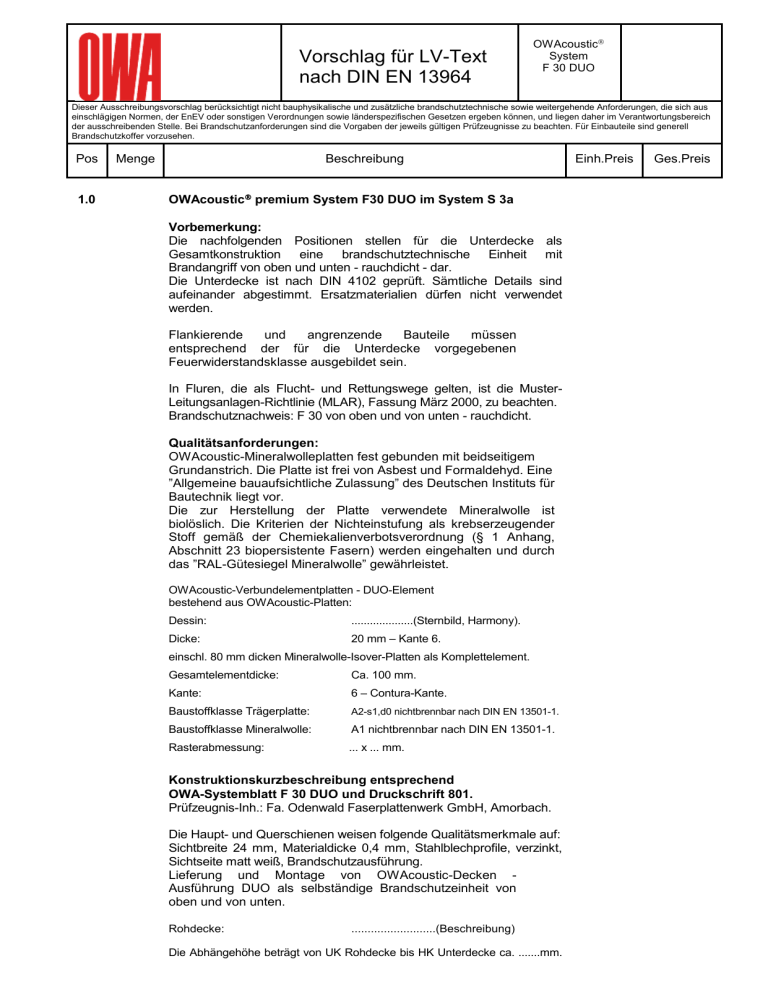 Vorschlag für LV-Text nach DIN EN 13964 OWAcoustic System F 30 DUO Dieser Ausschreibungsvorschlag berücksichtigt nicht bauphysikalische und zusätzliche brandschutztechnische sowie weitergehende Anforderungen, die sich aus einschlägigen Normen, der EnEV oder sonstigen Verordnungen sowie länderspezifischen Gesetzen ergeben können, und liegen daher im Verantwortungsbereich der ausschreibenden Stelle. Bei Brandschutzanforderungen sind die Vorgaben der jeweils gültigen Prüfzeugnisse zu beachten. Für Einbauteile sind generell Brandschutzkoffer vorzusehen. Pos 1.0 Menge Beschreibung Fehler! Textmarke nicht definiert. OWAcoustic premium System F30 DUO im definiert. System S 3a Fehler! Textmarke nicht Fehler! Textmarke nicht definiert. Vorbemerkung: Fehler! Textmarke nicht definiert. Die nachfolgenden Positionen stellen für die Unterdecke als Gesamtkonstruktion eine brandschutztechnische Einheit mit Brandangriff von oben und unten - rauchdicht - dar. Die Unterdecke ist nach DIN 4102 geprüft. Sämtliche Details sind aufeinander abgestimmt. Ersatzmaterialien dürfen nicht verwendet 19. August 2017 werden. Flankierende und angrenzende Bauteile müssen entsprechend der für die Unterdecke vorgegebenen Feuerwiderstandsklasse ausgebildet sein. In Fluren, die als Flucht- und Rettungswege gelten, ist die MusterAngebot-Nr.: Fehler! Textmarke nicht Leitungsanlagen-Richtlinie (MLAR), Fassung März 2000, zu beachten. Brandschutznachweis: Fdefiniert. 30 von oben und von unten - rauchdicht. Angebotschlagwort: Fehler! Textmarke nicht definiert. Qualitätsanforderungen: OWAcoustic-Mineralwolleplatten fest gebunden mit beidseitigem Grundanstrich. Die Platte ist frei von Asbest und Formaldehyd. Eine ”Allgemeine bauaufsichtliche Zulassung” des Deutschen Instituts für Bautechnik liegt vor. Fehler! Textmarke nicht definiert., Die zur Herstellung der Platte verwendete Mineralwolle ist biolöslich. Die Kriterienbezugnehmend der Nichteinstufung als krebserzeugender auf Ihre Anfrage vom Fehler! Stoff gemäß der Chemiekalienverbotsverordnung (§ wir 1 Anhang, Textmarke nicht definiert., für die uns Abschnitt 23 biopersistente Fasern) werden eingehalten recht herzlich bedanken, erhalten Sie inund derdurch das ”RAL-Gütesiegel Mineralwolle” gewährleistet. Anlage zu diesem Schreiben das gewünschte Angebot. OWAcoustic-Verbundelementplatten - DUO-Element bestehend aus OWAcoustic-Platten: Dessin: Bitte nehmen Sie bei Rückfragen unsere ....................(Sternbild, Harmony). Unterstützung in Anspruch. 20 mm – Kante 6. Dicke: einschl. 80 mm dicken Mineralwolle-Isover-Platten als Komplettelement. Gesamtelementdicke: Wir verbleiben M i Baustoffklasse Trägerplatte: t Kante: Baustoffklasse Mineralwolle: Ca. 100 mm. 6 – Contura-Kante. A2-s1,d0 nichtbrennbar nach DIN EN 13501-1. A1 nichtbrennbar nach DIN EN 13501-1. Rasterabmessung: ... x ... mm. f r e Konstruktionskurzbeschreibung entsprechend u DUO und Druckschrift 801. OWA-Systemblatt F 30 n Prüfzeugnis-Inh.: Fa. Odenwald Faserplattenwerk GmbH, Amorbach. d l Die Haupt- und Querschienen weisen folgende Qualitätsmerkmale auf: i Sichtbreite 24 mm, Materialdicke 0,4 mm, Stahlblechprofile, verzinkt, c Sichtseite matt weiß, Brandschutzausführung. h Lieferung und Montage von OWAcoustic-Decken Ausführung DUO als eselbständige Brandschutzeinheit von oben und von unten. m ..........................(Beschreibung) G r Die Abhängehöhe beträgtuvon UK Rohdecke bis HK Unterdecke ca. .......mm. ß Rohdecke: Einh.Preis Ges.Preis Vorschlag für LV-Text nach DIN EN 13964 OWAcoustic System F 30 DUO Dieser Ausschreibungsvorschlag berücksichtigt nicht bauphysikalische und zusätzliche brandschutztechnische sowie weitergehende Anforderungen, die sich aus einschlägigen Normen, der EnEV oder sonstigen Verordnungen sowie länderspezifischen Gesetzen ergeben können, und liegen daher im Verantwortungsbereich der ausschreibenden Stelle. Bei Brandschutzanforderungen sind die Vorgaben der jeweils gültigen Prüfzeugnisse zu beachten. Für Einbauteile sind generell Brandschutzkoffer vorzusehen. Pos Menge Beschreibung Fehler! Textmarke nicht definiert. (Es sind die Angaben des Prüfzeugnisses einzuhalten). Fehler! Textmarke nicht definiert. Fehler! Textmarke nicht definiert. Montagekurzbeschreibung: Fehler! Textmarke nicht definiert. Im Achsabstand von 625 mm sind mit Abhänger Nr. 12/125 bzw. 12/250 T-förmige Tragprofile (Nr. 45) einzubringen, auszurichten und zu nivellieren. In Querrichtung sind Verbindungsprofile (Nr. 46), Länge 625 mm einzuhängen und auszurichten. 19. August 2017 bleiben, so ist das Plattenformat Soll jede zweite Platte demontierbar 625 x 625 mm zu wählen. Es sind ca. 2,6 Stck. Abhänger pro m² erforderlich. Im max. Abstand von 750 mm sind die Abhänger anzuordnen und mit 70 mm dicken Steinwoll-Schalen (Nr. 4433) 500 mm hoch zu ummanteln und mit Rödeldraht, 2,2 mm stark zu verrödeln. Im Randbereich angeordnete können mit Angebot-Nr.:Verbindungsprofile Fehler! Textmarke nicht Wandklammern (Nr. 1499) gegen Verschieben gesichert werden. definiert. Angebotschlagwort: Fehler! Textmarke nicht Die Abhängungen sinddefiniert. nur mit bauaufsichtlich zugelassenen und brandschutzmäßig geprüften Teilen zu befestigen. Sicherheit: Befestigungs- und Tragschienenabstände nach Prüfzeugnis Fehler! Textmarke nichtsind definiert., exakt einzuhalten. Die vorgegebenen Anforderungen sind Auftragsfalle bezugnehmend aufim Ihre Anfrage vom Fehler! nachzuweisen. Textmarke nicht definiert., für die wir uns recht herzlich bedanken, erhalten Sie in der Ausführung: Anlage zu diesem Schreiben das gewünschte Material, Lieferung und abnahmefertige Montage inkl. Angebot. Gerüststellung sowie sämtliche Anpassarbeiten sind nach DIN EN 13964, DIN 4102, Vorbemerkungen, Architekturplänen, Bitte nehmensowie Sie bei Rückfragen unsere Angaben der Bauleitung den HerstellerUnterstützung in Anspruch. Verarbeitungsrichtlinien auszuführen. 1.1 Preis für abnahmefähige Leistu