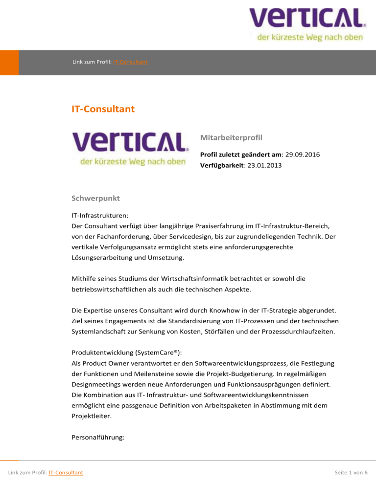 Link zum Profil: IT-Consultant IT-Consultant Mitarbeiterprofil Profil zuletzt geändert am: 29.09.2016 Verfügbarkeit: 23.01.2013 Schwerpunkt IT-Infrastrukturen: Der Consultant verfügt über langjährige Praxiserfahrung im IT-Infrastruktur-Bereich, von der Fachanforderung, über Servicedesign, bis zur zugrundeliegenden Technik. Der vertikale Verfolgungsansatz ermöglicht stets eine anforderungsgerechte Lösungserarbeitung und Umsetzung. Mithilfe seines Studiums der Wirtschaftsinformatik betrachtet er sowohl die betriebswirtschaftlichen als auch die technischen Aspekte. Die Expertise unseres Consultant wird durch Knowhow in der IT-Strategie abgerundet. Ziel seines Engagements ist die Standardisierung von IT-Prozessen und der technischen Systemlandschaft zur Senkung von Kosten, Störfällen und der Prozessdurchlaufzeiten. Produktentwicklung (SystemCare®): Als Product Owner verantwortet er den Softwareentwicklungsprozess, die Festlegung der Funktionen und Meilensteine sowie die Projekt-Budgetierung. In regelmäßigen Designmeetings werden neue Anforderungen und Funktionsausprägungen definiert. Die Kombination aus IT- Infrastruktur- und Softwareentwicklungskenntnissen ermöglicht eine passgenaue Definition von Arbeitspaketen in Abstimmung mit dem Projektleiter. Personalführung: Link zum Profil: IT-Consultant Seite 1 von 6 Link zum Profil: IT-Consultant Im Rahmen von Projekten und Beratungstätigkeiten ist eine konsequente und konstruktive Personalführung unabdingbar. Die notwendige Erfahrung entnimmt der Consultant der langjährigen Praxistätigkeit, dem Studium der Wirtschaftsinformatik und seiner Rolle als Geschäftsführer. Fundierte Fachkenntnisse im IT Bereich unterstützen ihn bei der Bewertung von Rückmeldungen der Mitarbeiter sowie beim erfolgreichen Auflösen von Eskalationen. In der Rolle als Geschäftsführer unterliegt ihm auch die disziplinarische Personalführung. In diesem Rahmen ist er für den Mitarbeiter Ein- und Austrittsprozess sowie Personalgespräche verantwortlich. Projekte 09/11- heute Kunde: Weltweit zweitgrößtes Transportunternehmen Projektinhalt: Einführung eines IT-Userboards zur proaktiven Kommunikation mit Anwendern und Fachbereichen; Strategische Entwicklung der System- und Applikationslandschaft; Produktbeschaffungs- und Perso- naleinsatzplanung, Entwicklung und Einführung einer „Unified System-Architektur“ zur Optimierung der Ressourcennutzung und verkürzen der Bereitstellungszeiten; Beratung der Softwareentwick- lungsteams bezüglich Infrastrukturschnittstellen, Authentifizierungsverfahren und Sizing; Abstimmung von Anforderungen mit den Fachbereichen. 04/10 - 09/11 Kunde: Weltweit zweitgrößtes Transportunternehmen Projektinhalt: Entwicklung der System- und Applikationslandschaft; Standardisierung der Systeme und Servicebe- reitstellungsverfahren; Beratung der Softwareentwicklung hinsichtlich Systemanforderungen und Schnittstellen zur Optimierung der späteren Inbetriebnahme; Migration der Systemlandschaft auf neue Produktgenerationen; Betriebssicherung; Dokumentation; Einführung von neuen Technologien; Umsetzung der Maßnahmen und Betriebsführung in der Systemlandschaft der DB Systel. Performanceoptimierung der MS SQL Server sowie der Applicationserver. Produktumfeld: Windows Server 2008 und 2008 R2 • File und Print • Remote Desktop Services • Remote App • Hyper-v • WDS Windows XP und 7 Lotus Notes 8.0 PTV Visum Visual Studio 2008 und 2010 Team Foundation Server 2010 SharePoint Foundation 2010 SQL Server 2008 (Heavy load) Map Info 05/11 - 07/11 Kunde: Deutschlandniederlassung eines internationalen Konzerns der Baubranche Projektinhalt: Trennung einer produktiven Systemlandschaft aus einer Konzern-IT-Struktur in eine funktional eigenständige neue Einheit; Erarbeitung eines Migrationsplans; Einbeziehung der Systemadmi- nistratoren und Aufgabenverteilung; Nahtlose Übernahme aller Client Link zum Profil: IT-Consultant Seite 2 von 6 Link zum Profil: IT-Consultant und Serversysteme sowie Trennung der Netzwerke bei gleichzeitigem Bezug von IT Services aus dem Konzernnetzwerk Produktumfeld: Windows Server 2003 und 2008 R2 • Microsoft Active Directory • File- und Printserver MS Exchange Server 2007 Cisco ASA Firewall A/P Cluster Cisco Catalyst Switching Infrastructure Umgebungsinformationen: Microsoft Active Directory; Exchange Cluster; Fileserver; Business-Anwendungen; Cisco Catalyst Infrastructure; Cisco ASA Firewall Cluster Am Standort und im neuen Netz: 7 Server; 150 Clients 03/11 - 05/11 Kunde: Deutschlandweites Unternehmen in der Automobilindustrie Projektinhalt: Durchführung eines Outsourcings der IT-Betriebsführung, des IT-Projektwesens und des IT- Managements; IST-Aufnahme, Identifikation der gelieferten IT-Services, aufweisen kritischer Pfade, Dokumentation der Systemlandschaft für die ITBetriebsführung; Bereitstellung, Betreib und Monitoring einer 3 Tier Business-CriticalApplication Produktumfeld: Windows Server 2003 und 2008 R2 • Microsoft Active Directory • Fileserver mit DFS und Printserver • Terminalserver mit RoundRobin • Application Server-Pool MS SQL Server 2008 MS Exchange Server 2007 MS ISA Server 2006 Umgebungsinformationen: Globales RZ: 150 Server; Lokales RZ: 35 Server; 5 Standorte mit ca. 300 Clients 02/10 Kunde: Internationaler Konzern Projektinhalt: Netzwerk Site Survey - Erfassung der Netzwerkkomponenten, Infrastrukturlayout und Doku- mentation der Glasfaserverkabelung für ein Redesign der gesamten Netzwerkinfrastruktur. Backend: 7000er Serie Distribution: Cisco Catalyst 6000er Access Level: Cisco Catalyst 3000er und 4000er Serie Umgebungsinformationen: ca. 6000 Netzwerkports 01/10 – 02/10 Kunde: Beratungsunternehmen im Bereich Financial Services Softskills: Projektplanung, Zeitplanung und Arbeitspakete erstellen, Teamleitung, Serveradministration Produktumfeld und Aufgaben: Servermigration von MS Windows Server 2003 auf MS Windows Server 2008 und 2008 R2. Migration von Exchange 2003 auf 20