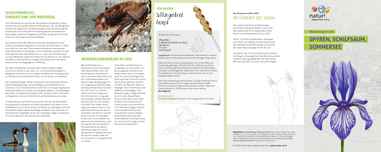 FÜR KINDER SCHILFRÖHRICHT, KINDERSTUBE DER RIEDVÖGEL Schlangenbrot Rezept Vom Technikum bis zum Kloster Wurmsbach und darüber hinaus dehnen sich am Seeufer weite Schilffelder aus. Sie sind Brutgebiet zahlreicher Vogelarten. Am Obersee gibt es bei der Mündung des Linthkanals und im Nuoler Riet weitere grössere Uferröhrichte. Das längste zusammenhängende Schilfufer am ganzen Zürichsee finden wir im Frauenwinkel bei Pfäffikon. Zutaten für 6 Personen: Am äusseren Rand des Röhrichts baut der Haubentaucher auf dichter Unterwasservegetation sein schwimmendes Nest. Es hebt und senkt sich mit den Frühsommerhochwassern während der Schneeschmelze in den Bergen. Ganz traumhaft anzusehen ist das Paarungsritual der Haubentaucher Abb. 6 . Auch der Höckerschwan und das Blässhuhn legen im Schilfsaum ihre Nester an. Sie scheuen die Nähe zu den Menschen weniger und brüten auch mal direkt neben einem viel begangenen Schiffsteg. 8 WASSERFLEDERMÄUSE IM LIDO Wasserfledermäuse Abb. 8 bewohnen im Sommerhalbjahr meist Baumhöhlen. Doch die Bootshalle im Lido bietet mit ihrem speziellen Mikroklima und der unmittelbaren Nähe zum Wasser ideale Bedingungen für eine sogenannte Wochenstube. Die Wasserfledermäuse wohnen hier also nicht nur, sondern ziehen auch ihre Jungen auf. Am Zürichsee sind nur gerade eine Handvoll solcher Kolonien bekannt. Jene im Lido umfasst rund 200 Tiere. Neben ihnen hegt eine weitere Tierart in der Halle ihren Nachwuchs: Rauchschwalben, die sonst in unseren Breiten fast nur in Kuhställen brüten. Doch hier schätzen sie, genau wie die Fledermäuse, den reich gedeckten Insektentisch. Die Spannweite der Wasserfledermaus liegt mit rund 27 Zentimeter nur wenig unter jener der Rauchschwalbe, aber mit zehn Gramm ist sie lediglich halb so schwer. Die alten Schilfhalme, die über Jahre stehen bleiben, bilden ein dichtes Gerüst, in das Teich- Abb. 7 und Drosselrohrsänger ihr Wiegennest flechten. Im Juni singen die Männchen fast pausenlos unsichtbar aus dem Röhricht heraus, um ihr Revier zu markieren. Der Sumpfrohrsänger wählt als Brutplatz eher Brennnesselfluren oder Himbeergestrüpp, die landseitig an das Schilfröhricht anschliessen. Auch die Rohrammer nistet hier in krautiger Vegetation, nahe beim Boden und durch überhängende Blätter vor Greifvögeln geschützt. Zwergdommel, Wasserralle und Rohrschwirl sind weitere Vogelarten, die das Schilfröhricht als Brutlebensraum nutzen. Im Spätsommer und Herbst versammeln sich bei der Abenddämmerung jeweils hunderte von Rauchschwalben und Staren in den Schilffeldern, um in deren Schutz die Nacht zu verbringen. Auch die Baumfalken haben dieses Nachtlager entdeckt und versuchen, in akrobatischen Jagdflügen einen der unzähligen Vögel zu erbeuten. Es ist ein optisches und akustisches Spektakel! Unser Bild von Fledermäusen ist geprägt von Vorurteilen, von Blut saugenden Vampiren und Fledertieren, die sich im langen Haar der Frauen verfangen und ihnen den Kopf verwirren. Solche Geschichten gehören natürlich ins Reich der Märchen. Wahr ist hingegen, dass Fledermäuse sehr effektive Insektenjäger sind: Beobachtungen zufolge erbeutet eine einzelne Wasserfledermaus in einer Nacht rund 2000 Insekten. Eine Kolonie mit 50 Tieren bringt es in einem Monat auf 3 Millionen Fliegen, Mücken und Schnaken! Die Tiere der Lido-Kolonie fressen übrigens jeden Abend zuerst die Wasseroberflächen in der Bootshalle leer, bevor sie ihre Jagd auf dem See draussen fortsetzen. 400 g Mehl ½ Würfel Frischhefe (ca. 20 g) 2 dl Wasser 1 TL Salz 3 EL Olivenöl Supplement: Frische Kräuter, Reibkäse, Speckwürfeli, Trockenfrüchte oder Schokoladenstreusel in den fertigen Teig kneten. Mehl und Salz in eine Schüssel geben und in der Mitte eine Vertiefung anbringen. Die Hefe mit 0.5 dl Wasser anrühren und in die Mulde giessen. Restliches Wasser und Öl beifügen und alles zu einem glatten Teig kneten. Die Schüssel mit einem Tuch bedecken und den Teig an einem warmen Ort um das Doppelte gehen lassen. Pius Rickenmann (1895–1987) IM STAMPF BEI JONA Hier jubelt sommerliches Badetreiben Im Schattenschlag der Bäume und im See; Das Leben pulst durch urgesunde Leiber, Braun von der Nasenspitze bis zur Zeh’. Seitan, im hohen Doppeldamm verborgen, Geht dünn und träg des Flusses letzter Lauf; Sein Wandern durch die Heimat ist am Ende, Der weite Wasserspiegel nimmt ihn auf. Und keiner, der in Flut und Glast sich tummelt, Und mag er schweigend auf der Böschung stehen, Gewahrt, das Aug’ geblendet von der Freude, Wie nah auch hier sich Sein sind und Vergehn. Den Teig nochmals gut durchkneten, in 6 gleichmässige Stücke schneiden, diese zu 20 cm langen daumendicken Rollen formen und um noch grüne Haselstecken wickeln. Über dem Feuer während ca. 20 Minuten schön braun backen. Bon Appetit! Als Alternative: Fertig-Pizzateig (als Klumpen, nicht ausgewallt) verwenden Impressum Projektleitung, Inhalt und Texte: Verein Natur Rapperswil-Jona, [email protected], www.natur-rj.ch Fotos: Jean-Marc Obrecht (Abb. Editorial, 1–4), Stefan Ineichen (Abb. 5), Andi Hofstetter (Abb. 6, 7), René Güttinger (Abb. 8) Karte: Reproduziert mit Bewilligung von swisstopo (BA160248) Layout und Illustrationen: Nadine Colin, illustrat.ch © 2016 Verein Natur Rapperswil-Jona, www.natur-rj.ch 6 7 Wanderung im Juni SPYREN, SCHILFSAUM, SOMMERSEE ren, wie sie hier heissen, durch eine grosse Lücke am Zeltrand ein und drehen zwei Runden im überdachten Hof, bevor sie ihren Nistplatz ansteuern. 1 2 8 3 4 5 7 Sitzbank Rastplatz 6 Einkehrmöglichkeit ÖV-Anschluss Die Altstadt ist ein einziges Blühen und Schwärmen. Im Schilfröhricht am Seeufer ziehen unzählige Vögel ihre Jungen auf. Ihr vielstimmiges Konzert ist im Morgengrauen am eindrücklichsten. An allen Orten gibt es überquellendes Leben. In der heissen Mittagssonne kehrt Ruhe ein, und wir finden lauschige Plätzchen am See. Gegen Abend setzt das Vogelgezwitscher wieder ein, und auch nach dem späten Eindunkeln sind gewiss