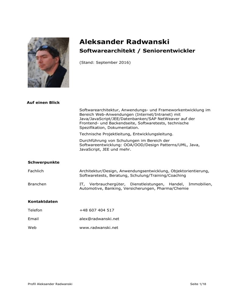 Aleksander Radwanski Softwarearchitekt / Seniorentwickler (Stand: September 2016) Auf einen Blick Softwarearchitektur, Anwendungs- und Frameworkentwicklung im Bereich Web-Anwendungen (Internet/Intranet) mit Java/JavaScript/JEE/Datenbanken/SAP NetWeaver auf der Frontend- und Backendseite, Softwaretests, technische Spezifikation, Dokumentation. Technische Projektleitung, Entwicklungsleitung. Durchführung von Schulungen im Bereich der Softwareentwicklung: OOA/OOD/Design Patterns/UML, Java, JavaScript, JEE und mehr. Schwerpunkte Fachlich Architektur/Design, Anwendungsentwicklung, Objektorientierung, Softwaretests, Beratung, Schulung/Training/Coaching Branchen IT, Verbrauchergüter, Dienstleistungen, Handel, Immobilien, Automotive, Banking, Versicherungen, Pharma/Chemie Kontaktdaten Telefon +48 607 404 517 Email [email protected] Web www.radwanski.net Profil Aleksander Radwanski Seite 1/18 Zur Person Geburtsjahr 1968 Staatsbürgerschaft Deutsch, Polnisch EDV-Erfahrung seit 1993 Sprachen Deutsch Fließend Englisch Fließend Polnisch Muttersprache Russisch Grundkenntnisse Ausbildung 1982 - 1986 Gymnasium in Gleiwitz, Polen 1986 - 1987 Studium der Informatik an der TH Gleiwitz, Polen 1989 - 1990 Gymnasium in Göttingen 1990 - 1993 Studium der Informatik an der TH Karlsruhe Sonstiges 2005 Profil Aleksander Radwanski Kurs im Bereich der Qualitätssicherung in der Softwareentwicklung „SAP Sigma“, SAP AG in Walldorf Seite 2/18 IT Kompetenz Projektmanagement Technische Projektleitung, Entwicklungsleitung Programmiersprachen, Technologien, Software & Tools Java: SAP: Web: UML: Sonst.: SE/JEE (JSP/JSF/Servlet/EJB/JPA/JMS), Eclipse, Tomcat, WebLogic, JBoss, WebSphere, Hibernate, EclipseLink, JUnit, Groovy, Ant, IntelliJ IDEA, NetBeans SAP NetWeaver Portal 7.01-7.3, UWL, MAP, NWDS, WebDynpro/Java, JCo/RFC/ARFC2, PCD, WPC, KM HTML/CSS, JavaScript, jQuery, Ajax, JSON, XML/XSLT/Xpath, Sencha Ext JS, WebServices mit SOAP/REST, OData, WebStorm OO-Patterns, MS Visio, Star UML, Archimetric SQL, ABAP, C/C++, Perl, PHP, Agile, Jenkins, Maven, SVN, Subversion, Perforce, MS Project Security: PKI, SAML 2.0 Cloud: Amazon Web Services (AWS) Datenbanken SAP MaxDB, MySQL, Oracle, MS Access Betriebssysteme MS Windows, Linux Methoden Agile/SCRUM, Continuous Integration Profil Aleksander Radwanski Seite 3/18 Projekthistorie 04/2016 – 09/2016 Hersteller von Verbauchergütern, Lausanne, Schweiz Rolle: Berater, Architekt, Senior-Entwickler Projektbeschreibung: Das Projekt umfasste den Ausbau einer komplexen und heterogenen E-Commerce-Lösung für den Verkauf von Verbrauchergüttern sowie im Bereich des CustomerCare. Tätigkeiten: Beratung des Architecture Kunden im Bereich Beratung des Kunden Entwicklungsprozesse & DevOps Entwurf und Entwicklung einer Webanwendung zur Replikation der Produktdatenbank (installiert auf Elastic Beanstalk von AWS), darunter: im der Solution- Bereich der o Anbindung an die zentrale Produktdatenbank (selbsentwickelte Java-Schnittstelle zu bereits existierenden OData-Services/JSON) o Anbindung an die MySQL Datenbank JPA/EclipseLink (RDS-Service von AWS) o Geschäftslogik mit Java, Quartz Scheduler o Web-API mit REST (Jersey) o Benutzerschnittstelle mit Bootstrap, JQuery, Ajax o Unittests mit JUnit HTML, Erstellung der technischen Spezifikation Erstellung des Benutzerhandbuchs mittels JavaScript, Skills: Java 8, JEE/Tomcat 8, JavaScript, Bootstrap, JQuery, Ajax, MySQL, SQL, JSON, UML, AWS (Elastic Beanstalk, RDS, EC2), GIT, JIRA Profil Aleksander Radwanski Seite 4/18 07/2015 – 03/2016 Pharma/Chemie, Leverkusen, Deutschland Rolle: Berater, Architekt, Senior-Entwickler Projektbeschreibung: Im Rahmen des Projektes sollte eine neue Webanwendung zur Unterstützung des kundeninternen (Teilkonzerne) Austausches von chemieschen Substanzen entwickelt werden. Tätigkeiten: Analyse und technisches Design, darunter: o Entwicklung der Architektur der Anwendung o OOA/OOD o Technisches Design der Benutzerschnittstellen Entwicklung der folgenden Module: o Anbindung an die Oracle Datenbank (PL/SQL) mittels JDBC o Geschäftslogik mit Java/Spring o Benutzerschnittstellen mit Java, JavaScript, JQuery, JSF (MyFaces/Richfaces), Ajax o Unittests mit JUnit Erstellung der technischen Spezifikation (UML) Skills: Java 8, Tomcat, JSF 2 (MyFaces, Richfaces), JavaScript, JQuery, Ajax, Spring, Oracle, JDBC, SQL, XML, FOP, JUnit, Jenkins, UML Profil Aleksander Radwanski Seite 5/18 05/2015 – 12/2015 Pharma/Chemie, Leverkusen, Deutschland Rolle: Berater, Businessanalyst, Architekt Projektbeschreibung: Im Rahmen des Projektes sollte eine neue Webanwendung zur Unterstützung des Genehmigungsprozesses (Workflow) zur Auslieferung von chemieschen Substanzen entwickelt werden. Diese Anwendung sollte eine bestehende Lotus-Notes basierte Anwendung ablösen. Tätigkeiten: Businessanalyse: o Aufnahme der Endbenutzern) o Analyse und Abschätzung (Aufwand/Komplexität) von Anforderungen o Erstellung der funktionalen Spezifikation Analyse und darunter: Anforderungen technisches Design (Interviews der mit Gesamtlösung, o Entwicklung der Architektur der Anwendung o Design des Datenbankmodels o OOA/OOD o Technisches Design der Benutzerschnittstellen o Design der Integrationsschnittstellen zu anderen Systemen Entwicklung eines Prototyps (UI mit Sencha EXT JS) Erstellung von technischen Spezifikationen (UML) Unterstützung und Berartung des Entwicklungsteams (Off-shore, Indien) während der Entwickungphase hinsichtlich der funktionalen sowie technischen Aspekte Durchführung von Code-Reviews Qualitätssicherungsmaßnahmen im Rahmen der Skills: Java 8, Tomcat, JSF 2 (MyFaces, Richfaces), JavaScript, JQuery, Sencha Ext JS, Ajax, Spring, Oracle, JDBC, SQL, XML, FOP, JUnit, Jenkins, UML Profil Aleksander Radwanski Seite 6/18 05/2014 – 04/2015 Automotive, Ingolstadt, Deutschland Rolle: Berater/Senior-Entwickler für WebServices Projektbeschreibung: Im Rahmen des Projektes sollte eine Reihe von SOAP/REST basierten WebServices für Mobile-Apps 